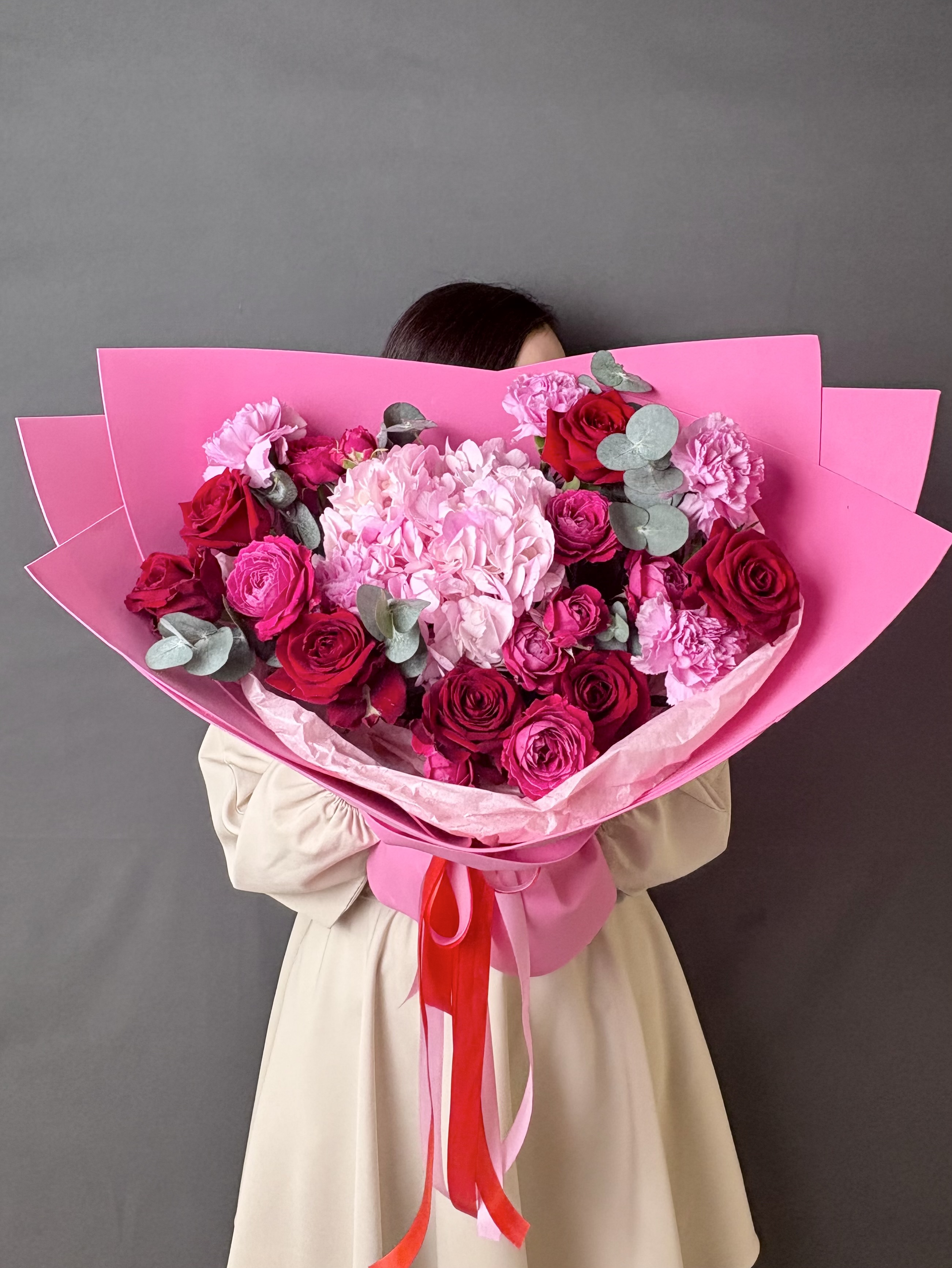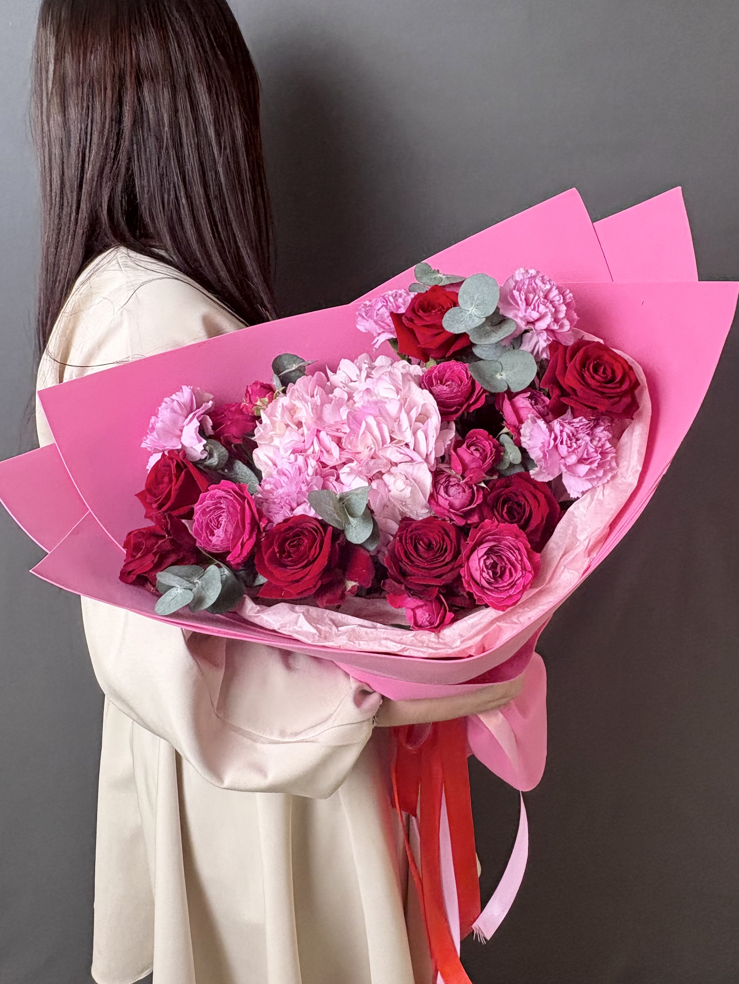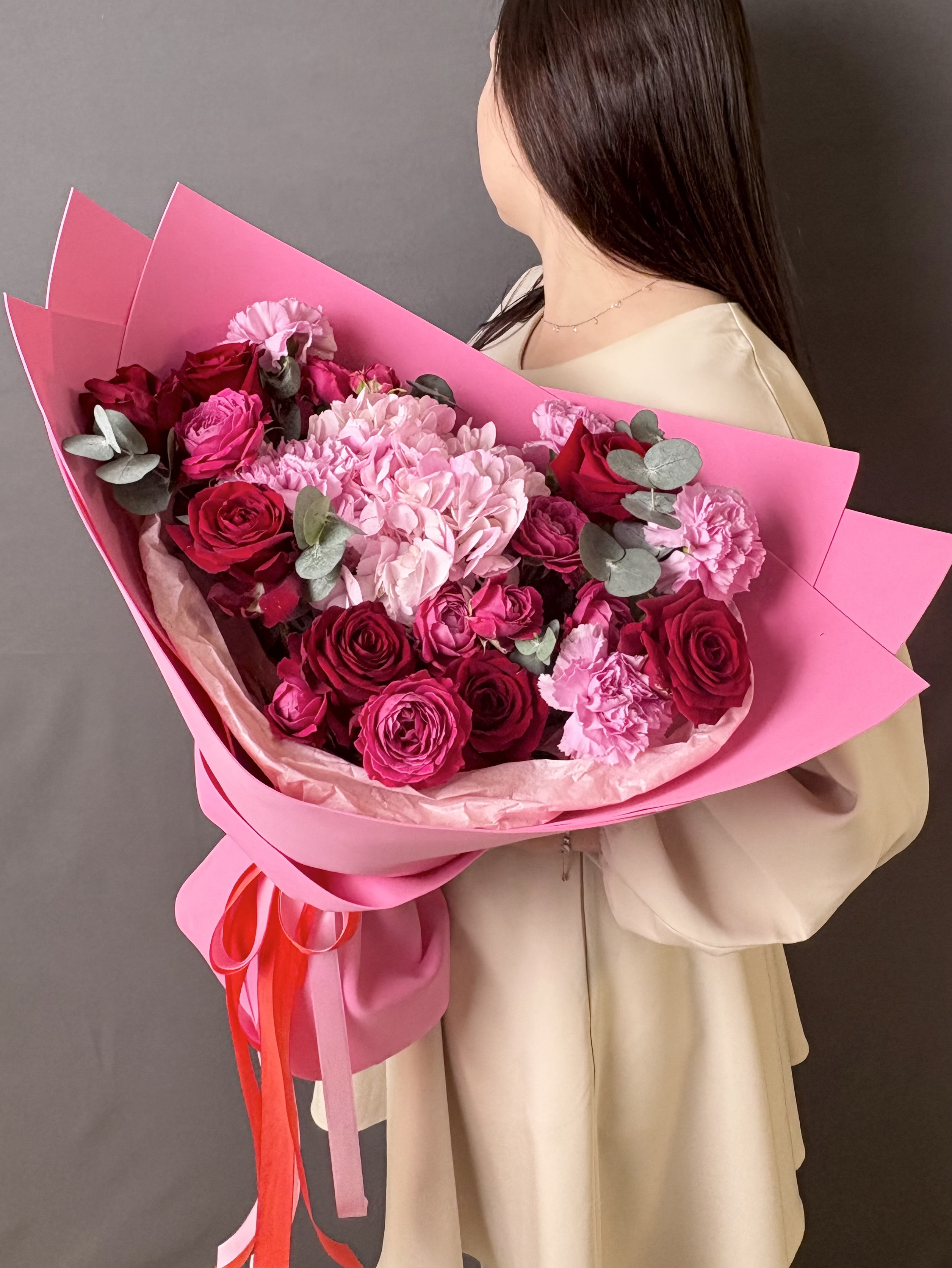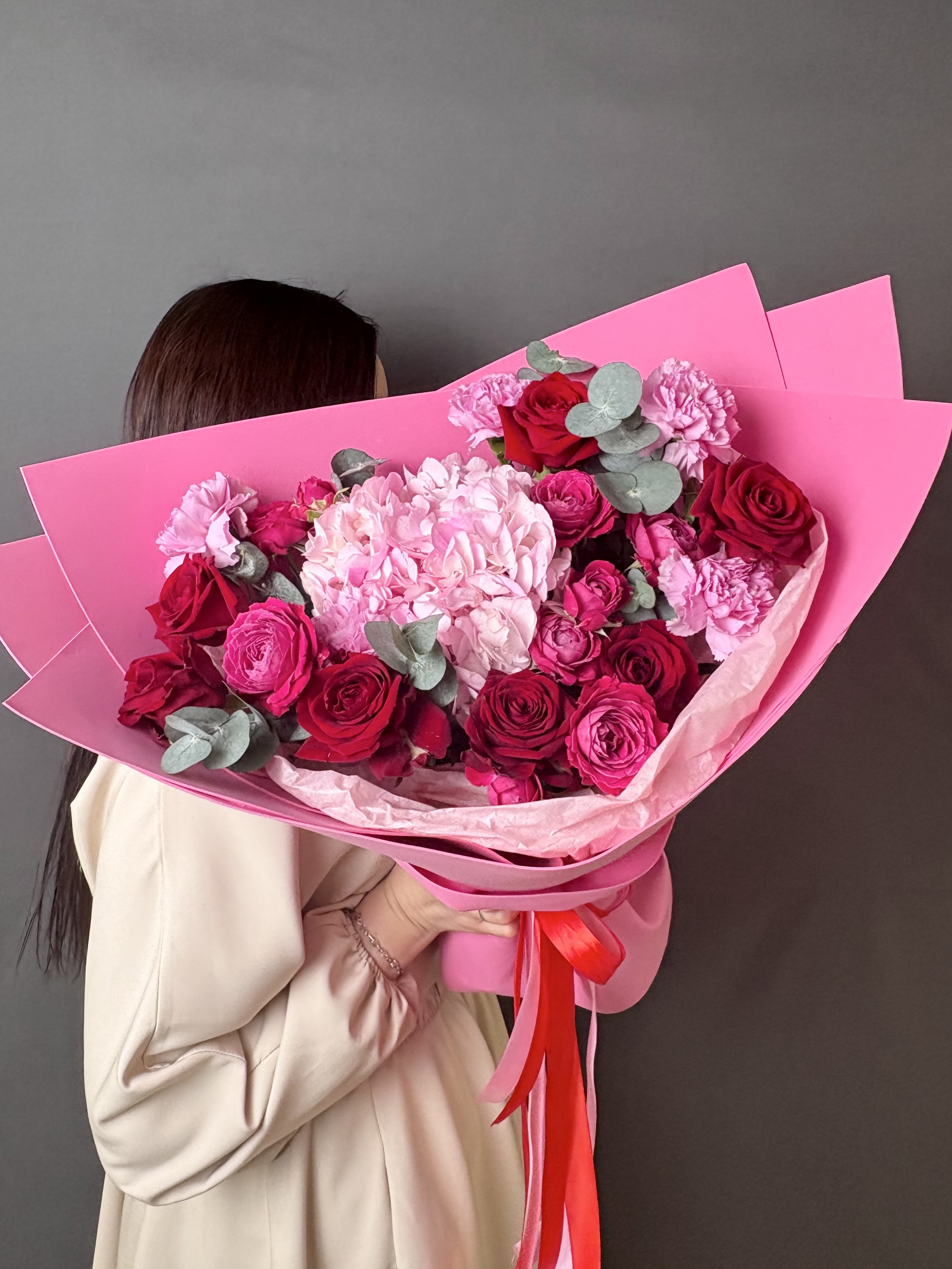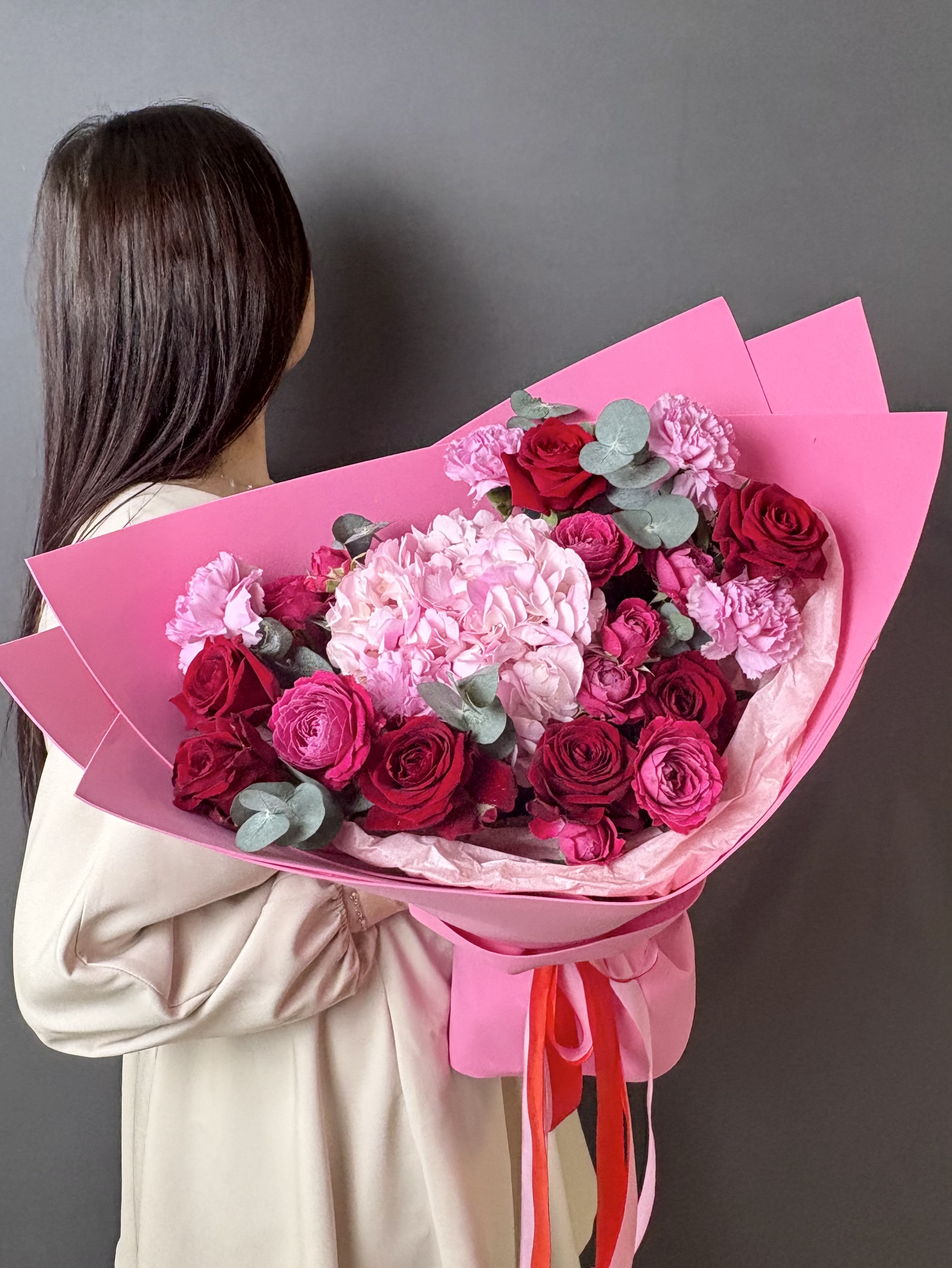 В сердце этого шедевра – нежная розовая гортензия, словно облако, окутывающее букет своей воздушной красотой. Ее пышные соцветия символизируют искренность и благодарность, добавляя композиции мягкости и романтики.