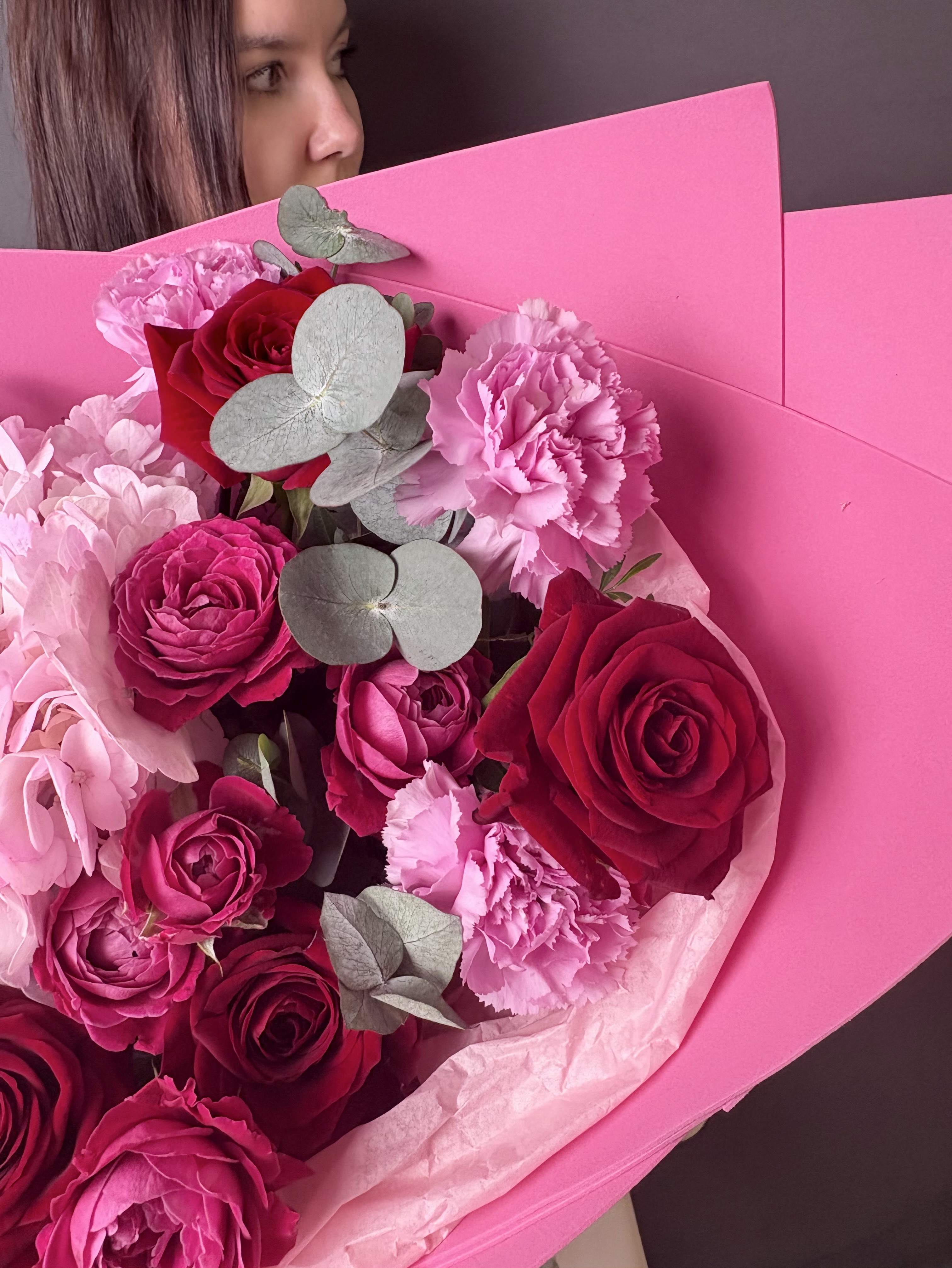 Дополняют эту гармоничную картину розовые дианусы, чьи резные лепестки добавляют букету игривости и легкости. Они словно маленькие звездочки, мерцающие среди более крупных цветов, привнося в композицию нотку свежести и очарования.