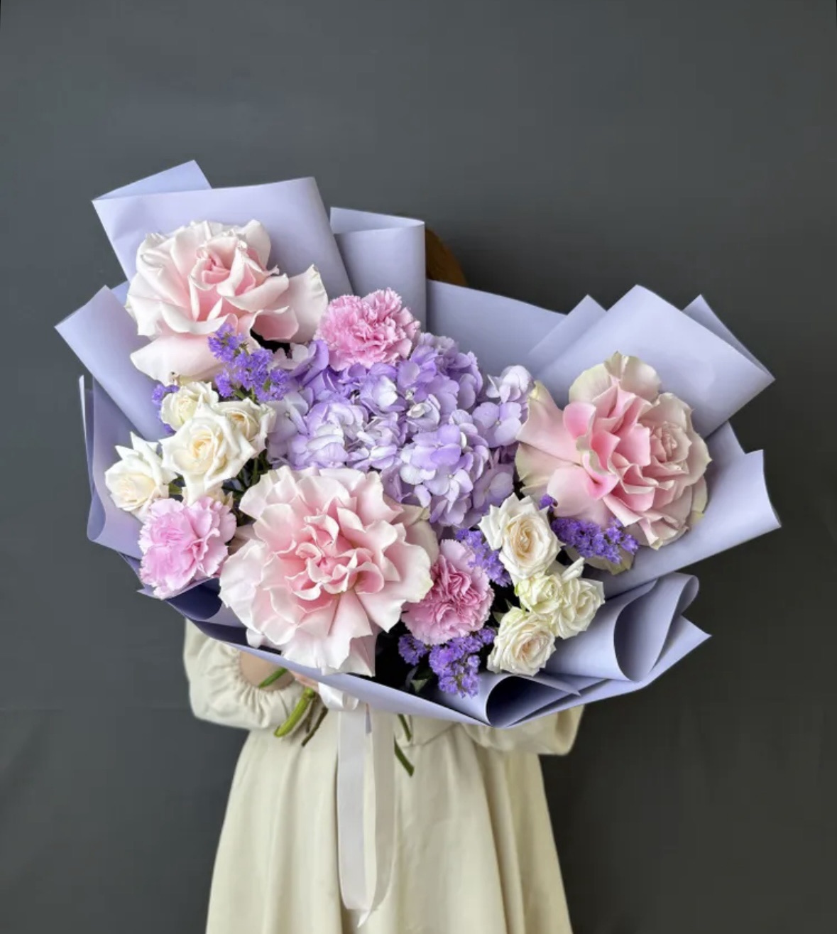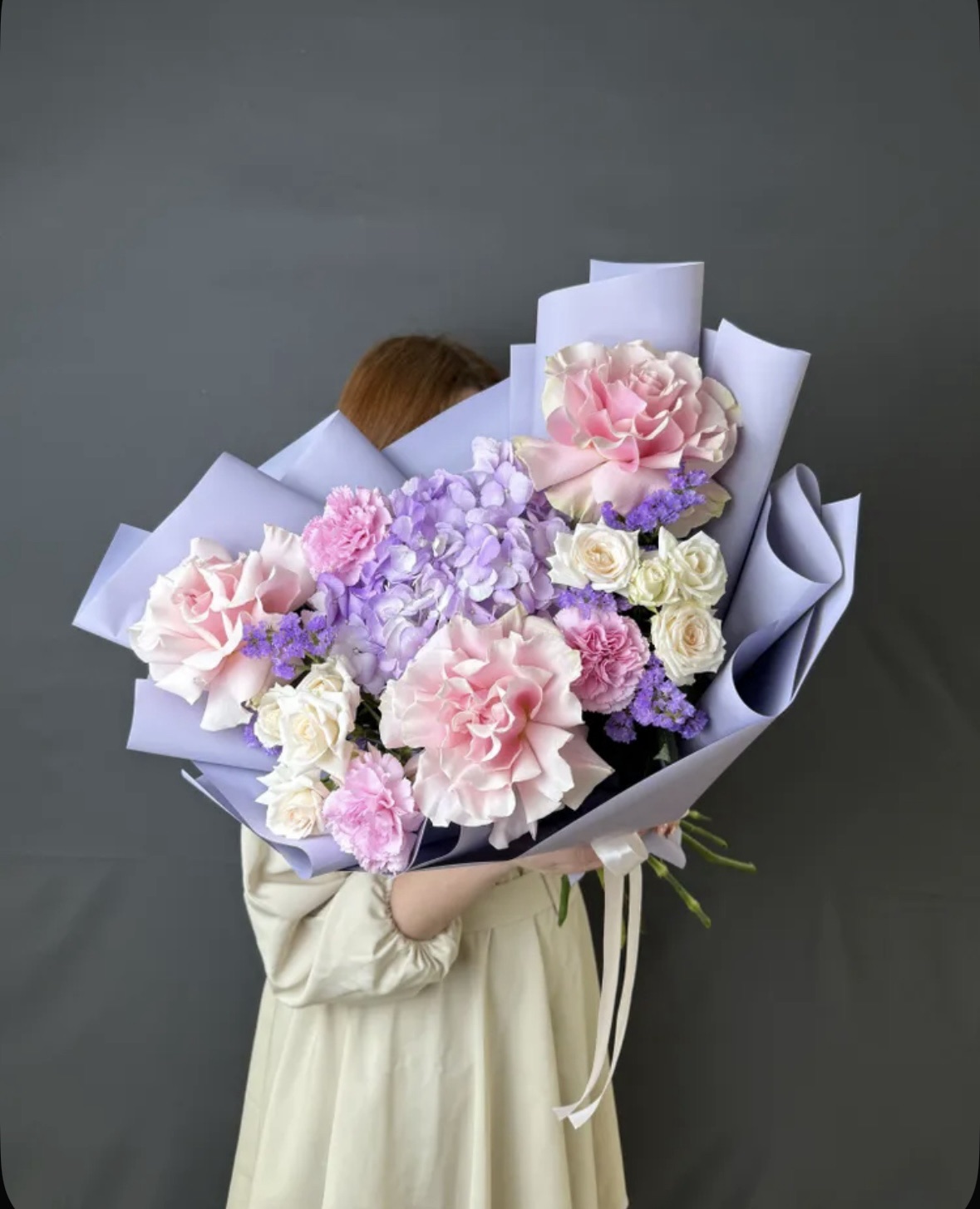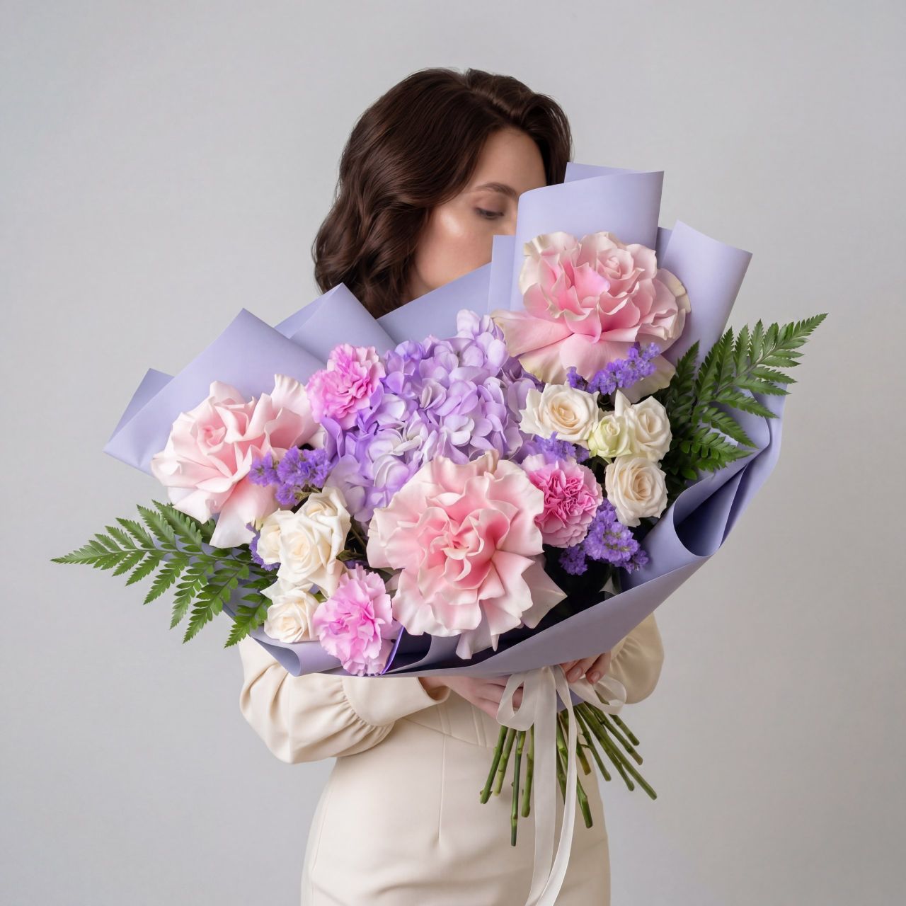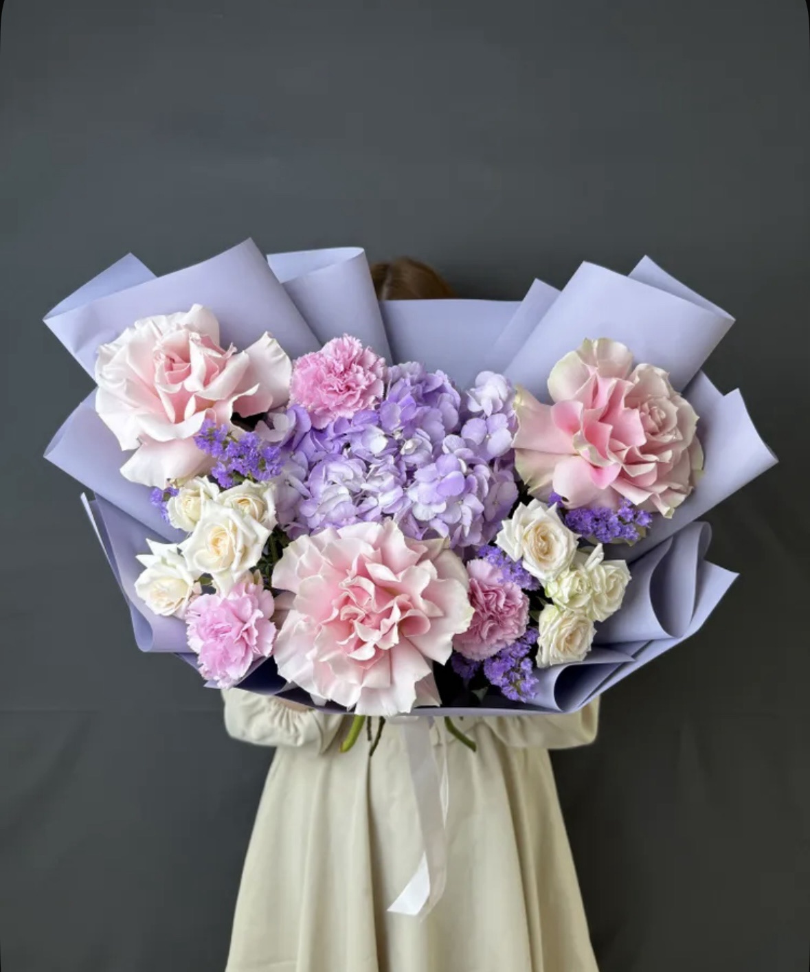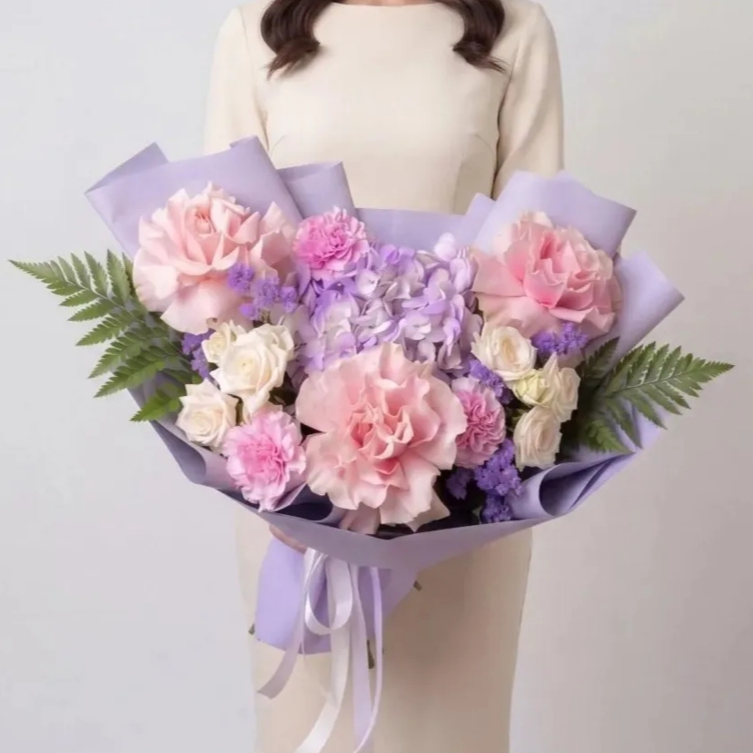 Авторский букет «Лавандовый мир» – это нежное прикосновение природы, воплощенное в изысканной композиции. В нем гармонично сочетаются воздушная лавандовая гортензия, утонченные розовые французские розы и очаровательные диантусы. Дополняют эту палитру кремовые кустовые розы, добавляя мягкости, и лавандовая статица, придающая букету легкость и неповторимый аромат. Идеальный выбор для тех, кто ценит утонченность и природную красоту.