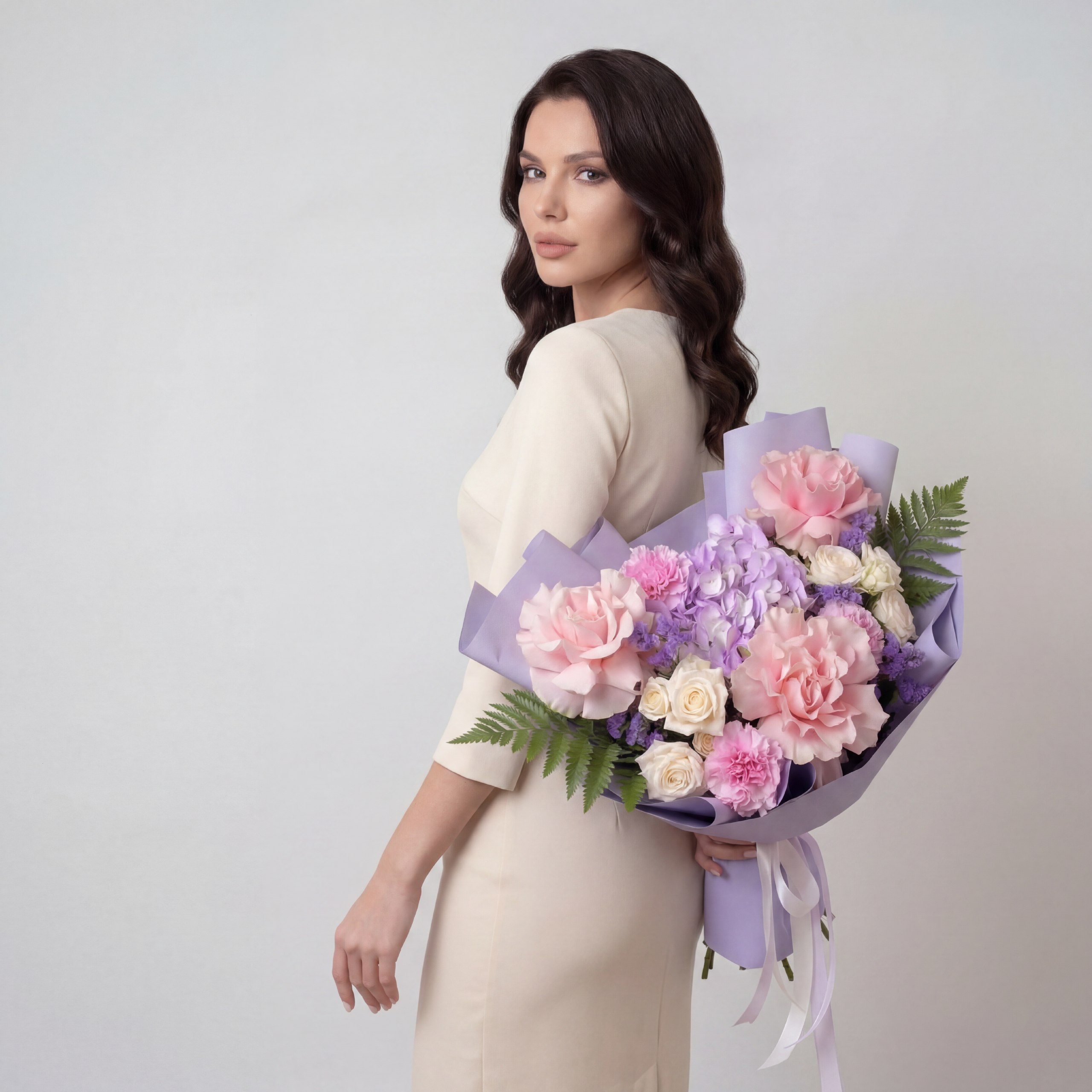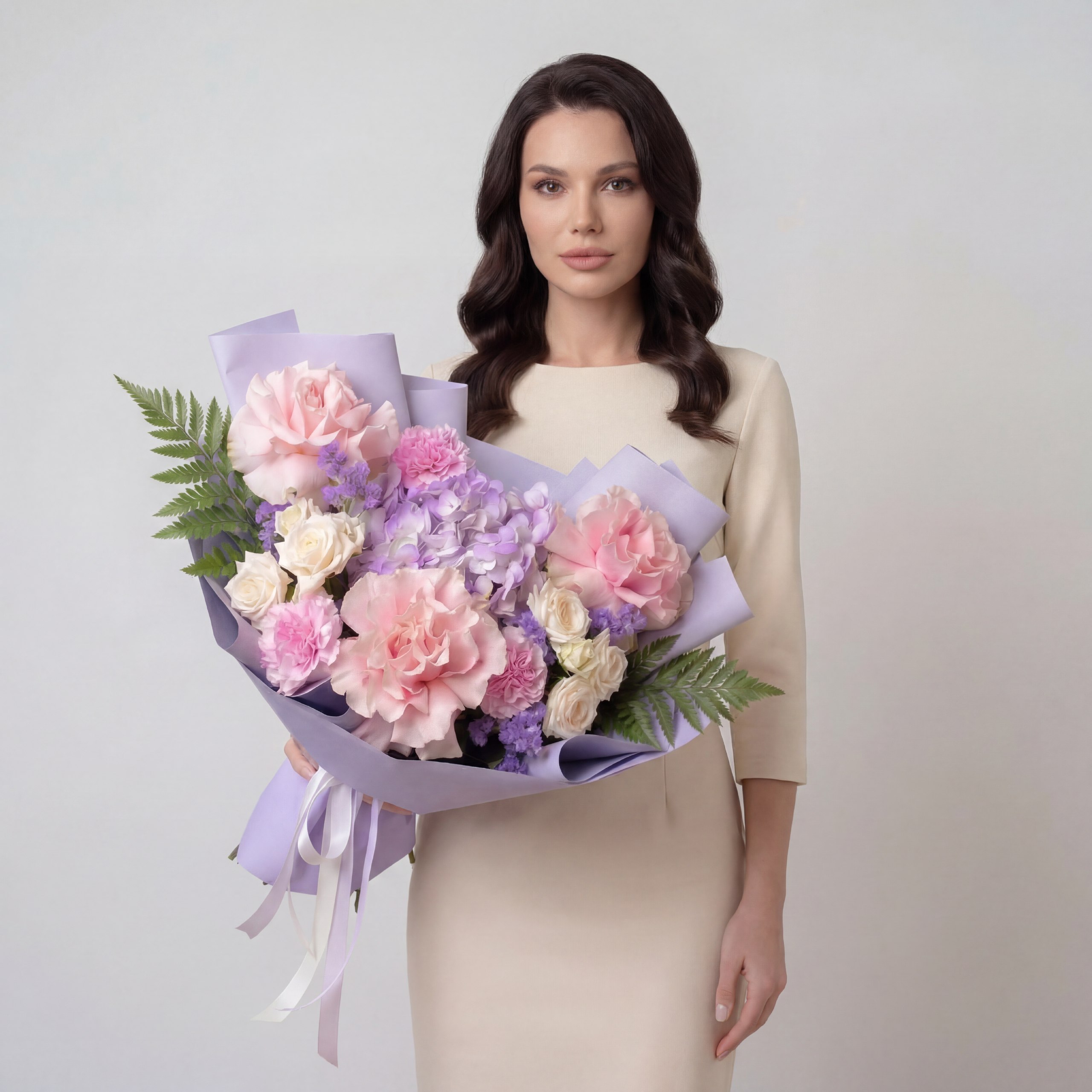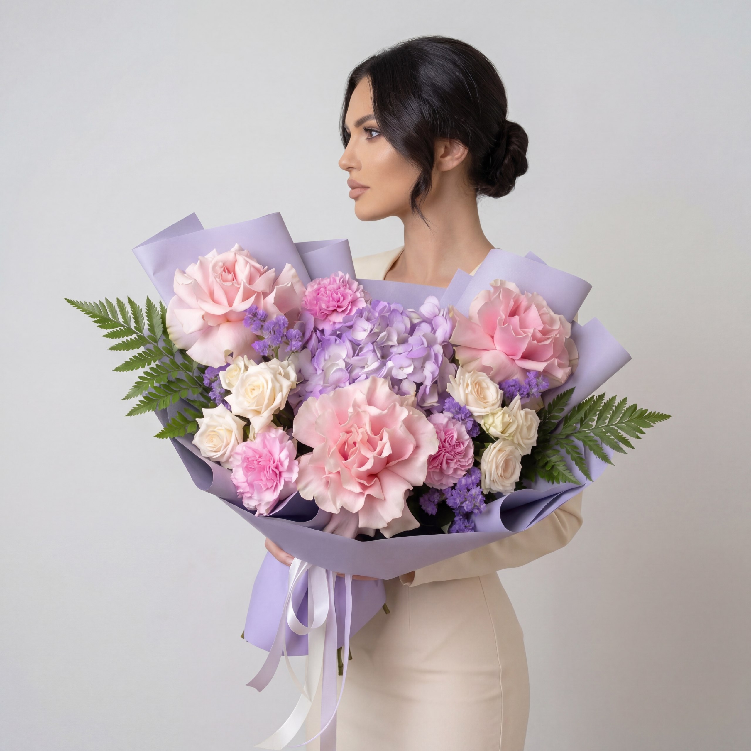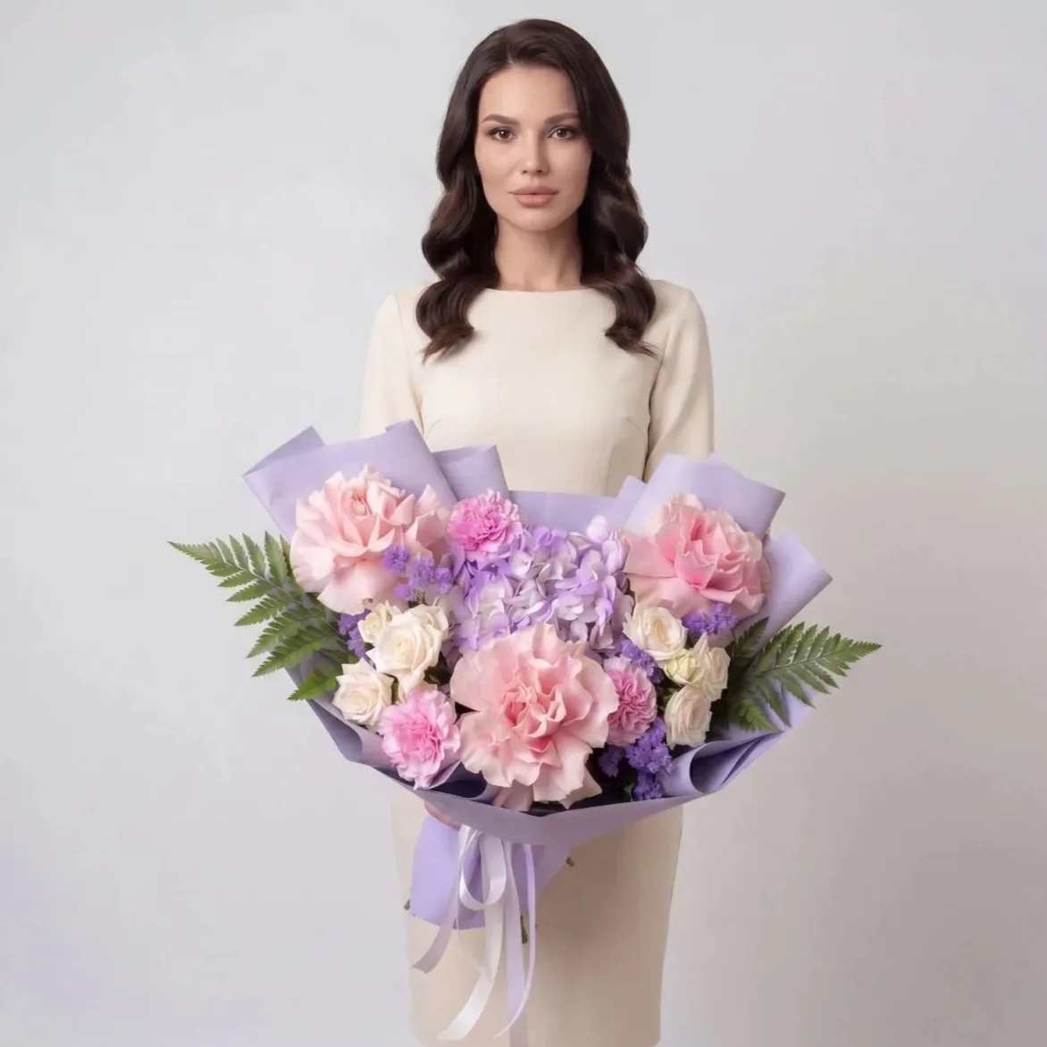 Авторский букет «Лавандовый мир» – это нежное прикосновение природы, воплощенное в изысканной композиции. В нем гармонично сочетаются воздушная лавандовая гортензия, утонченные розовые французские розы и очаровательные диантусы. Дополняют эту палитру кремовые кустовые розы, добавляя мягкости, и лавандовая статица, придающая букету легкость и неповторимый аромат. Идеальный выбор для тех, кто ценит утонченность и природную красоту.