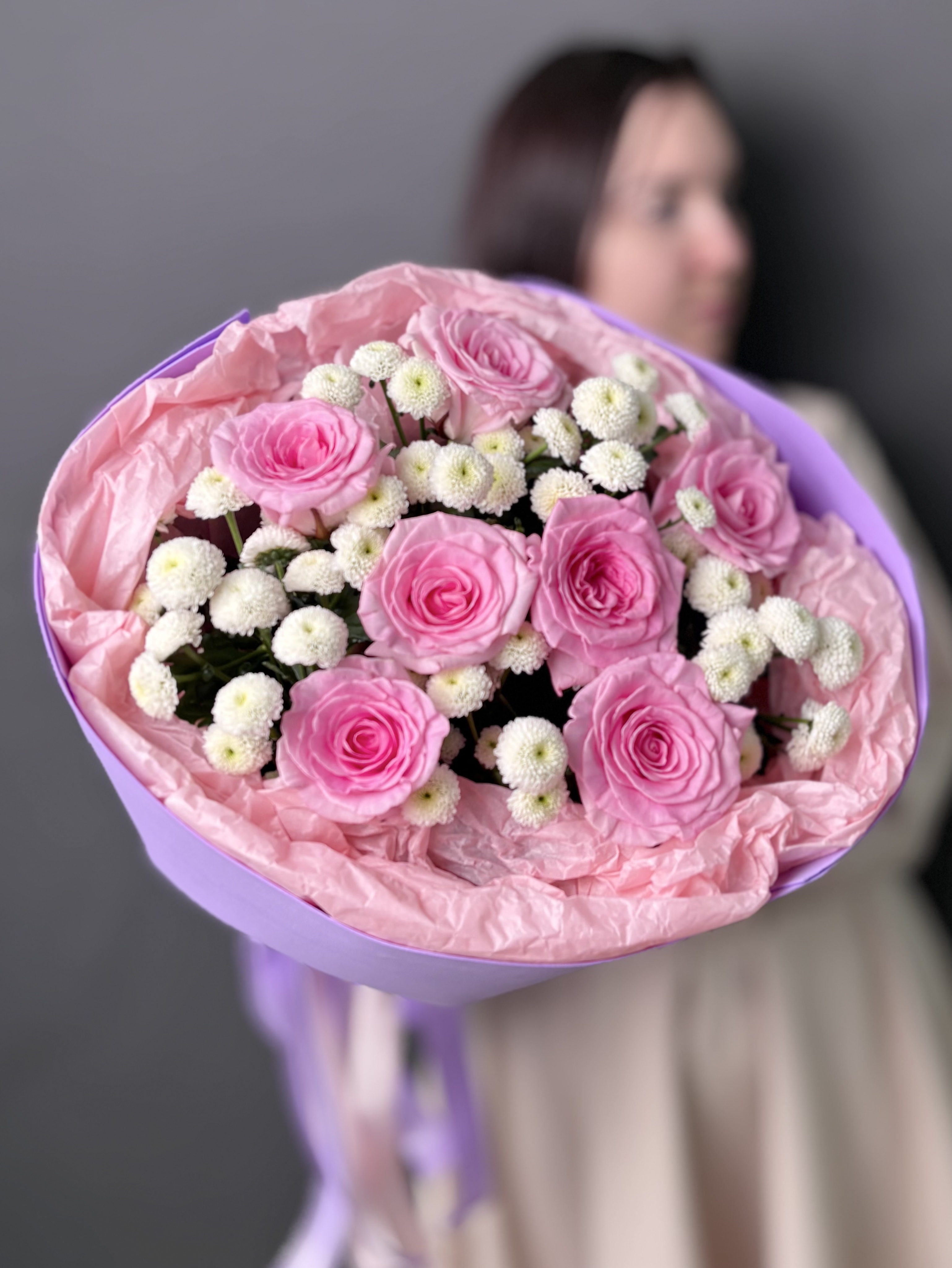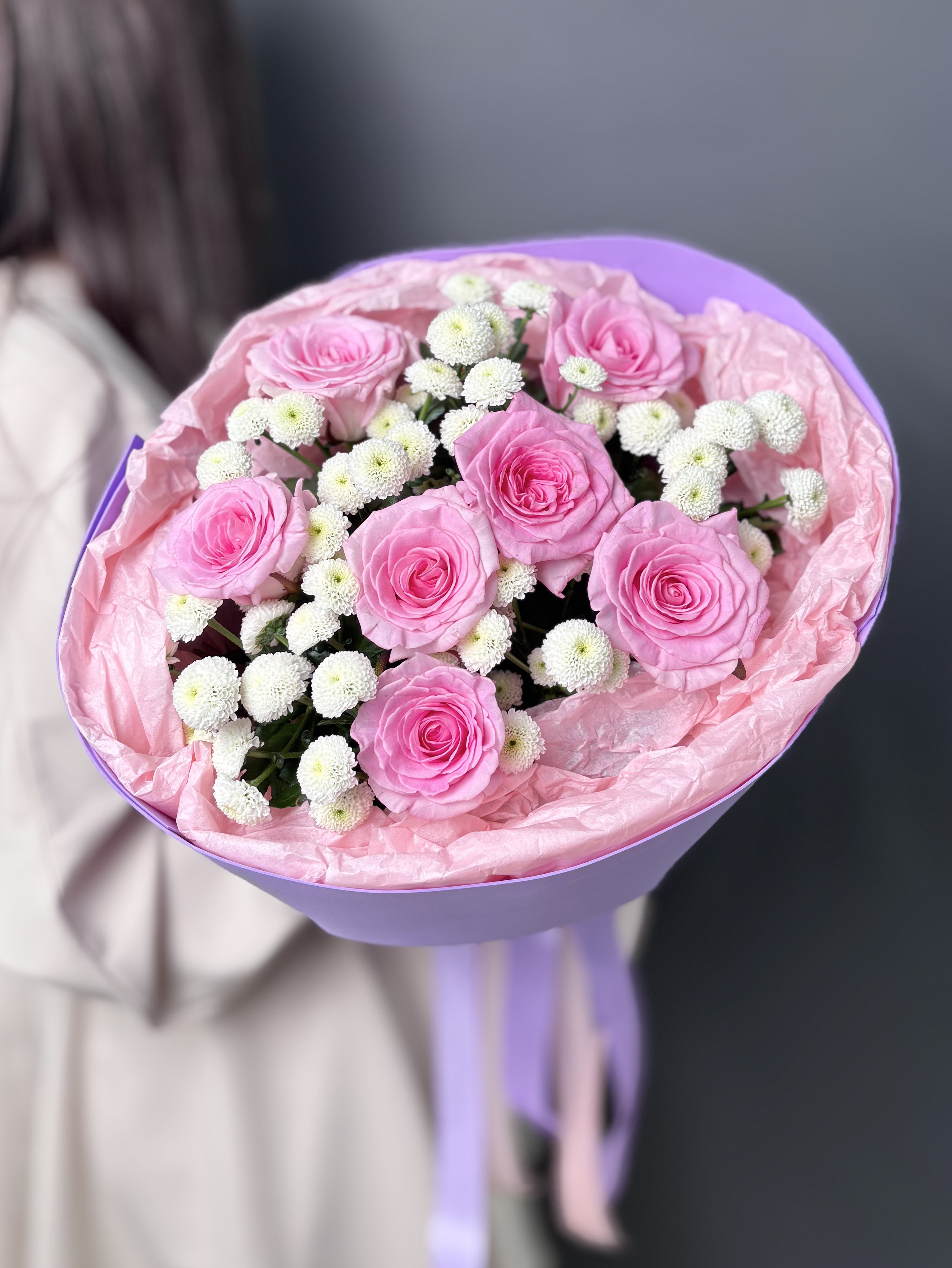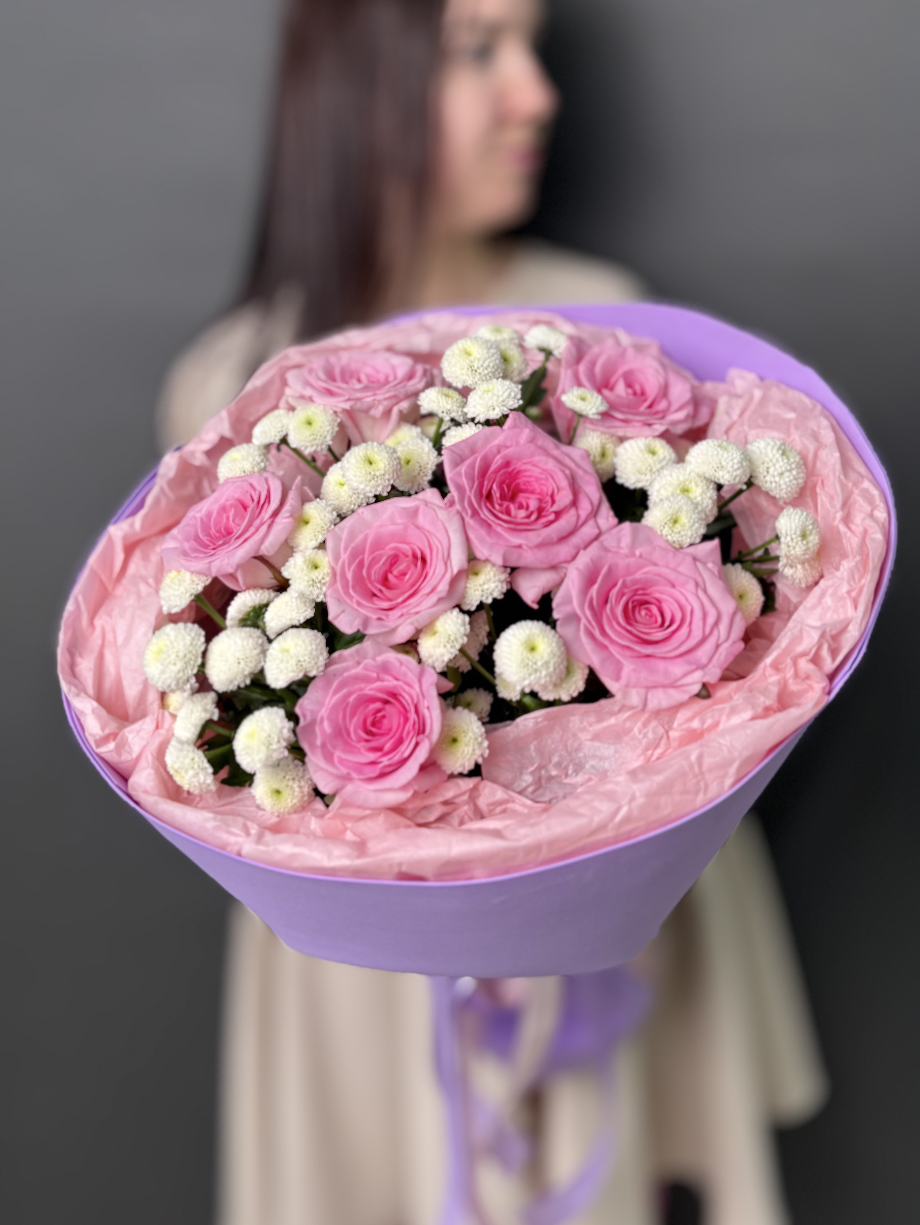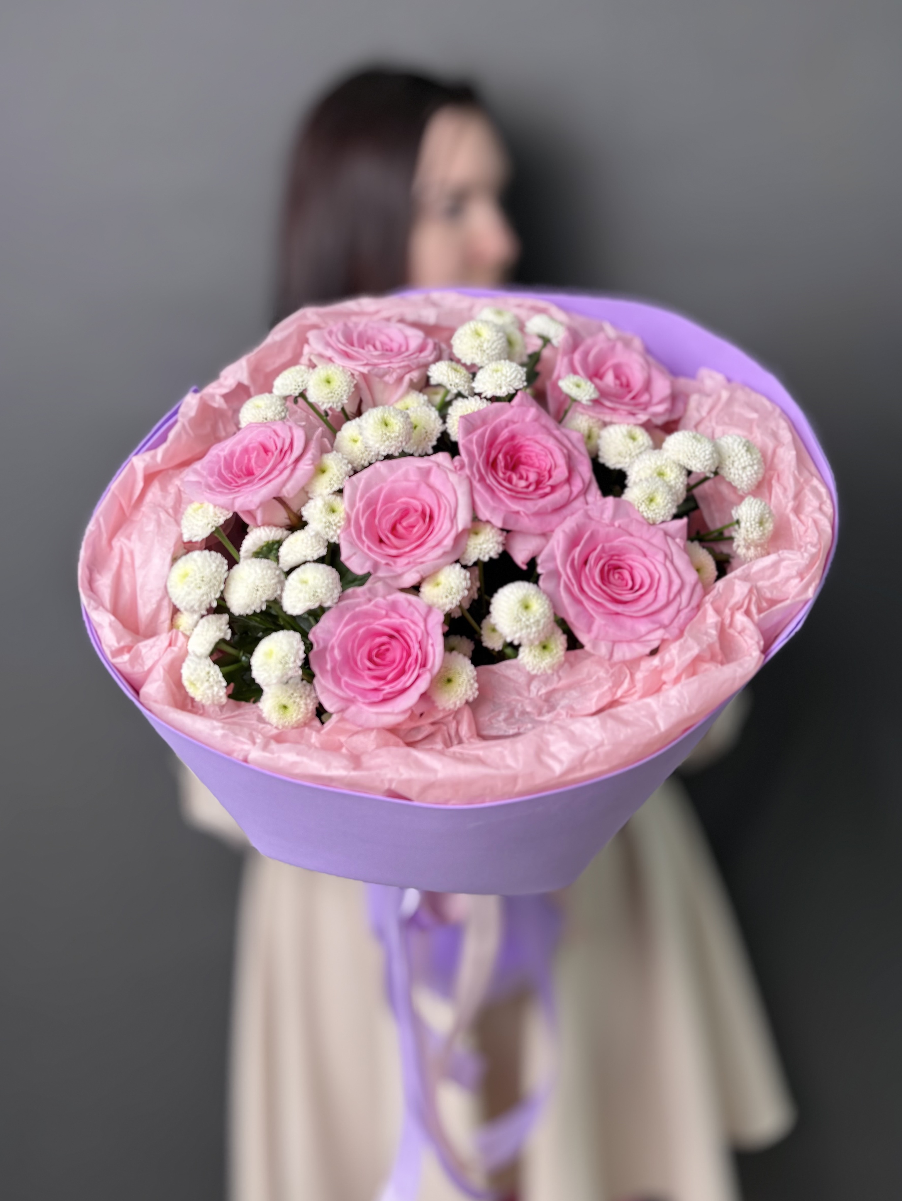 Позвольте себе окунуться в мир изысканности с этим уникальным букетом. Нежные розы, словно бархатные лепестки, переплетаются с ароматной хрищантемой сантини, наполняя пространство тонким, пленительным благоуханием. Каждый цветок подобран с любовью и вниманием, создавая гармоничную композицию, которая дарит ощущение легкости и умиротворения. Стильная упаковка подчеркивает элегантность букета, делая его идеальным подарком для тех, кто ценит истинную красоту и утонченность.