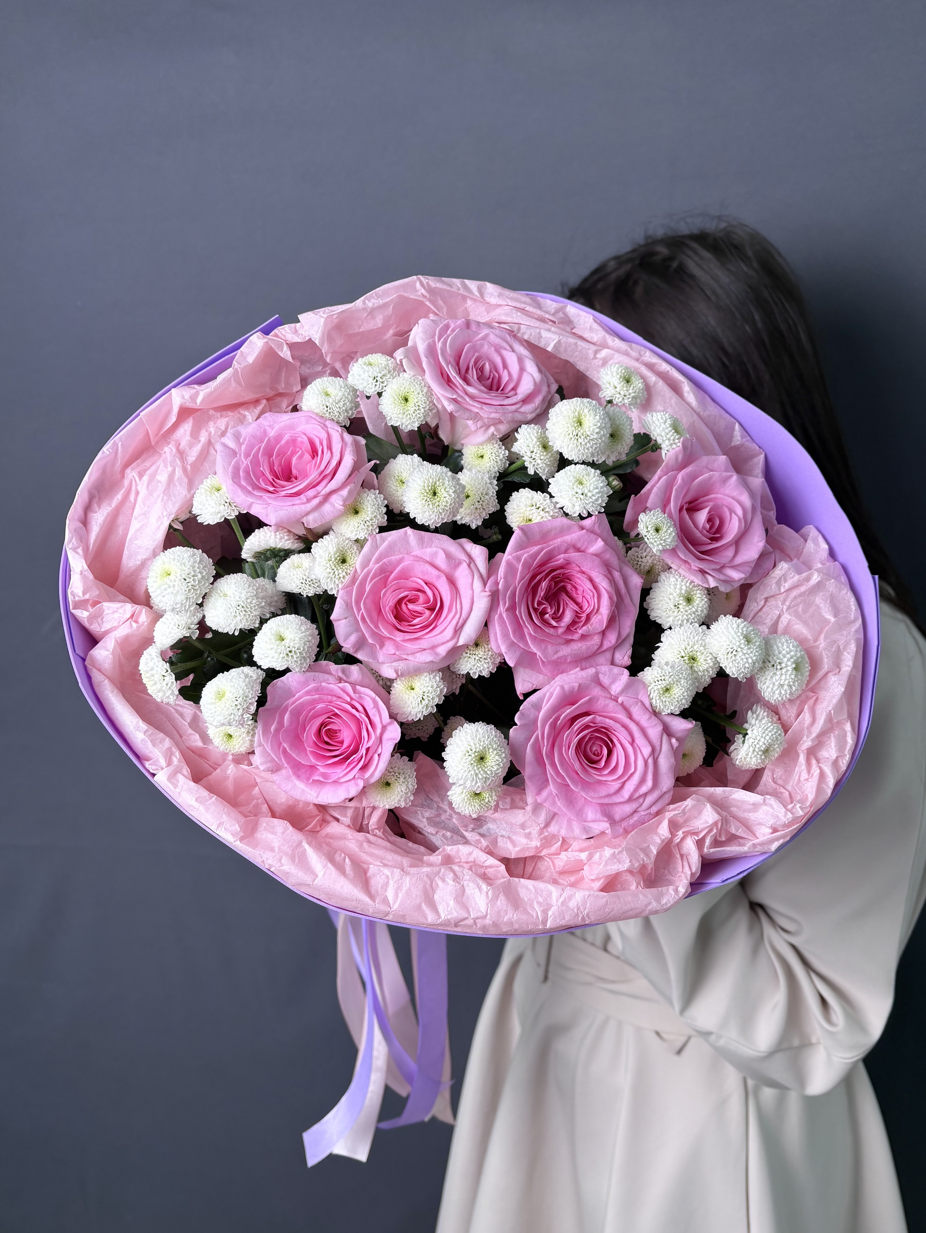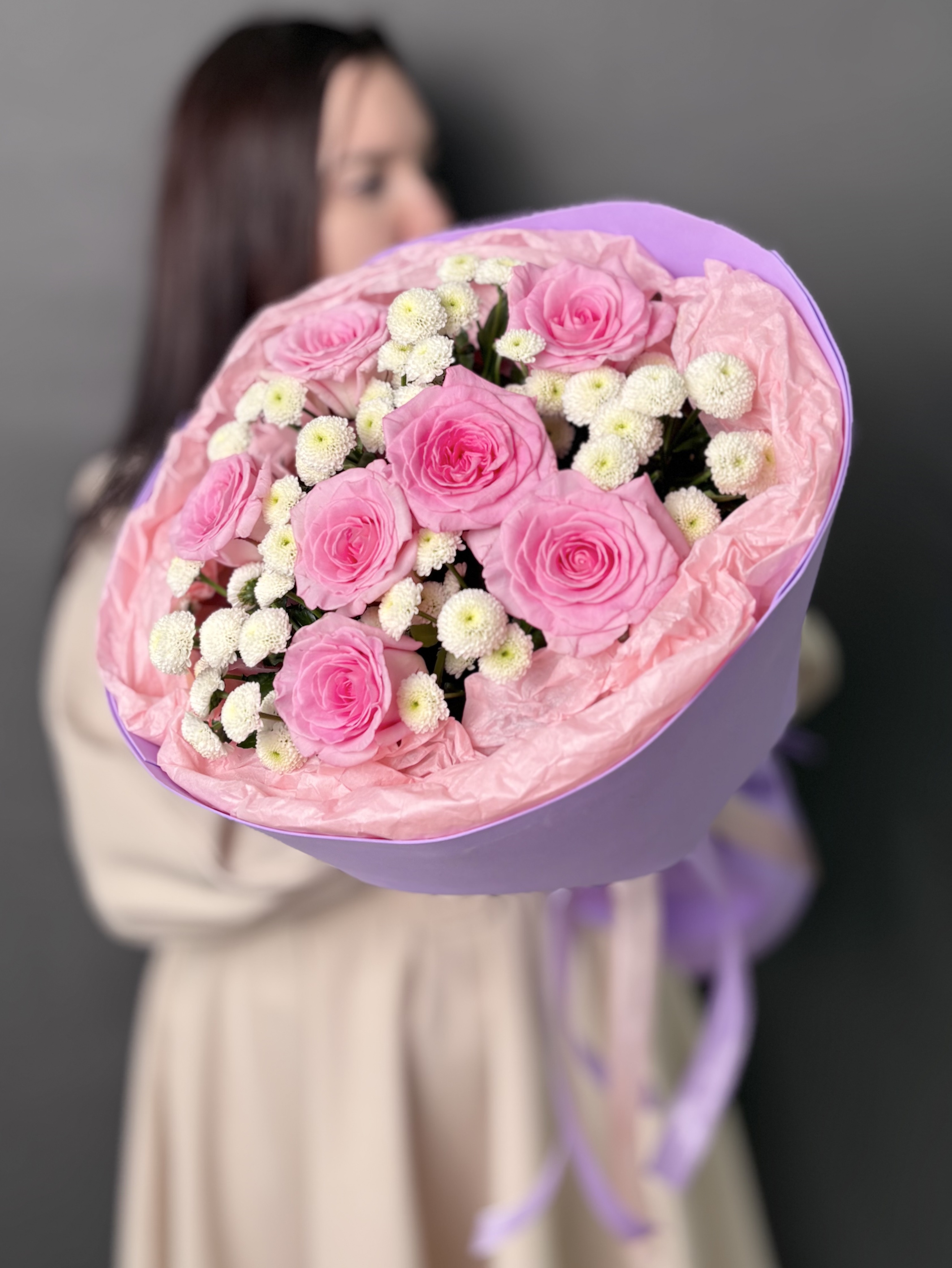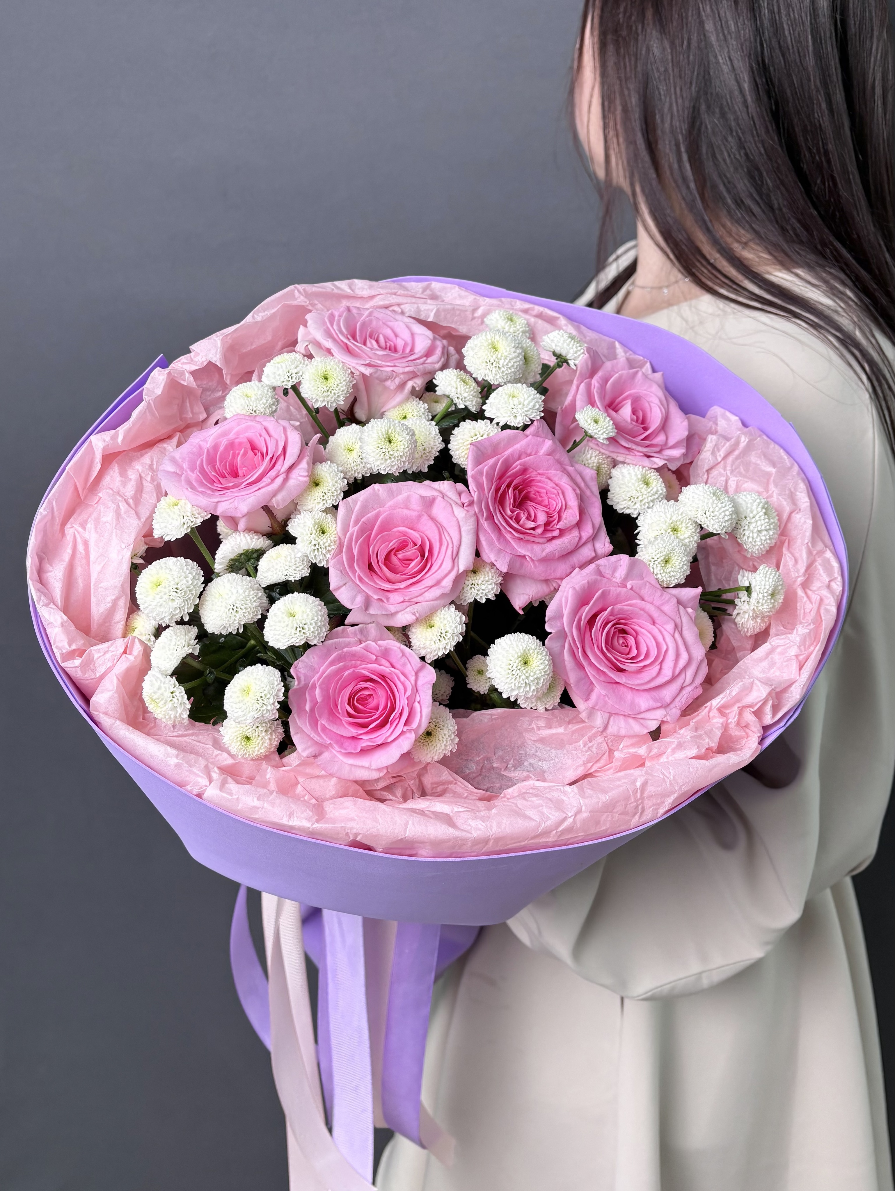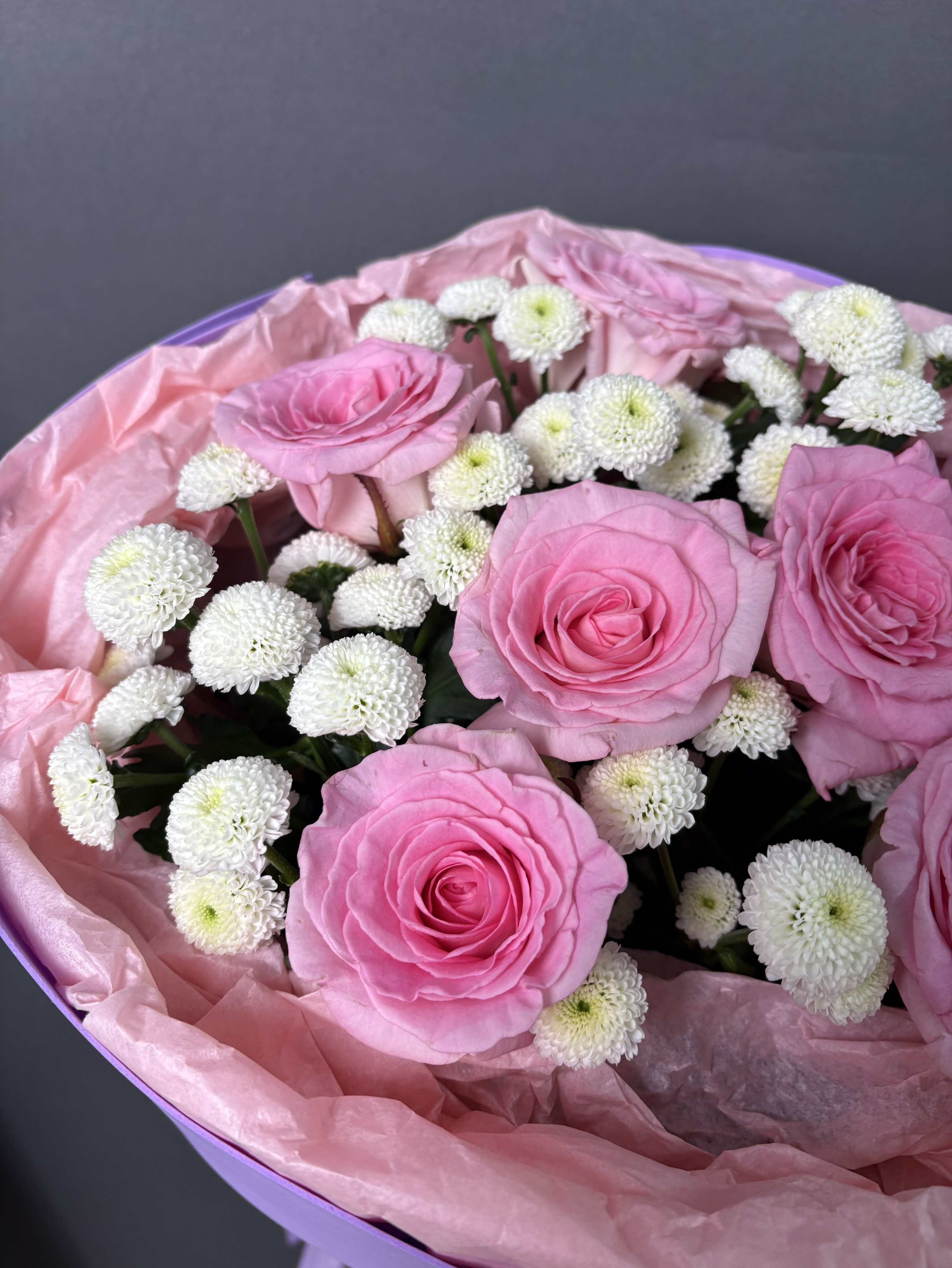 Позвольте себе окунуться в мир изысканности с этим уникальным букетом. Нежные розы, словно бархатные лепестки, переплетаются с ароматной хрищантемой сантини, наполняя пространство тонким, пленительным благоуханием. Каждый цветок подобран с любовью и вниманием, создавая гармоничную композицию, которая дарит ощущение легкости и умиротворения. Стильная упаковка подчеркивает элегантность букета, делая его идеальным подарком для тех, кто ценит истинную красоту и утонченность.
