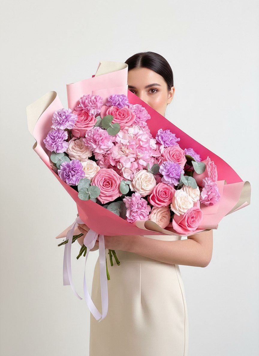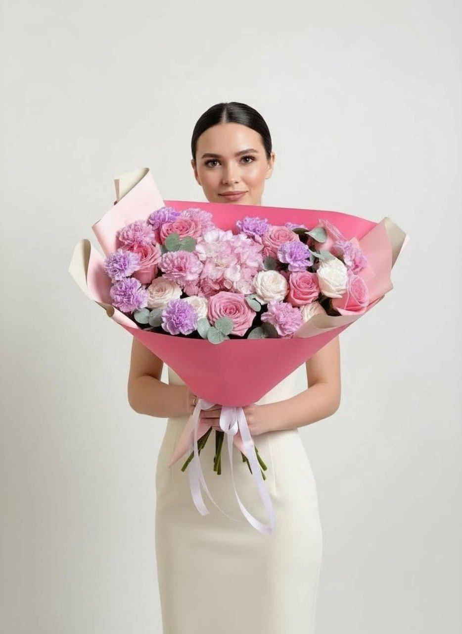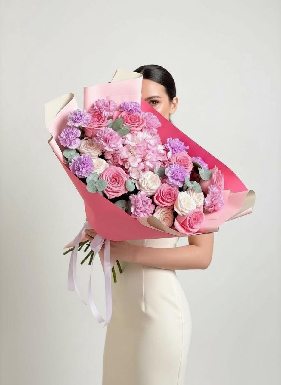 Позвольте себе окунуться в мир утонченной красоты с этим особенным букетом. Воздушные облака гортензии, словно нежные объятия, переплетаются с бархатистыми лепестками кустовых роз, каждая из которых хранит свою маленькую историю. Изящные диантусы добавляют букету игривости и свежести, а благородные розы, словно признания в любви, завершают эту гармоничную композицию. "Нежность любви" – это не просто цветы, это послание сердца, воплощенное в изысканной форме.
