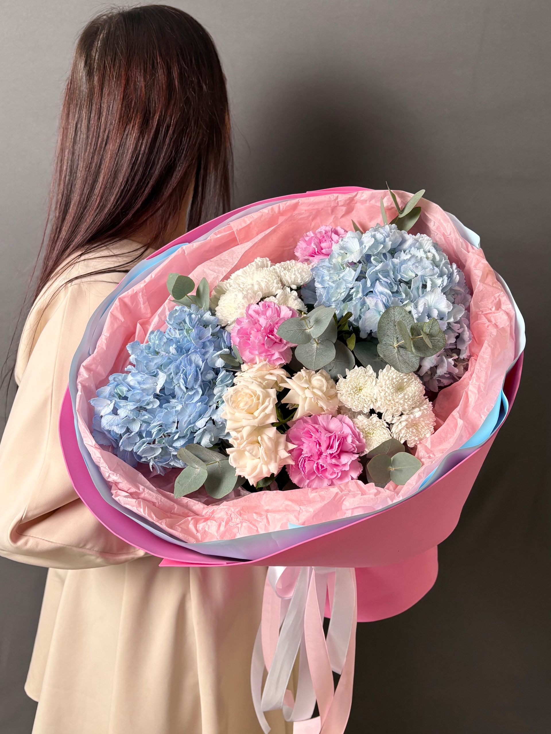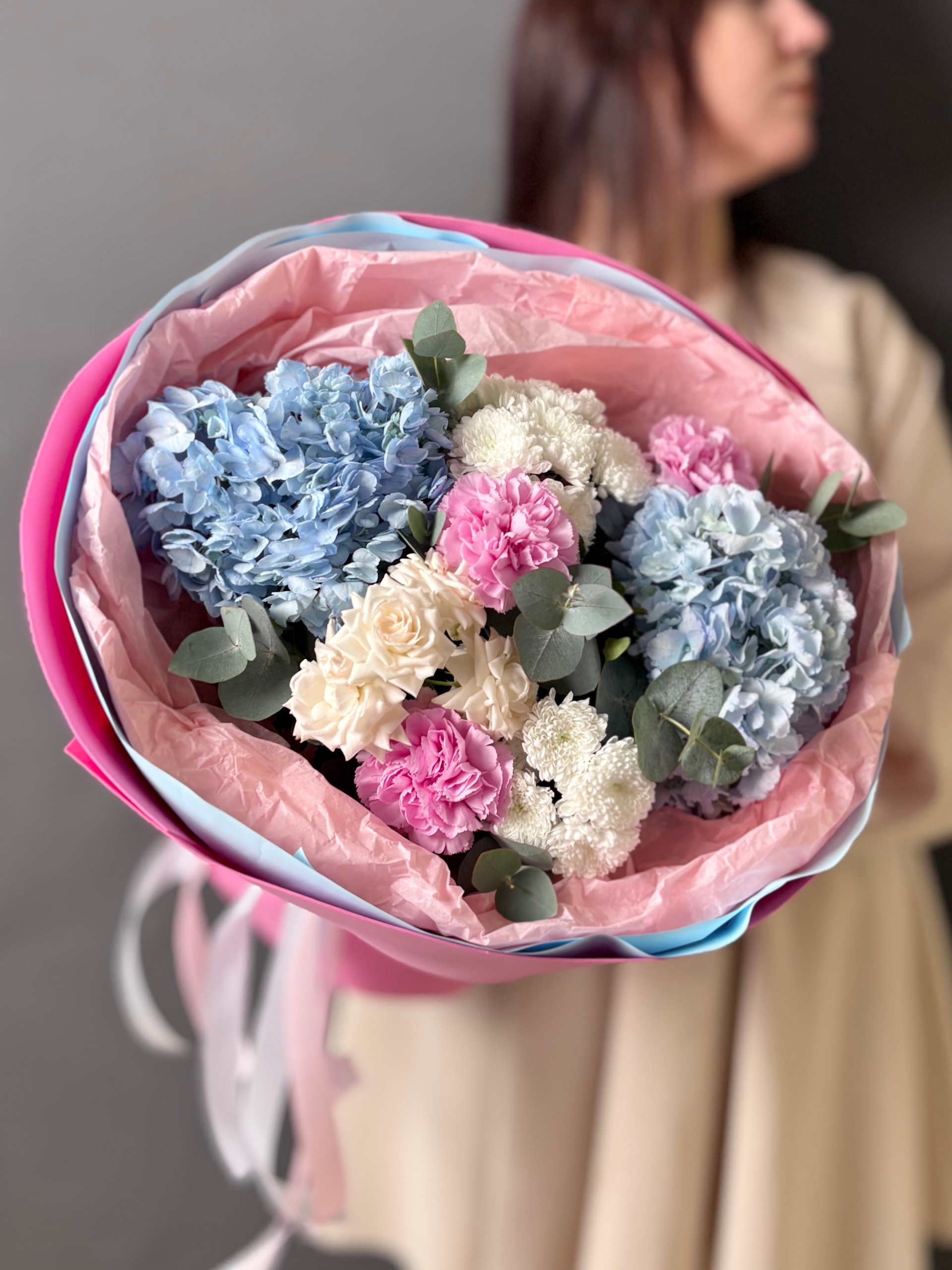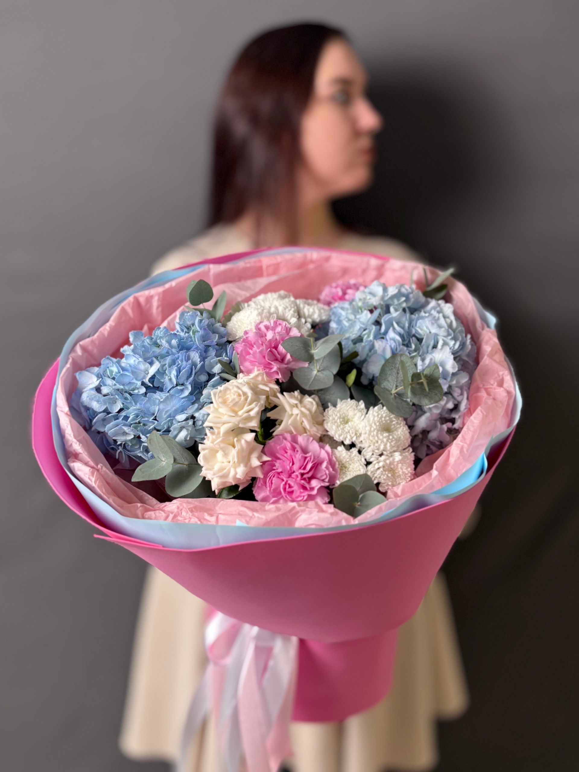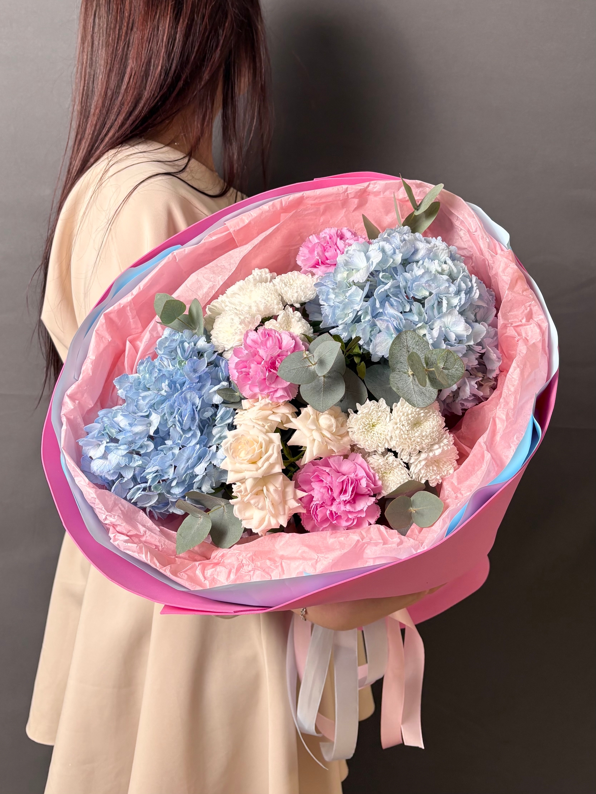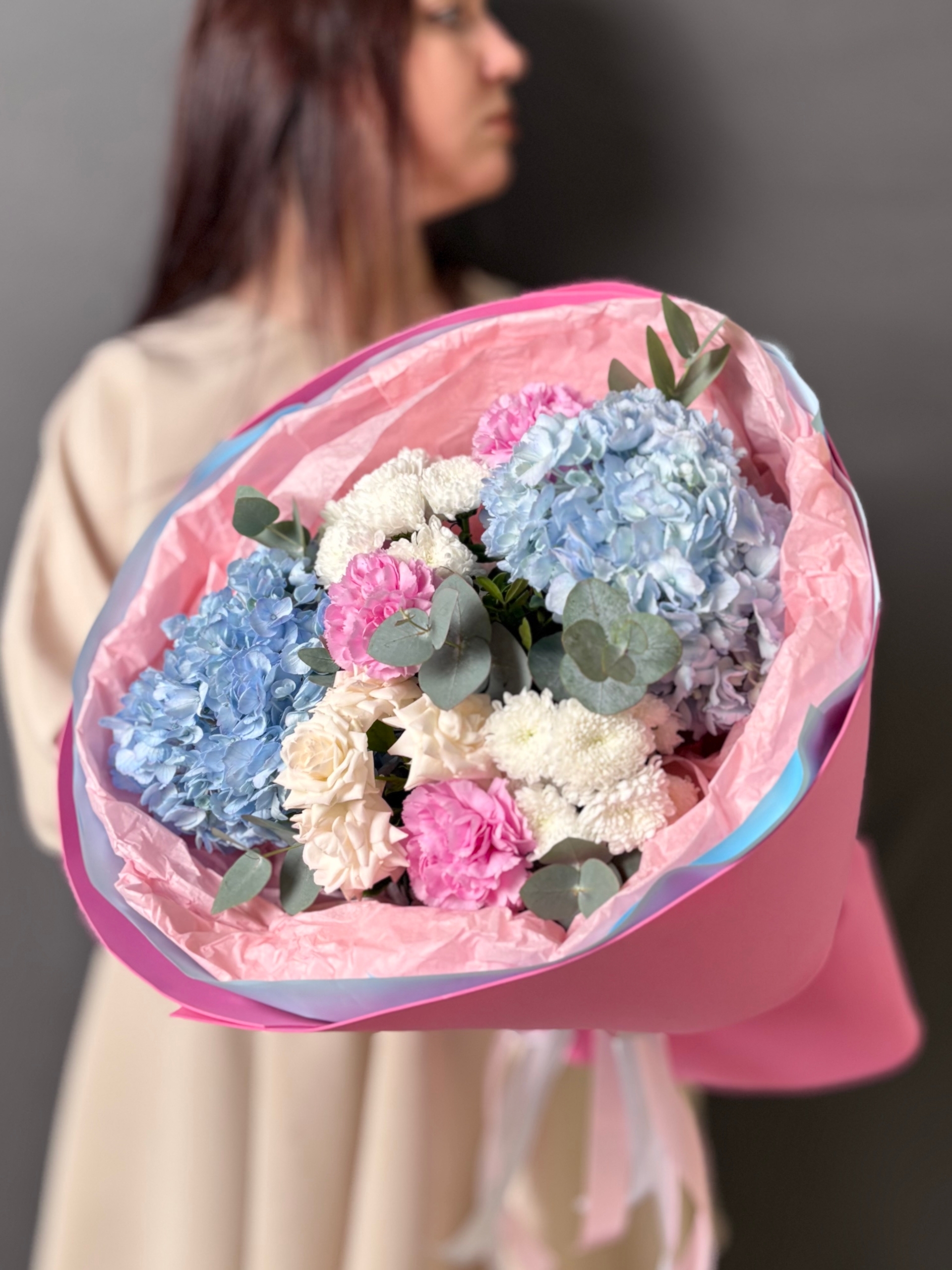 В его основе – воздушные, словно облака, голубые гортензии, символизирующие искренность и нежность. Их пышные соцветия окутывают букет мягким, мечтательным сиянием.