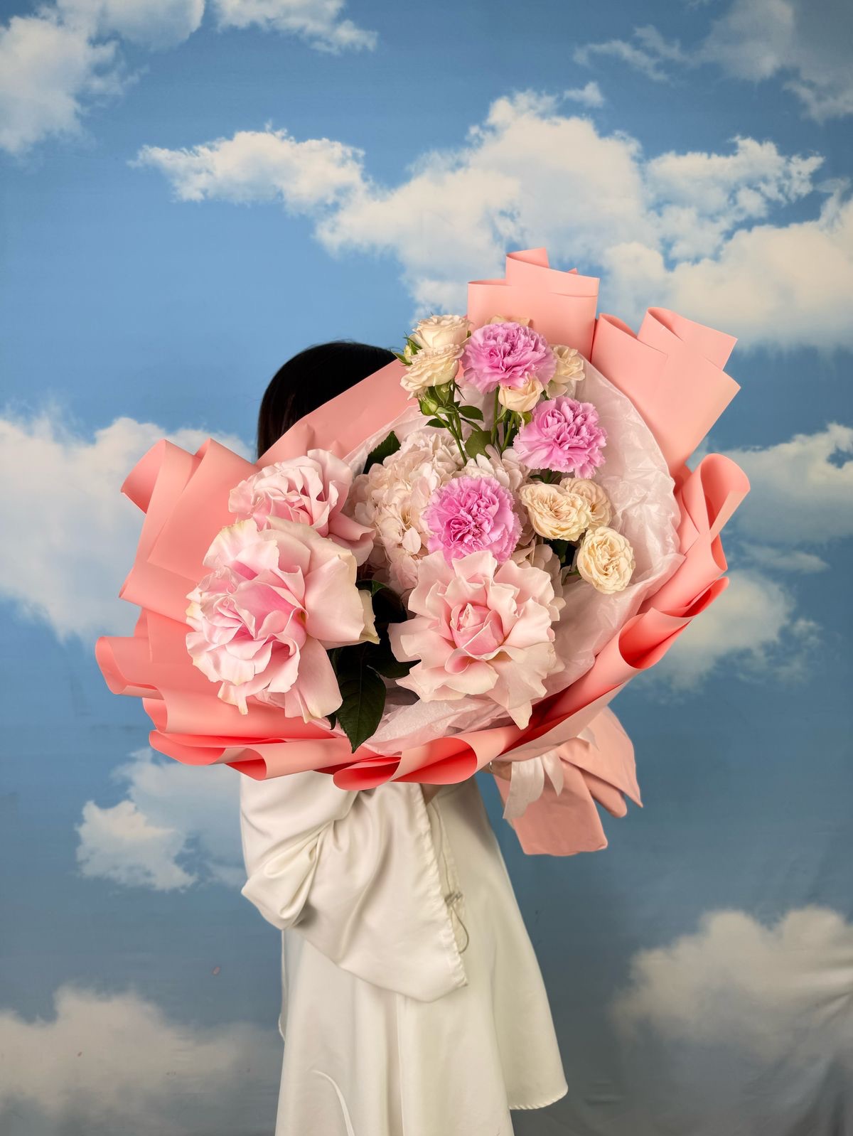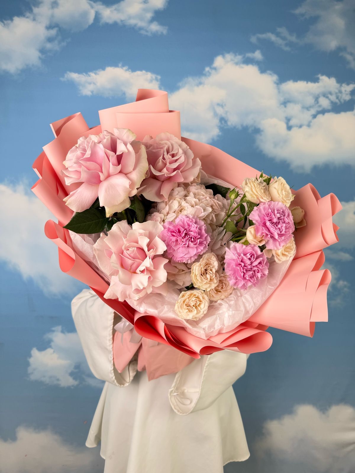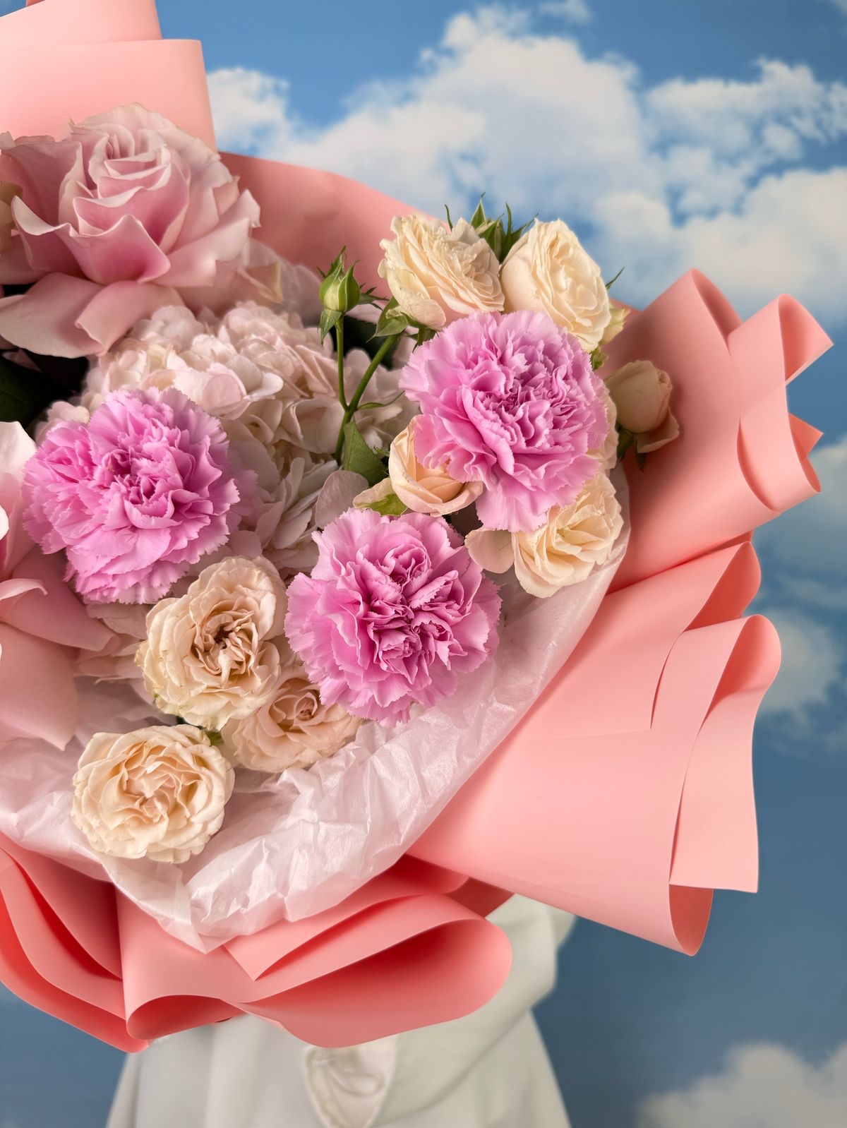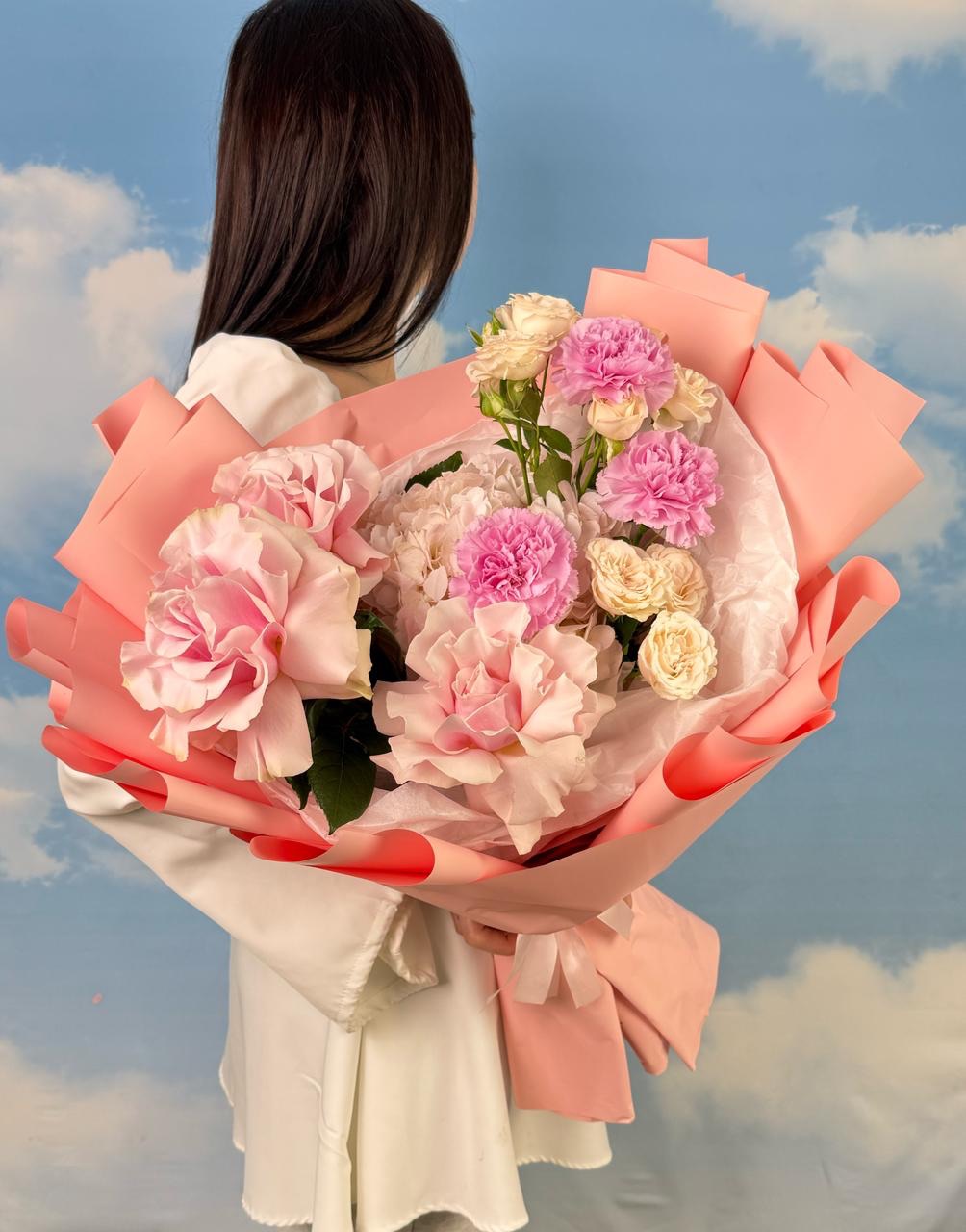 В его сердце – бархатистые кустовые розы, словно собравшие в себе всю нежность утреннего света. Их пышные головки переплетаются с воздушной персиковой гортензией, добавляя букету объем и мягкость. А изысканные французские розы, с их утонченным ароматом и глубоким оттенком, привносят нотку романтики и элегантности. Завершают эту гармонию нежные розовые диантусы, добавляя легкую пикантность и игривость.