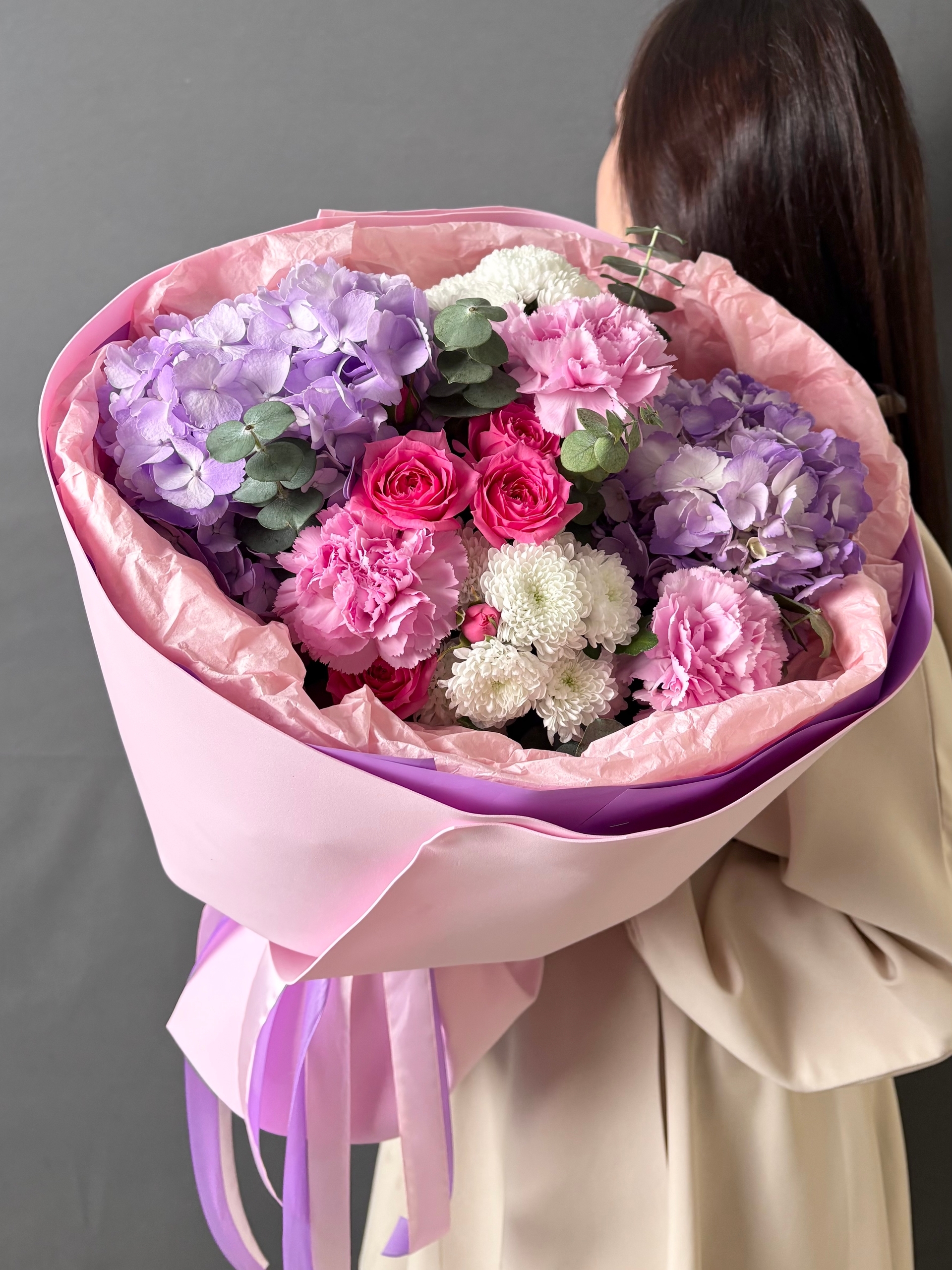 В основе этого творения – пышные, словно облака, гортензии. Их нежные соцветия, окрашенные в оттенки утреннего неба и летних сумерек, создают ощущение воздушности и легкости. Они словно приглашают вас окунуться в мир спокойствия и умиротворения.