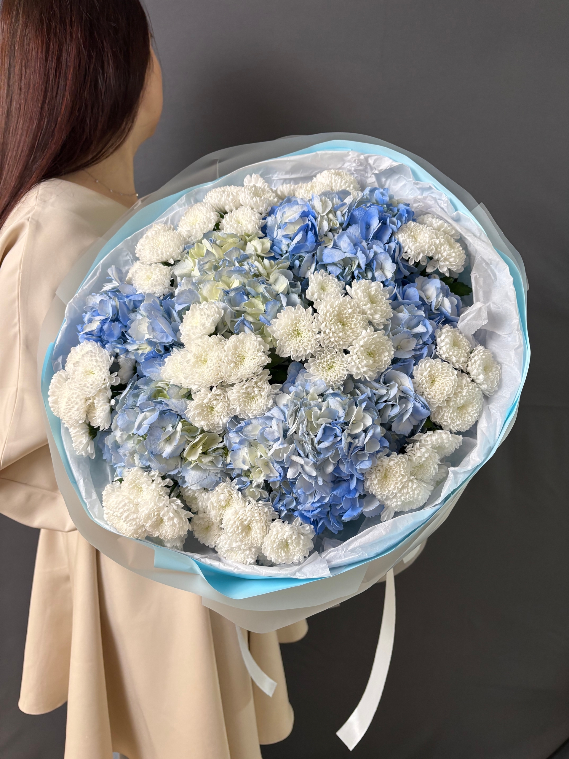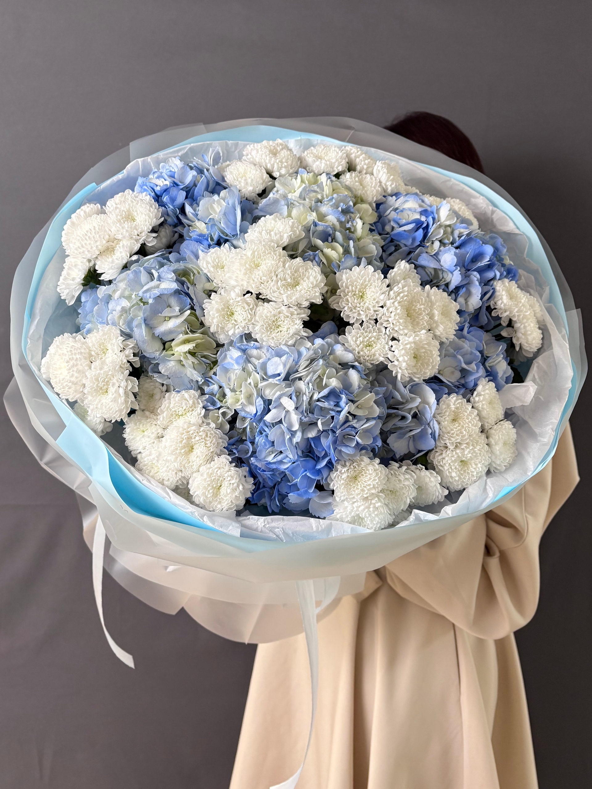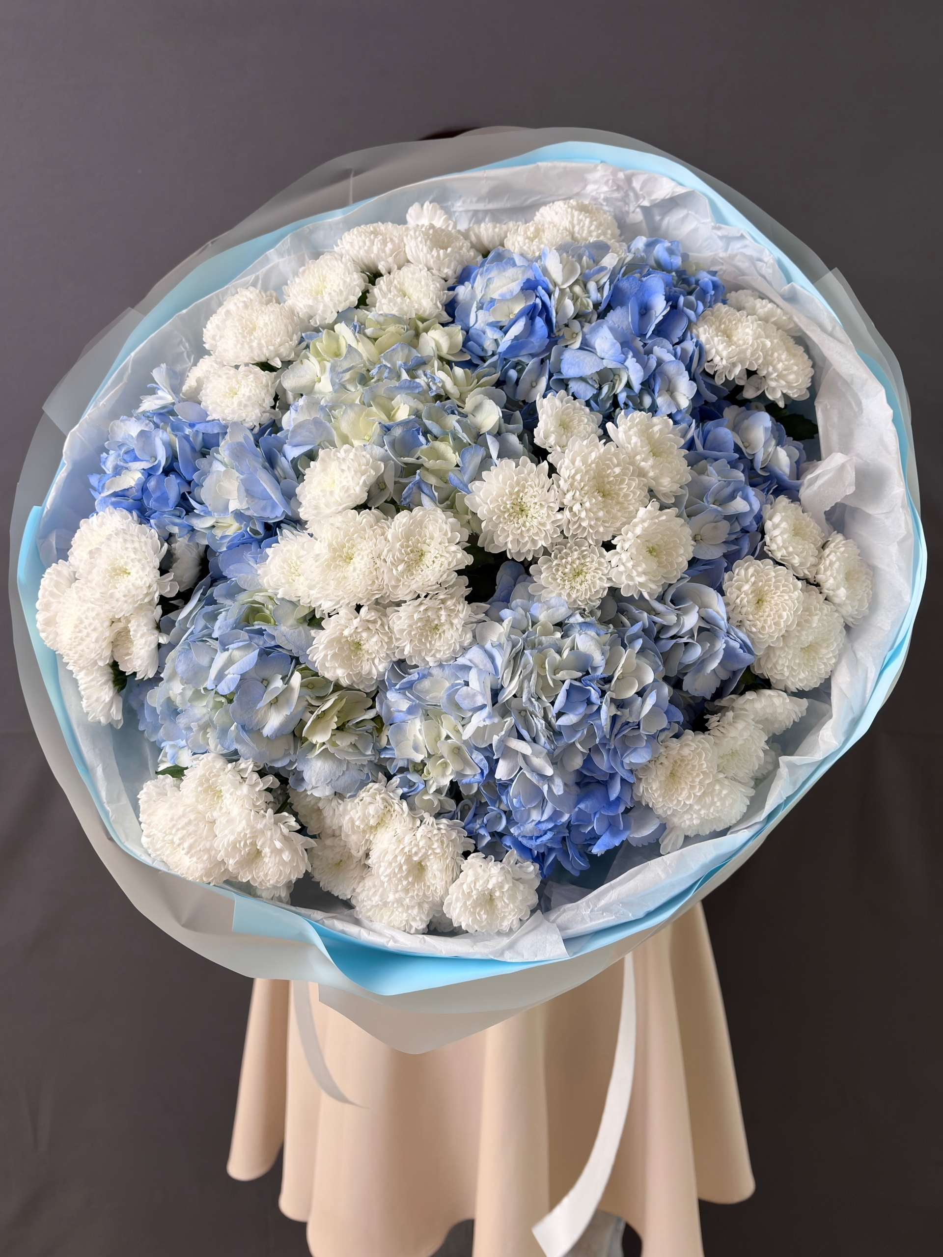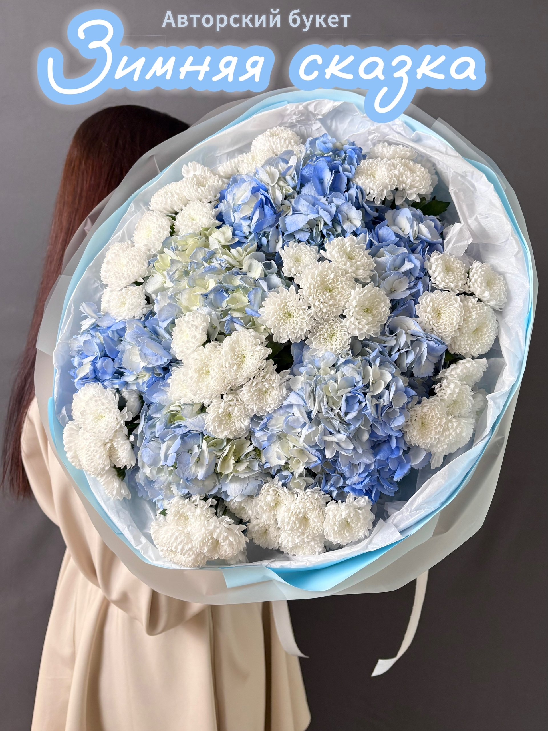 Авторский букет «Зимняя сказка» С голубыми гортензиями и кустовые хризантемами сантини
