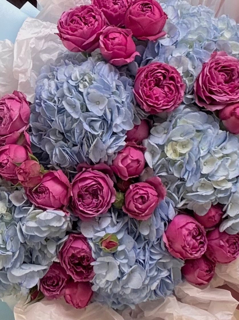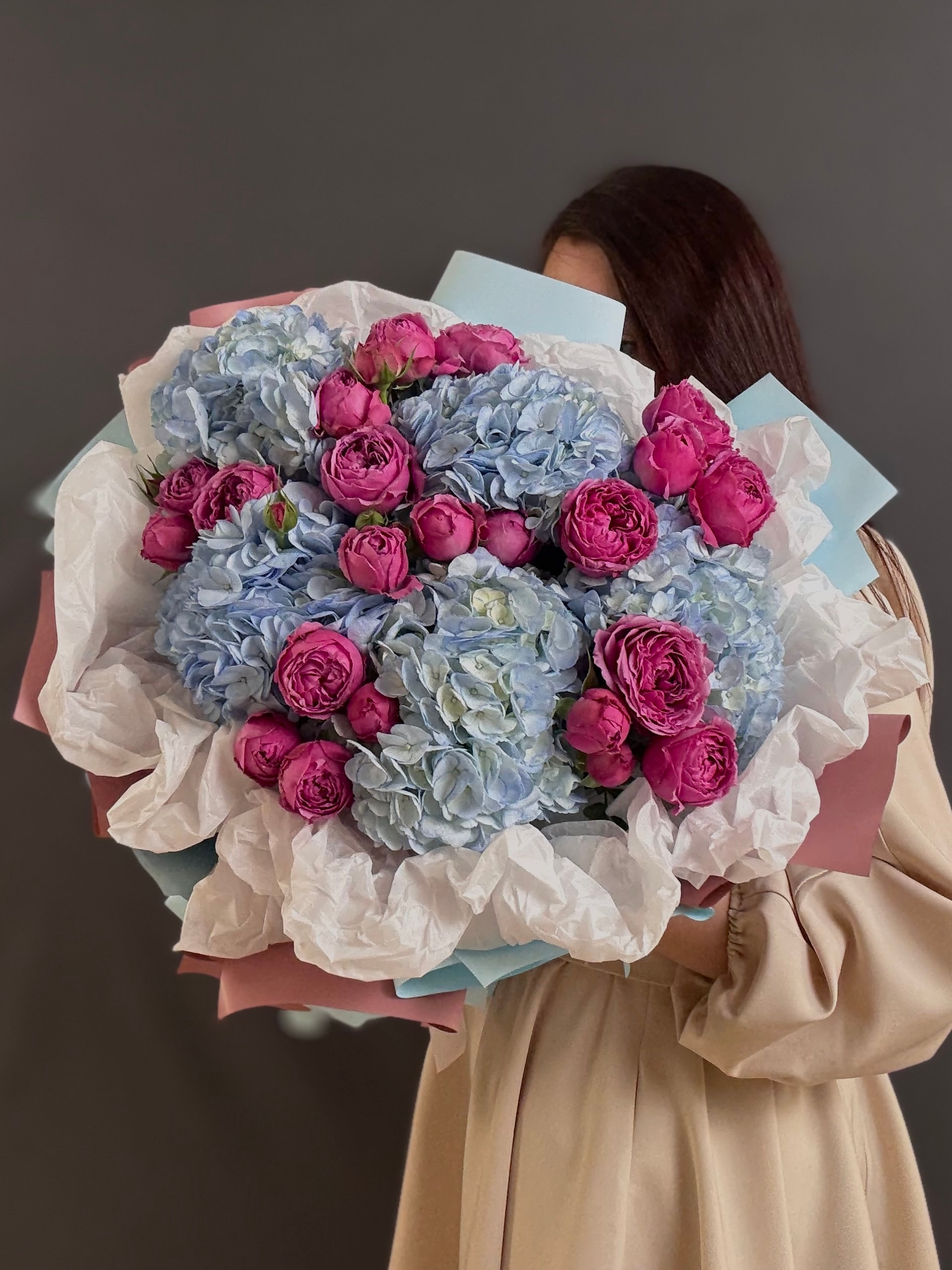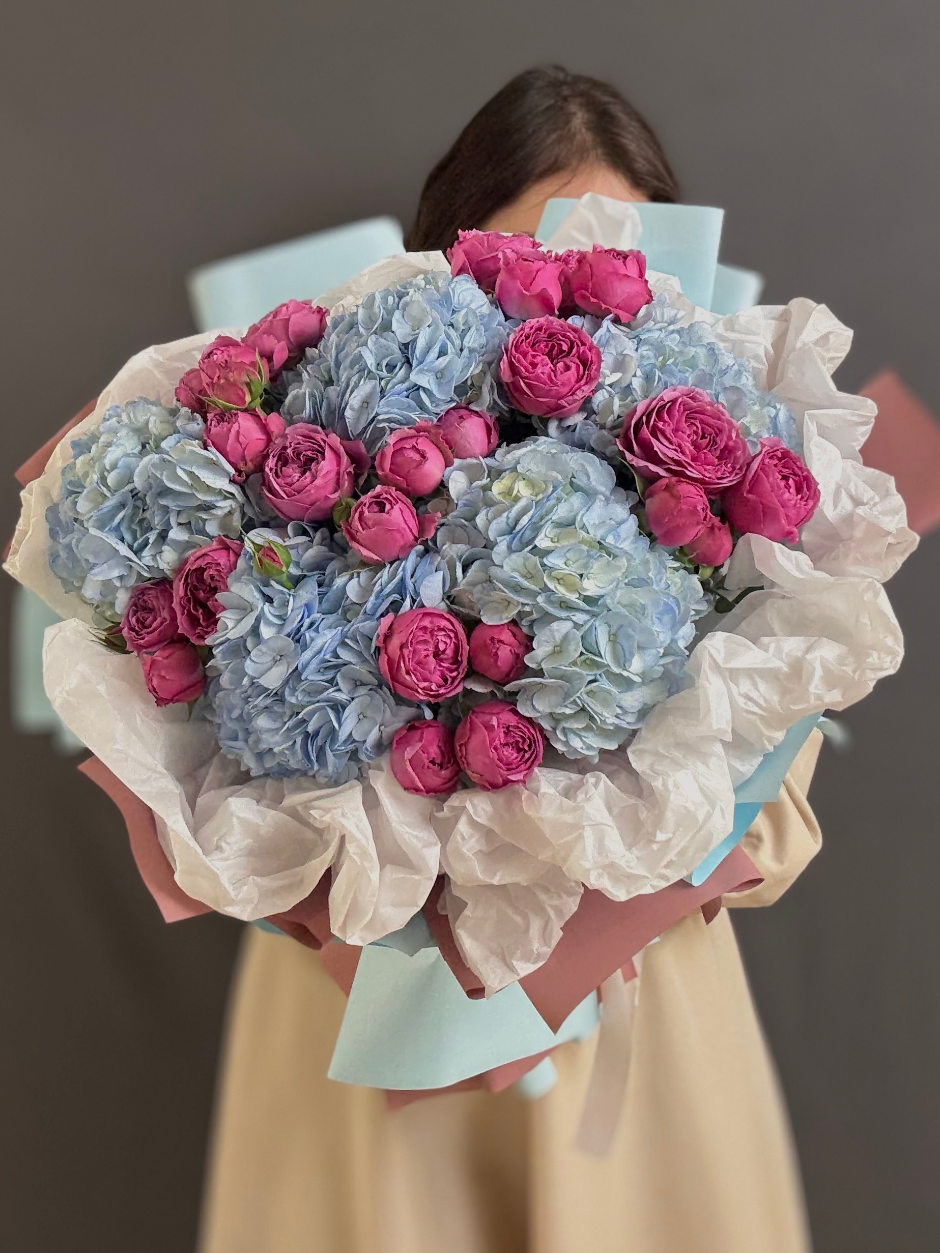 Авторский букет « Звёздное небо» с голубыми гортензиями и малиновыми пионовидными кустовыми розами в стильной упаковке