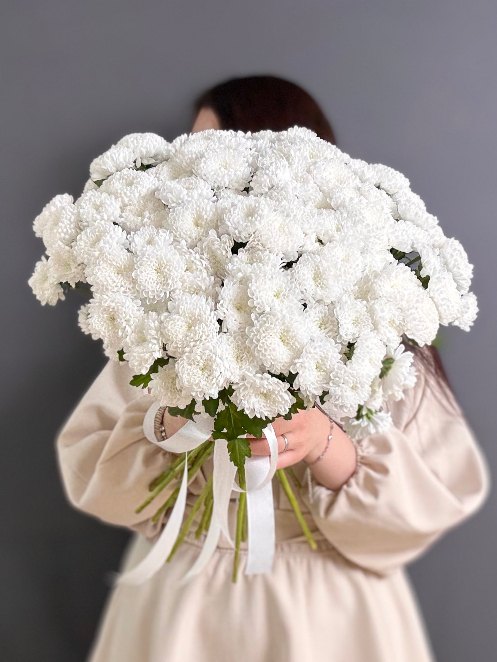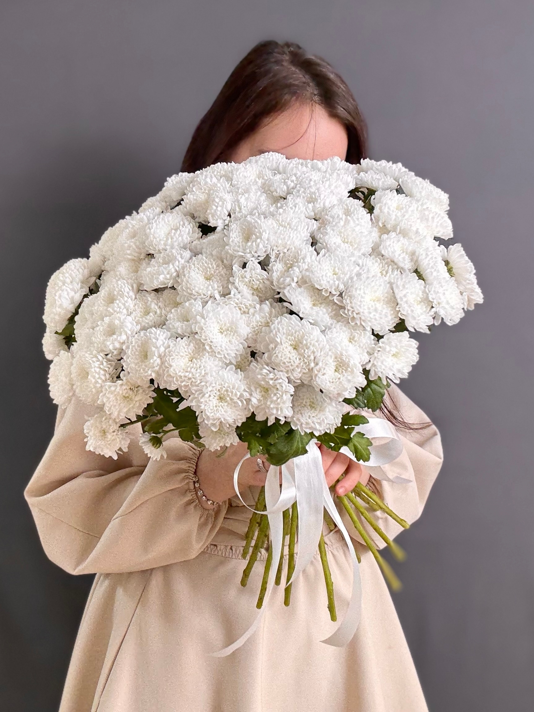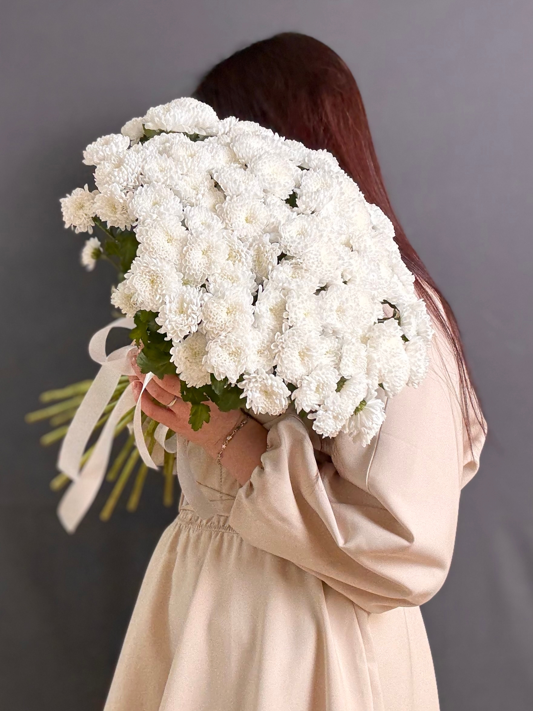Авторский букет «Воздушное настроение» из 21 белоснежной кустовой хризантемы Сантини