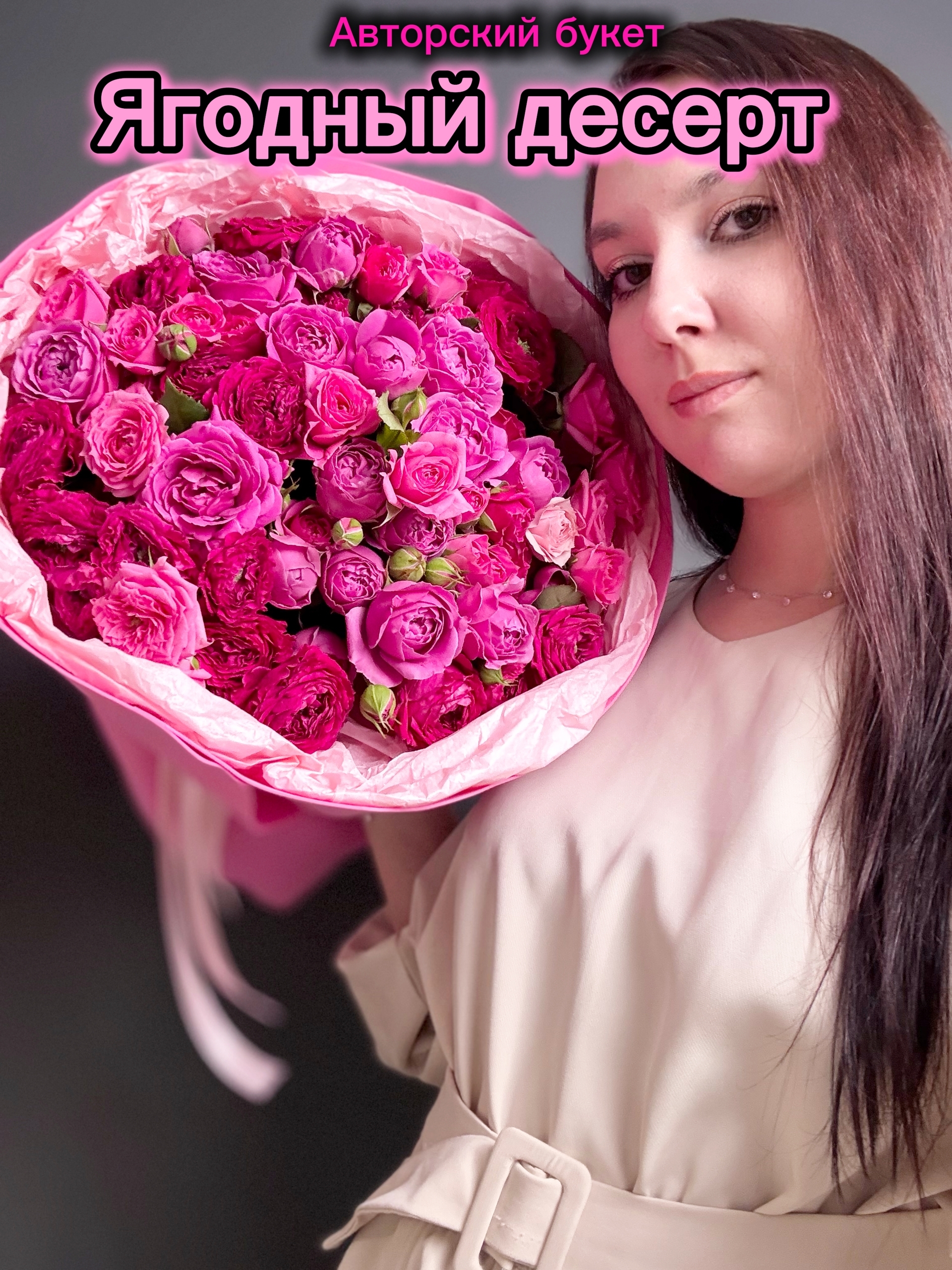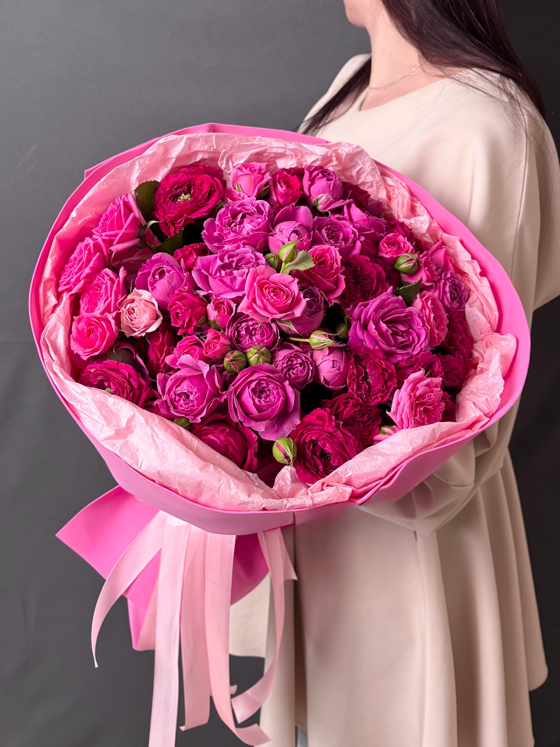 В самом сердце этой композиции – кустовые пионовидные розы. Их пышные, многослойные бутоны, словно маленькие пионы, распускаются во всем своем великолепии. Микс оттенков создает неповторимую игру света и тени, притягивая взгляд и завораживая своей красотой.