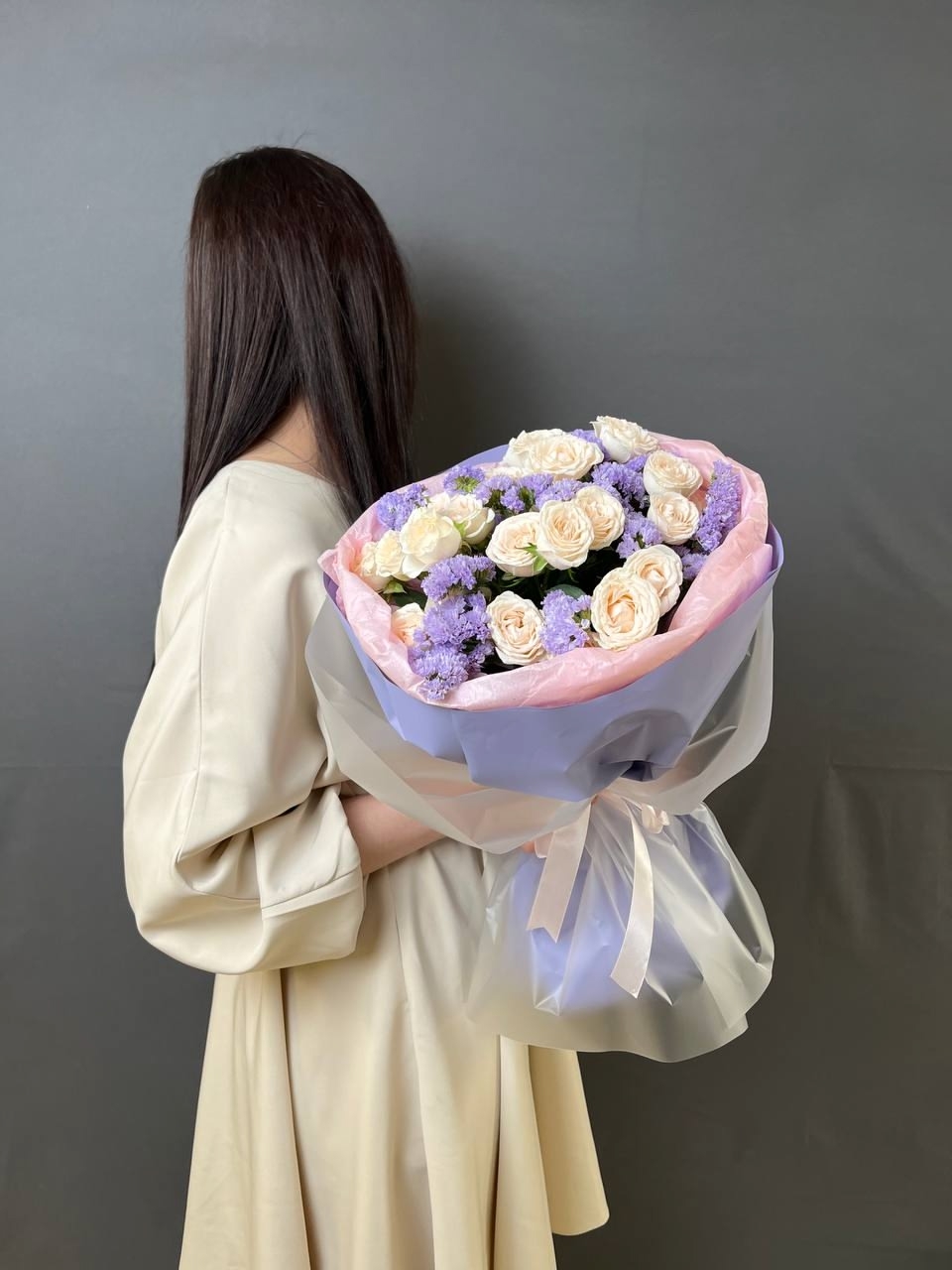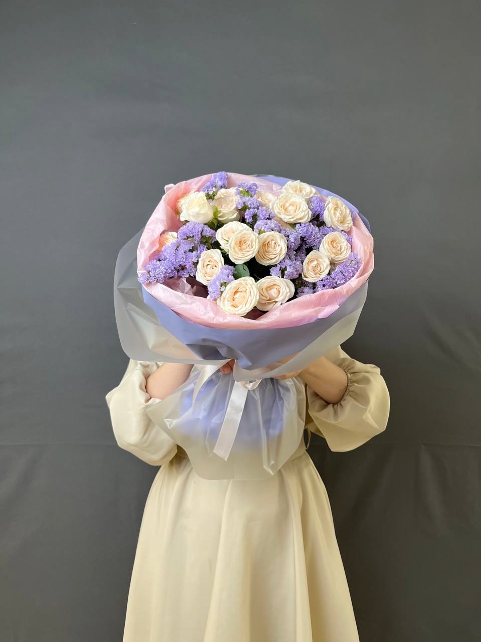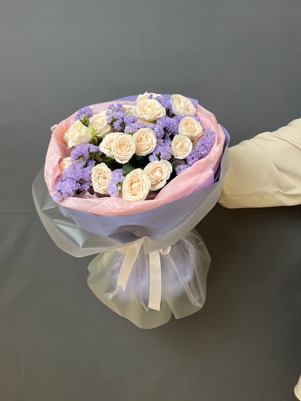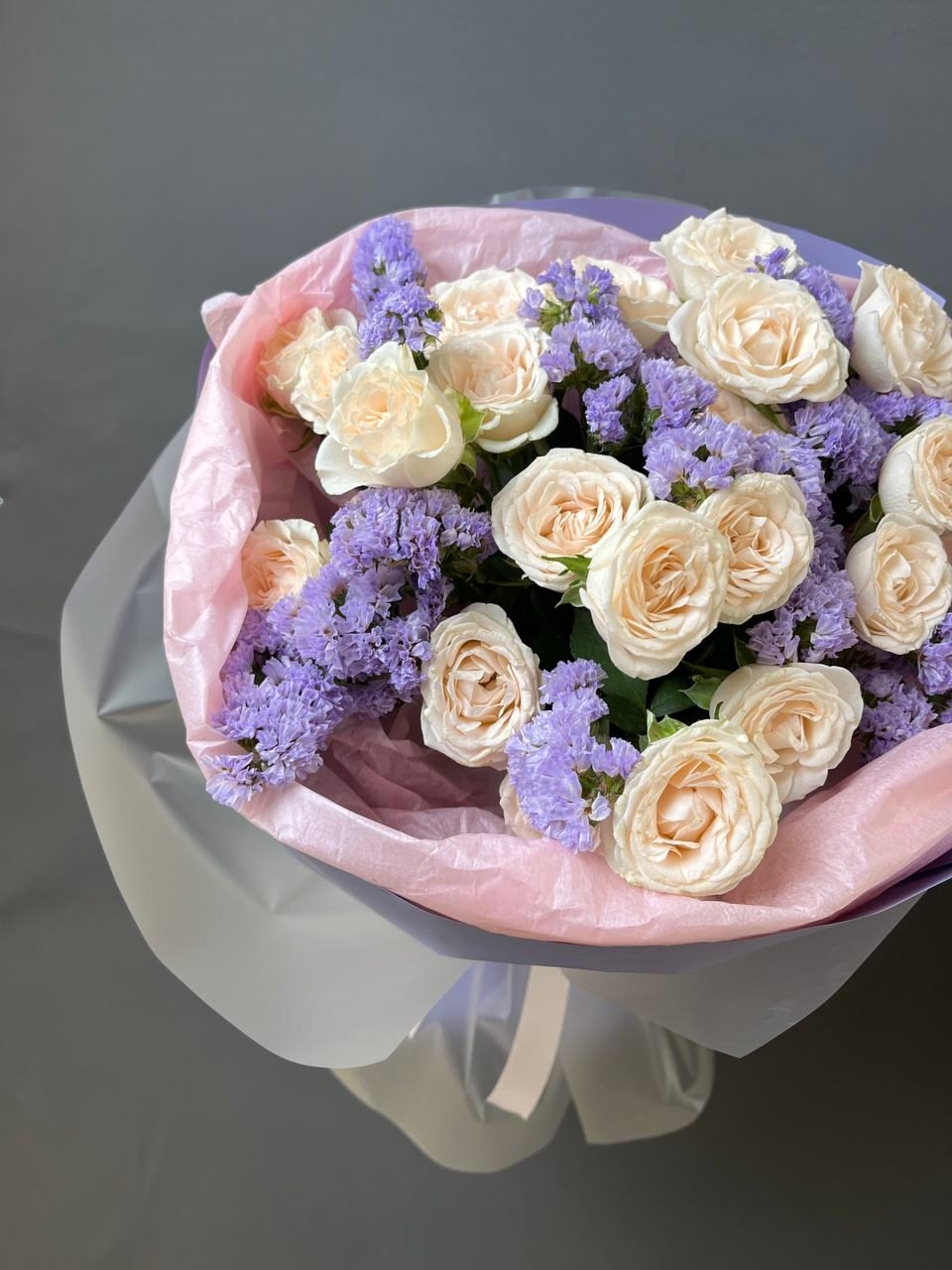 Букет-комплимент из 5 кустовых роз и веточек сиреневой статицы в стильной упаковке 🌸