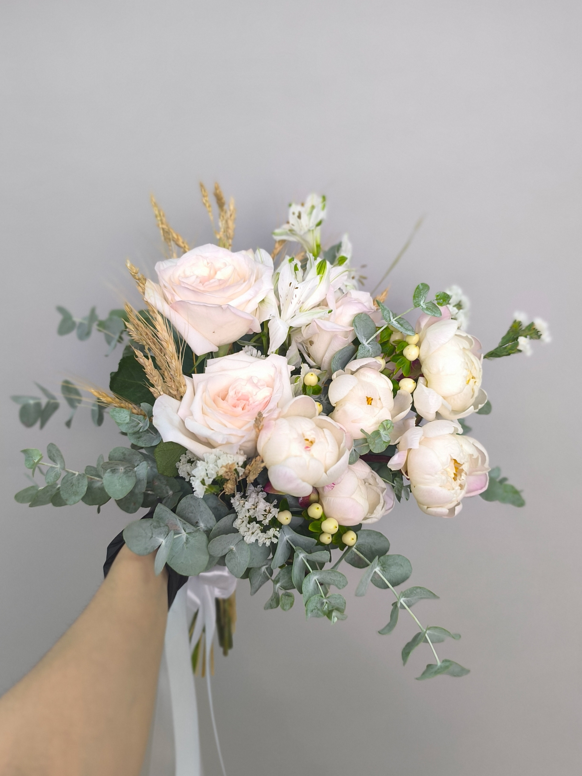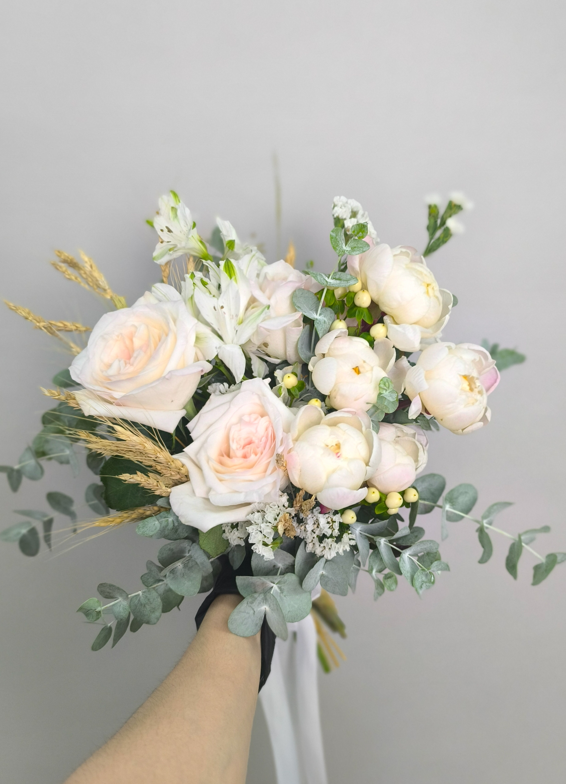 Нежный, словно утренний рассвет, букет невесты. В нем переплетаются золотистые колоски, символизирующие плодородие и благополучие, с пышными, бархатистыми пионами. Ароматные пионовидные розы сорта Охара добавляют изысканности и романтики, создавая неповторимую атмосферу нежности и красоты😍