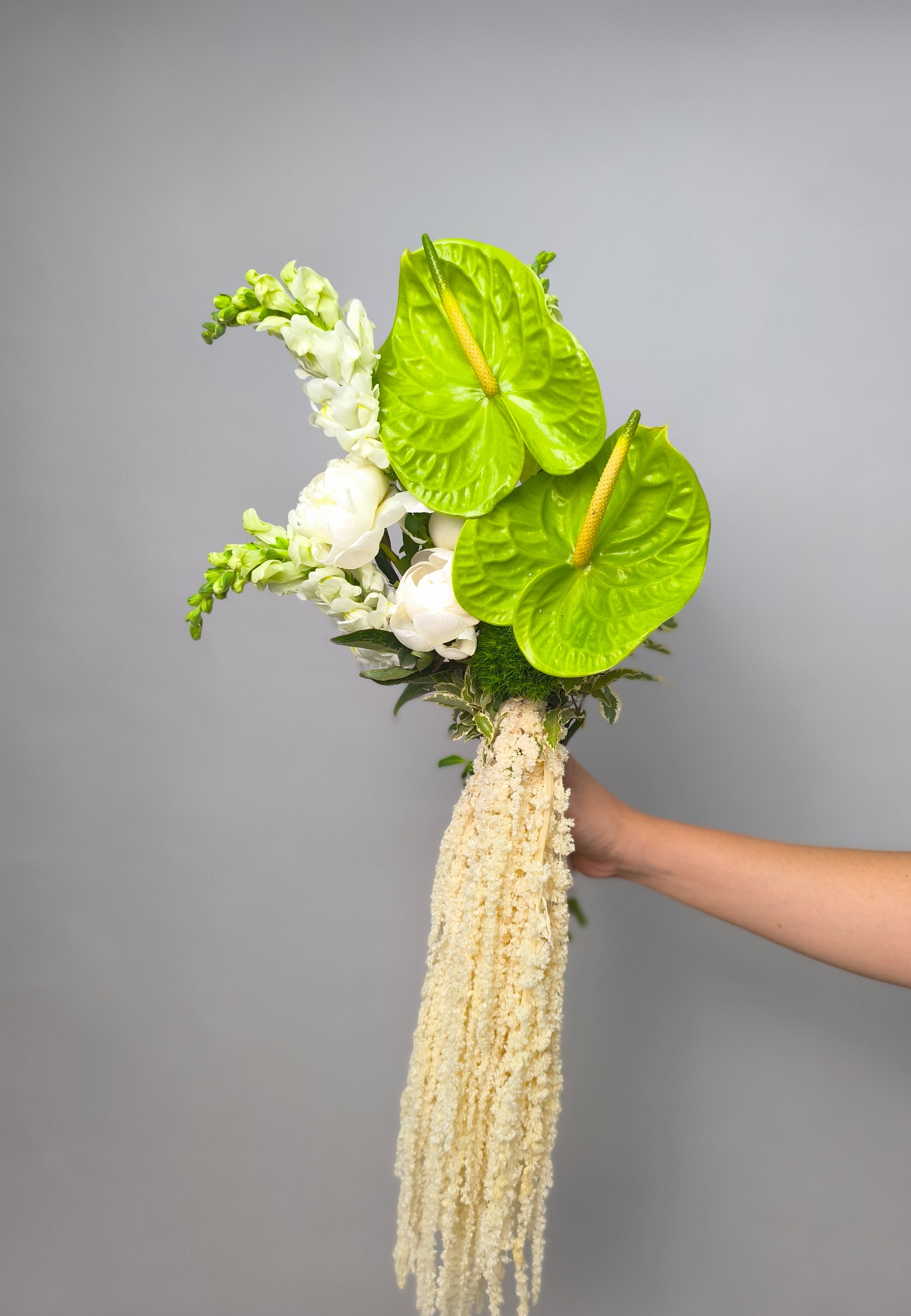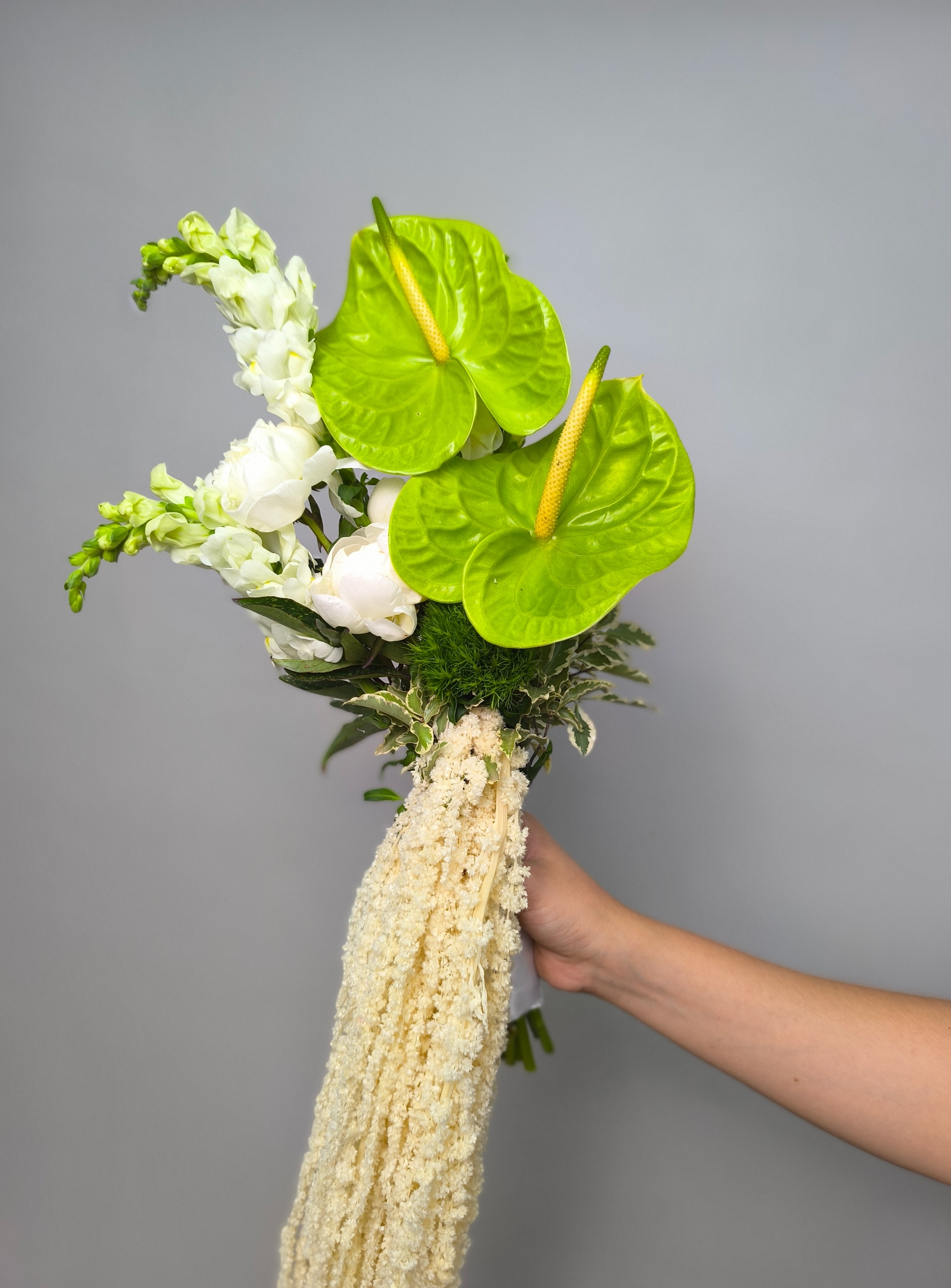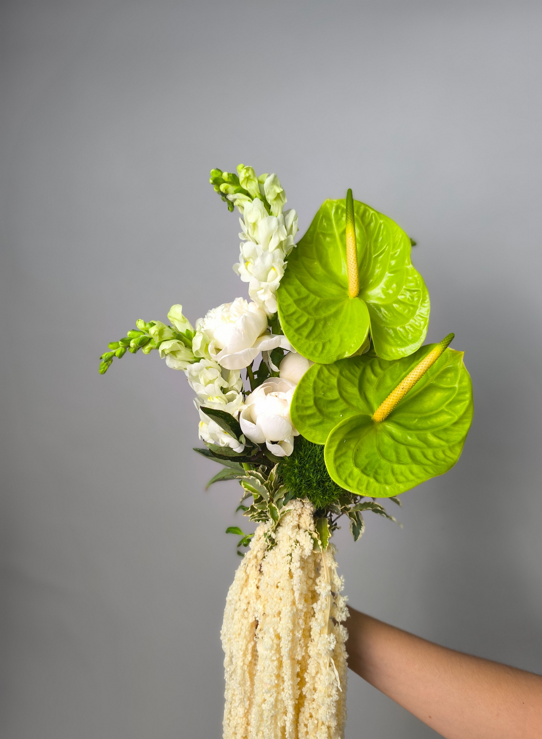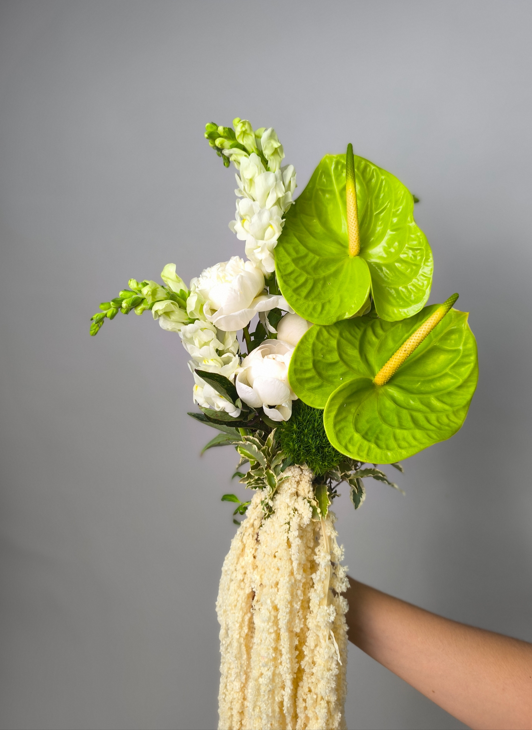 В его основе – нежнейшие пионы, чьи пышные лепестки обещают нежность и трепет. Их дополняют белые веточки антирринума, добавляя букету свежести и лёгкости, словно лесные травы, колышущиеся на ветру. А настоящую изюминку, ту самую нотку волшебства, придаёт свисающий амарант – его струящиеся гроздья напоминают о росе на паутине или диковинных цветах, скрытых в глубине леса. Этот букет – ваша сказка, воплощённая в цвете
