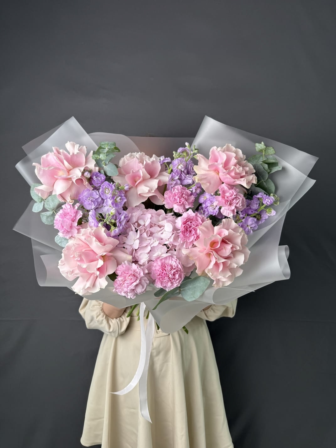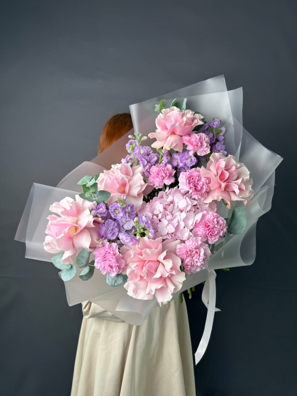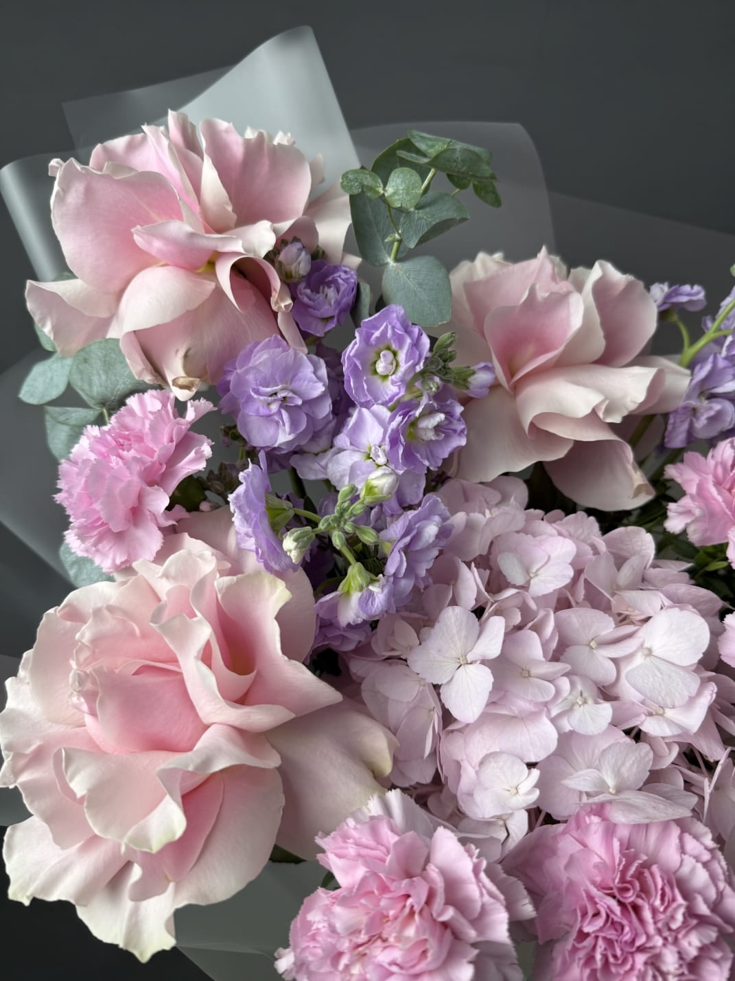 Букет в нежной гамме с французскими розами, гортензией, ароматной маттиолой и стойкими диантусами в стильной упаковке