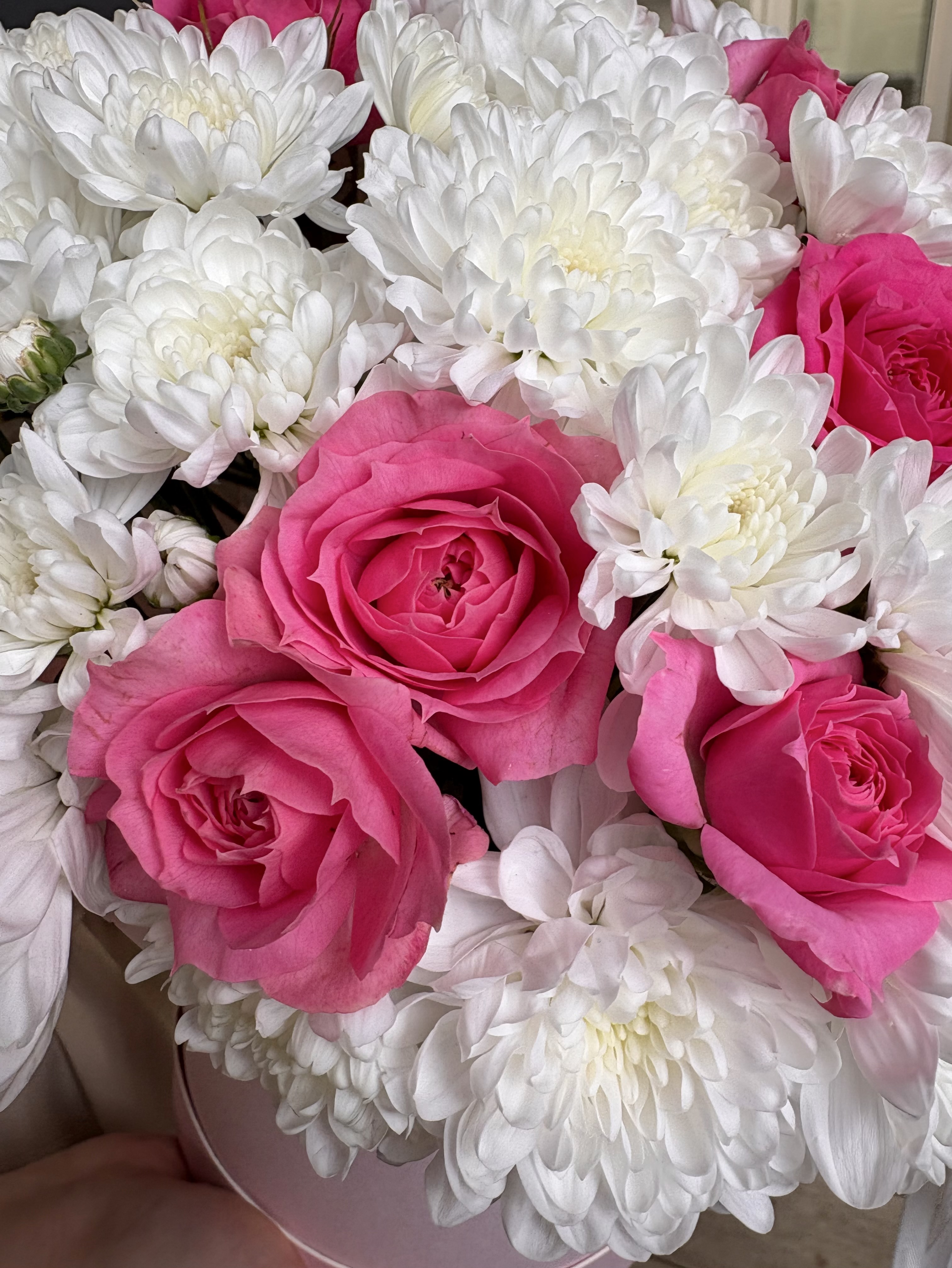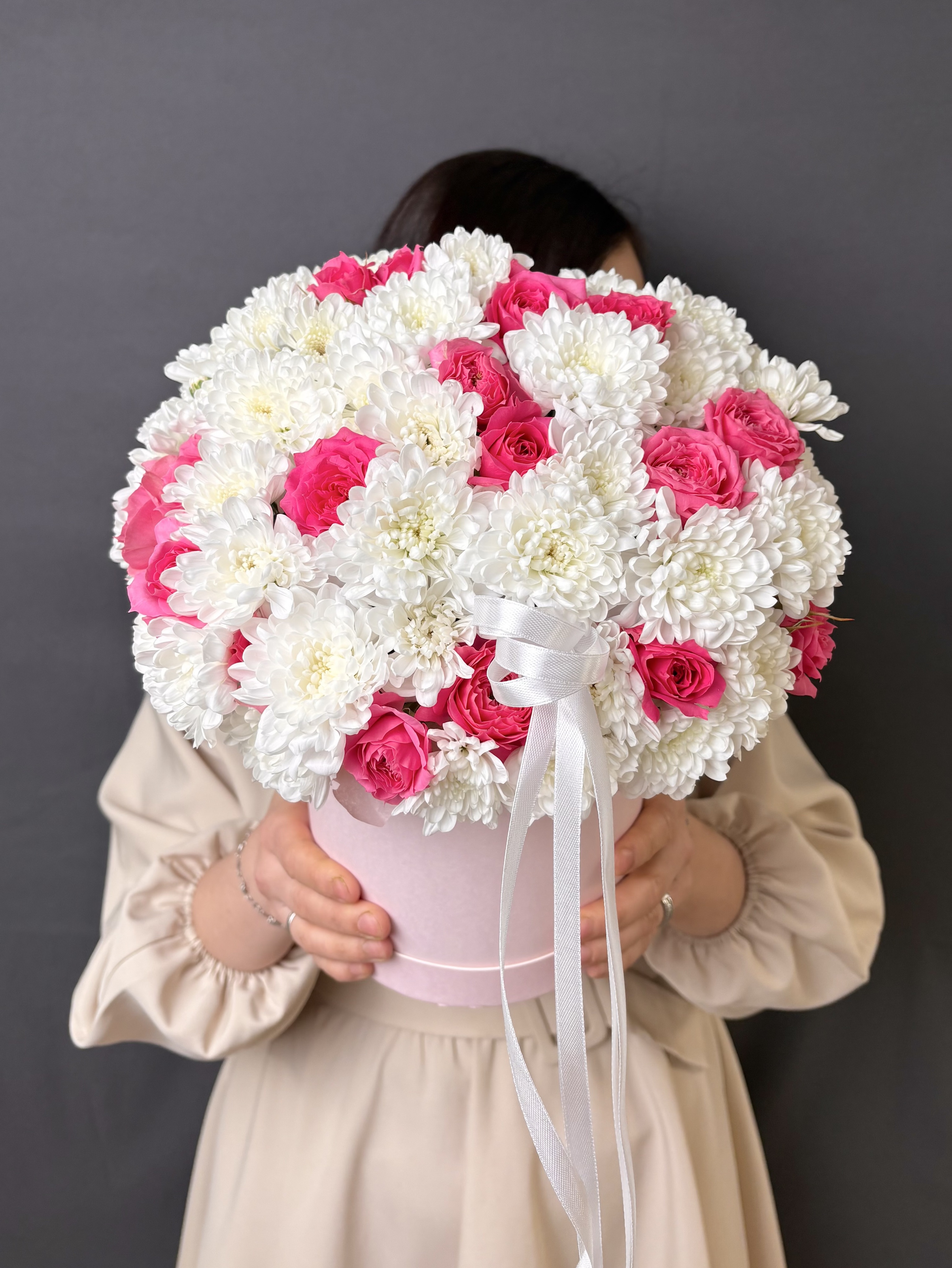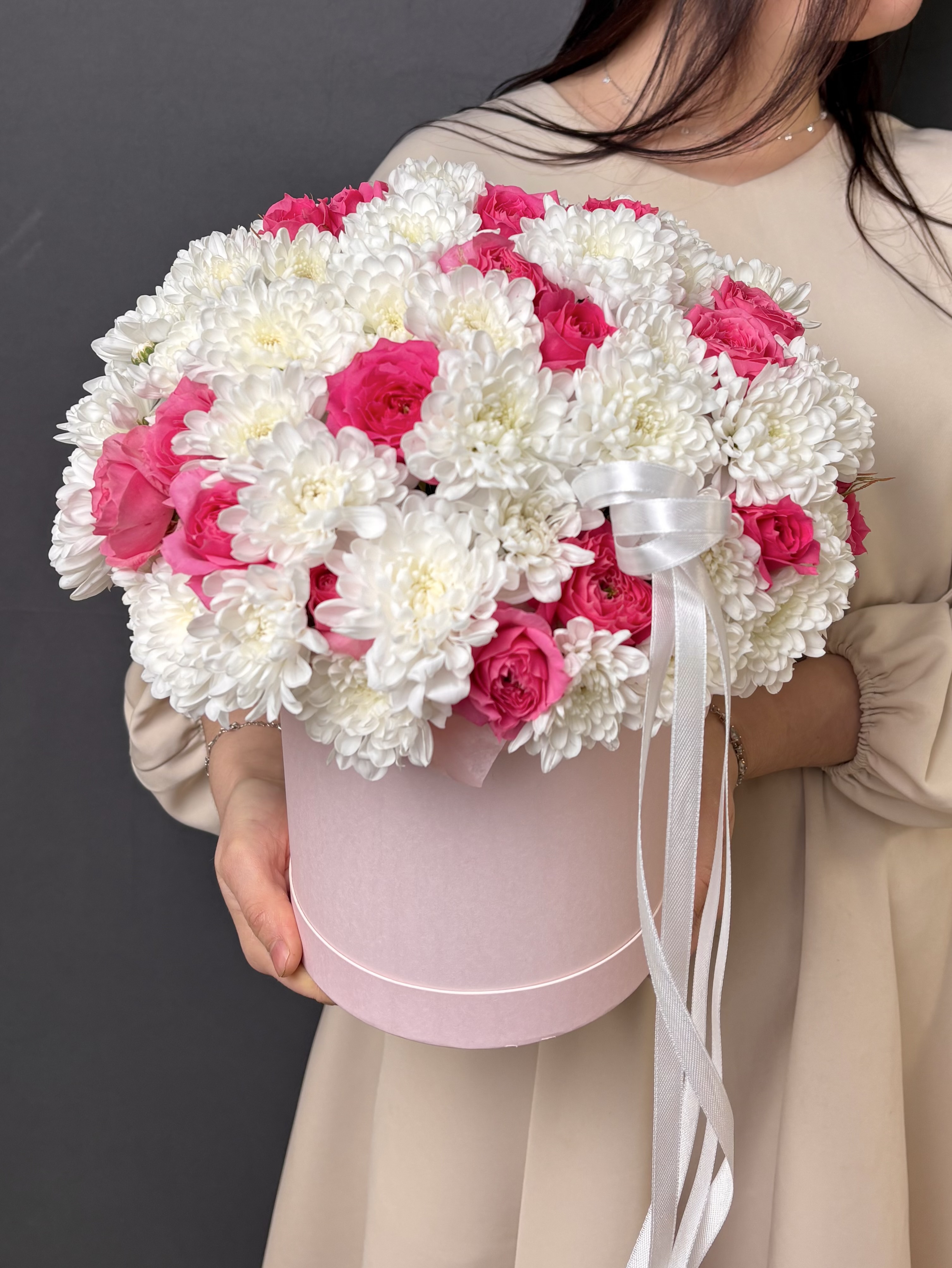 Представьте себе нежное облако из белоснежных кустовых хризантем, словно взбитые сливки, в которое деликатно вплетены пышные, словно спелая клубника, кустовые пионовидные розы. Эта композиция в стильной коробке – настоящее воплощение изысканности и сладости, созданное для того, чтобы подарить вам мгновения истинного наслаждения. "Клубника со сливками" – это не просто цветы, это нежное признание, сладкий комплимент и утонченный вкус, заключенные в элегантную форму.