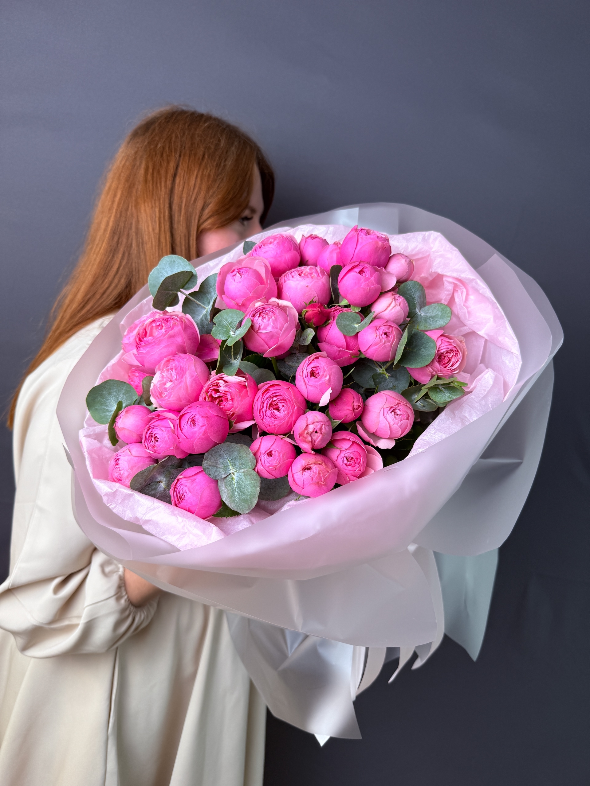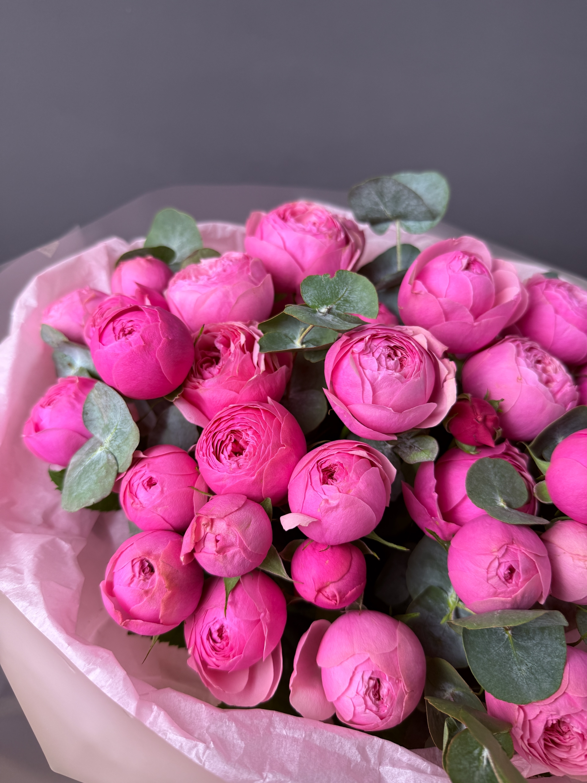 Монобукет кустовых пионовидных роз "Сильва Пинк" из 13 штук с цветочками эвкалипта в стильной упаковке