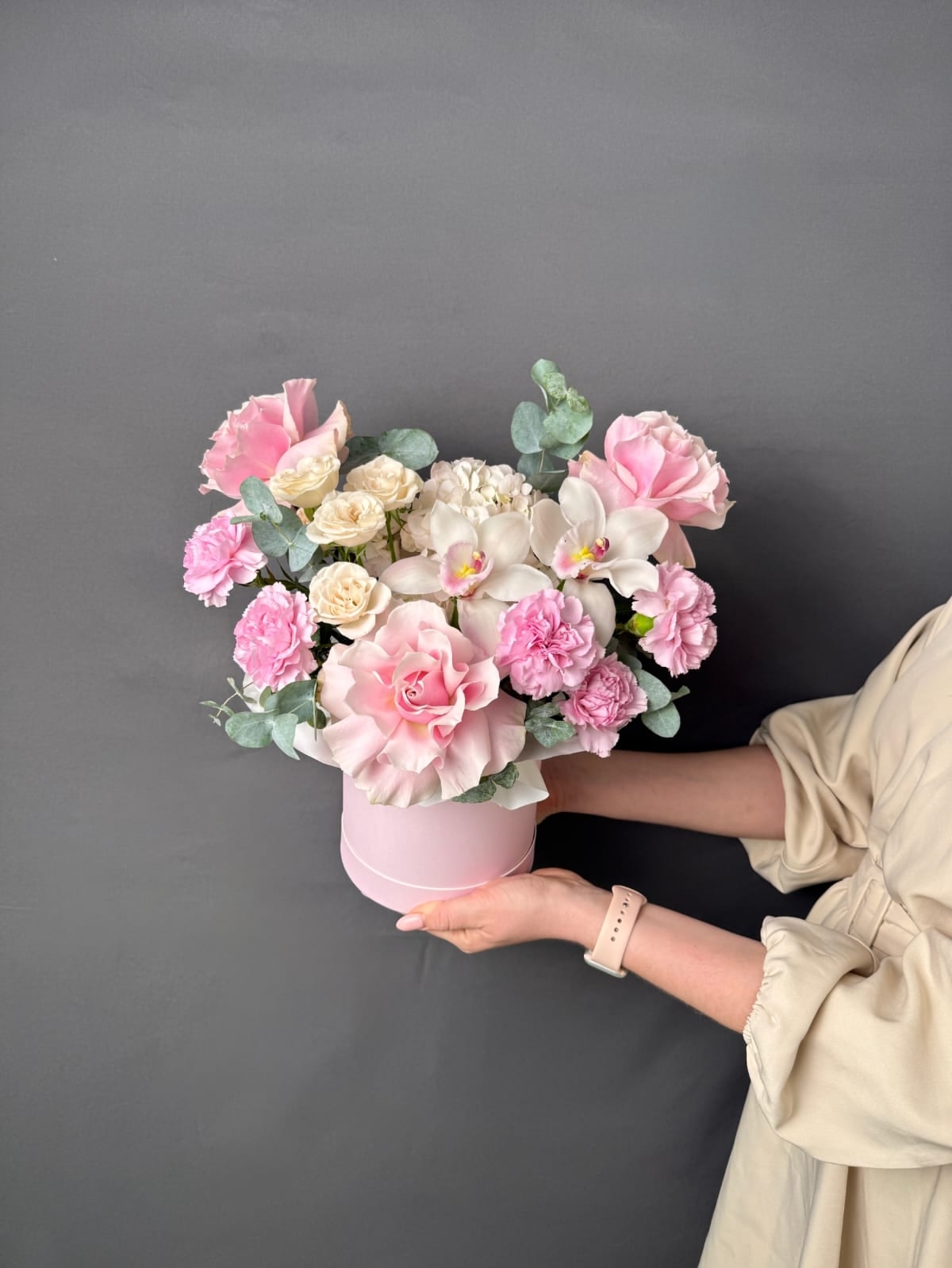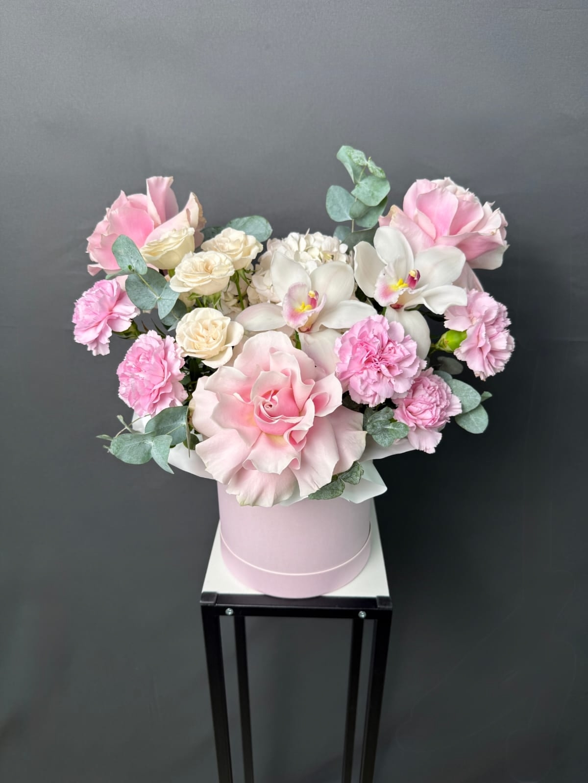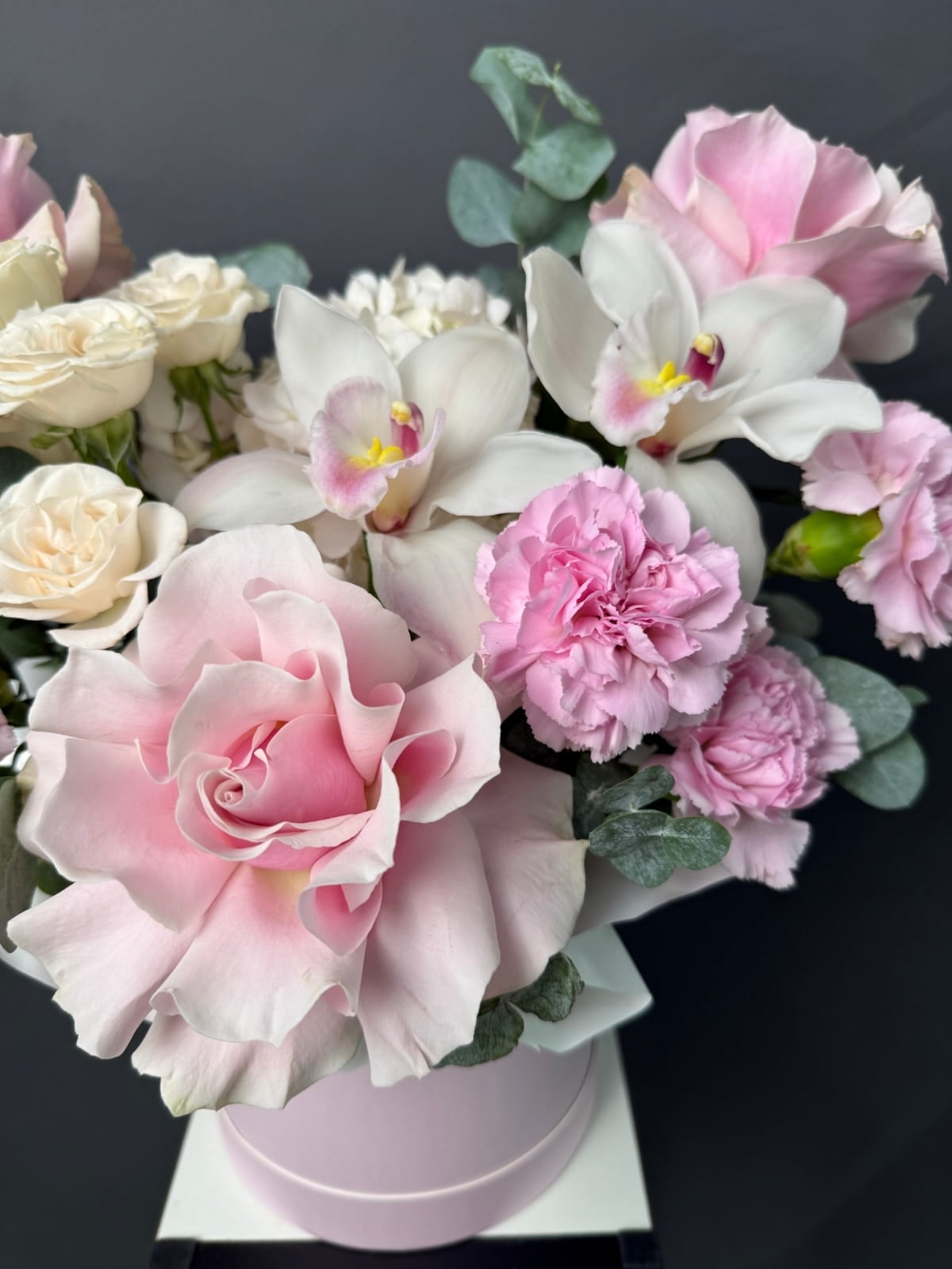 Композиция в нежной гамме с орхидеями, французскими розами, гортензией и стойкими диантусами, разбавленная ветками эвкалипта
