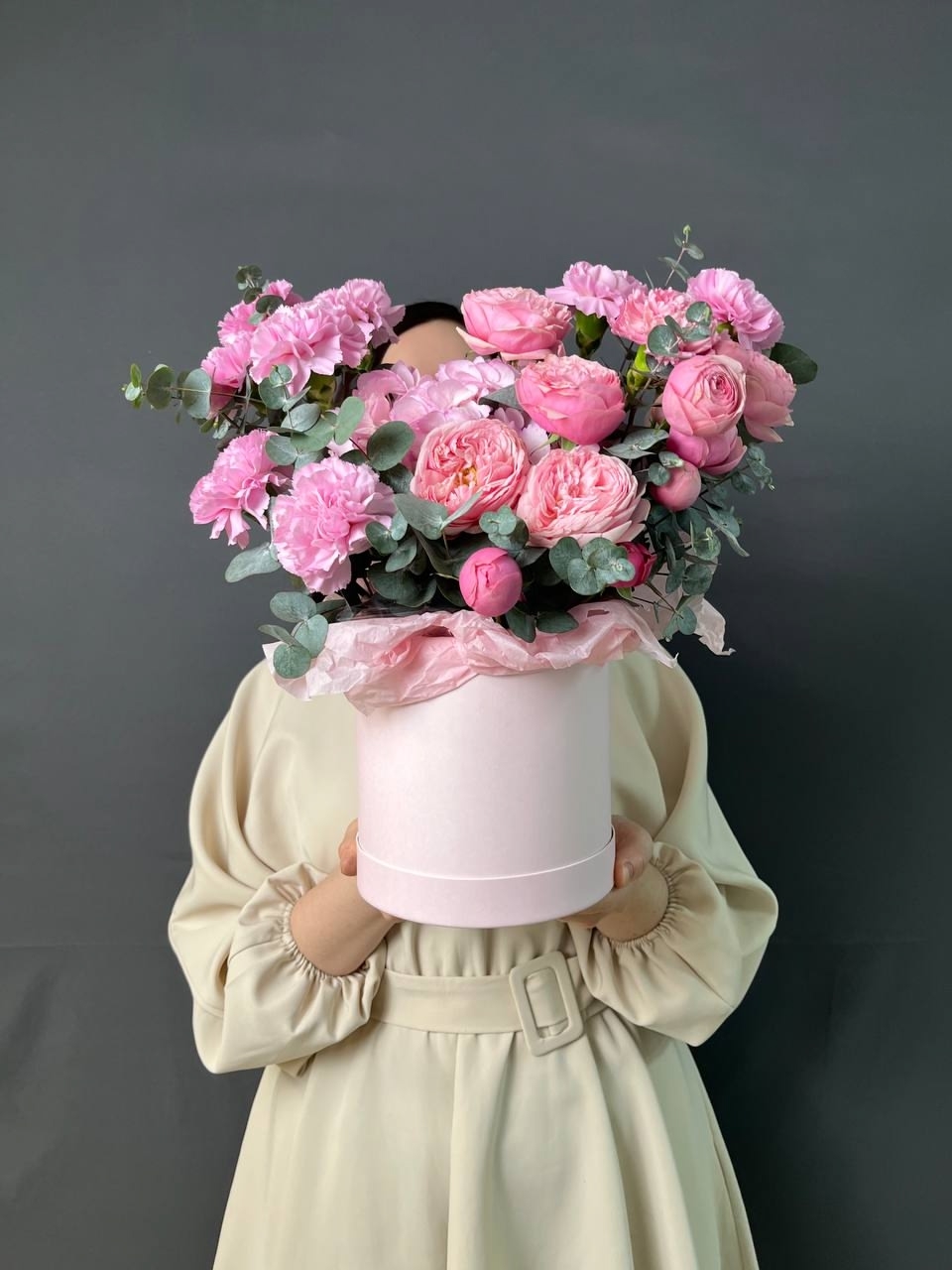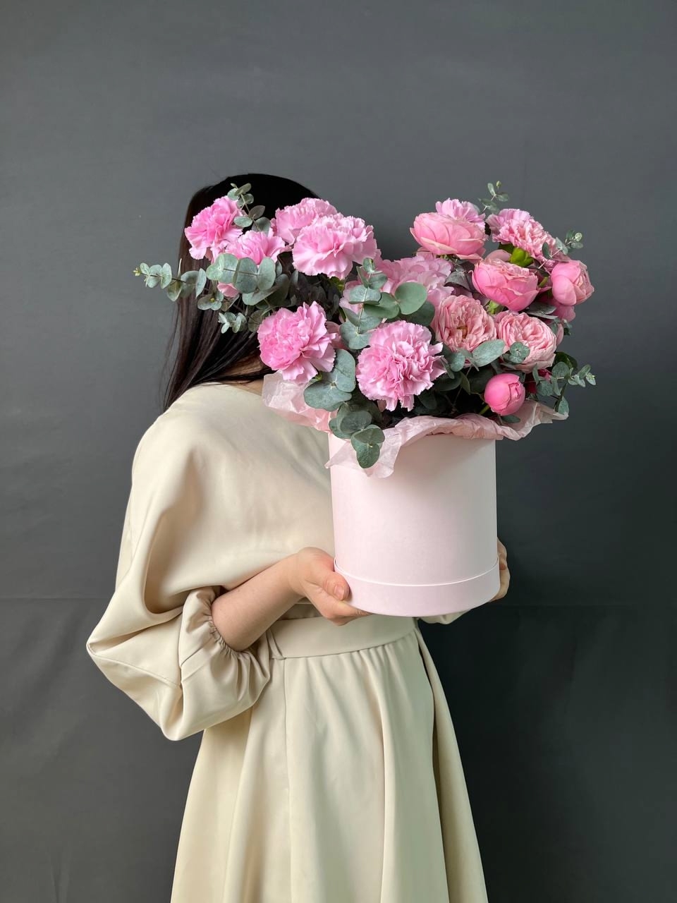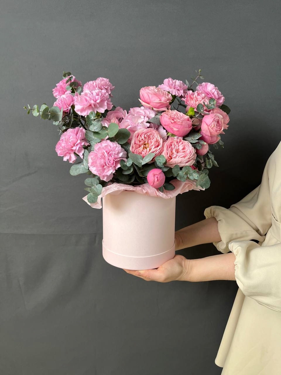 Нежная коробочка с пионовидной розой и стойкими диантусами, разбавленная ветками ароматного эвкалипта