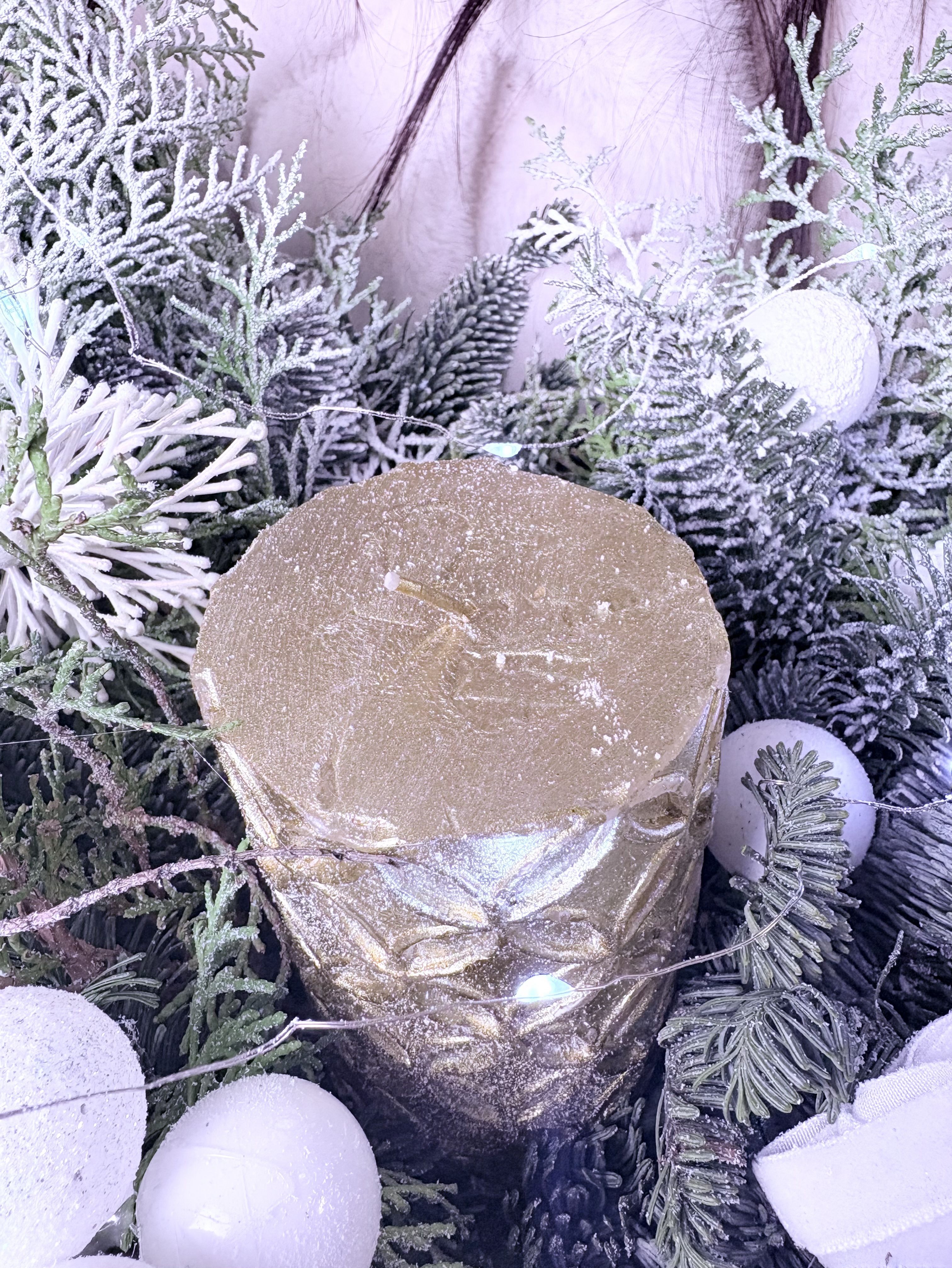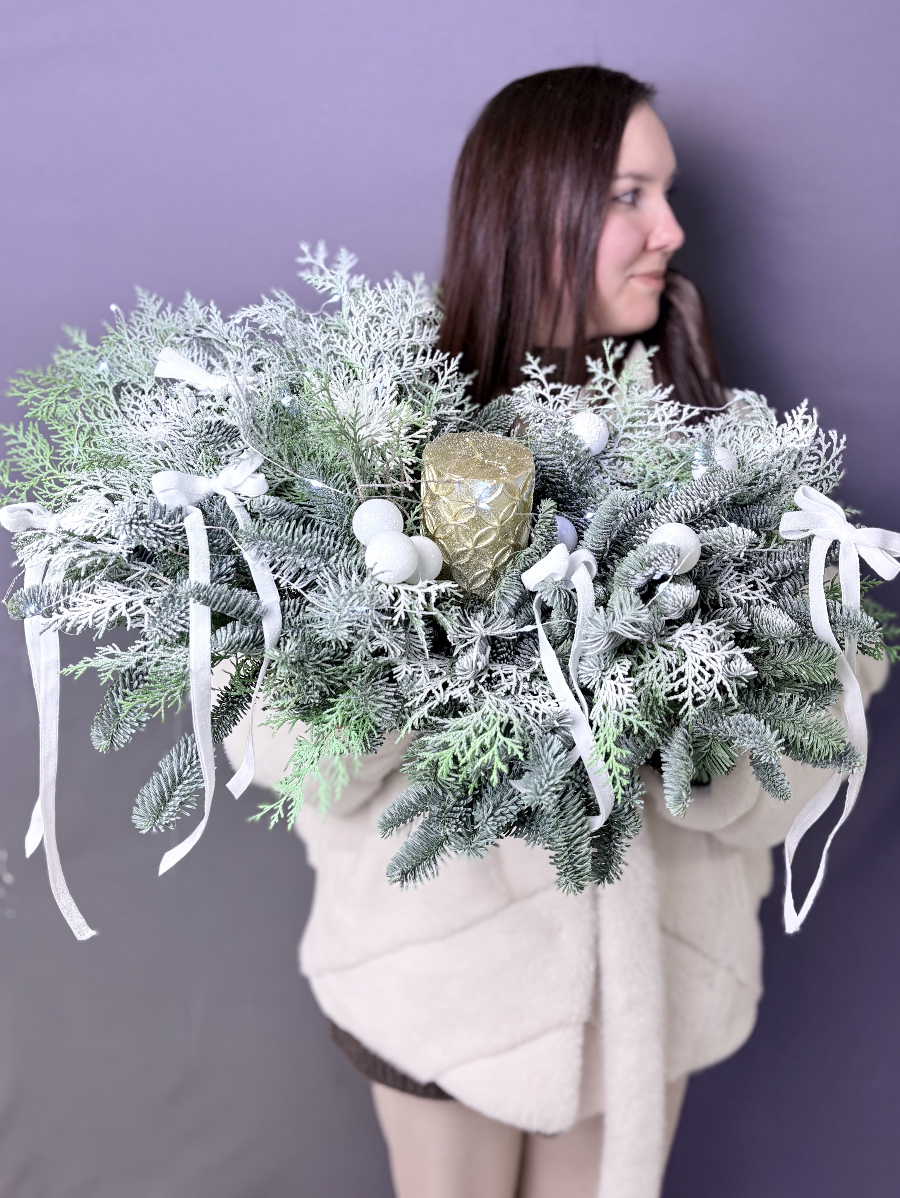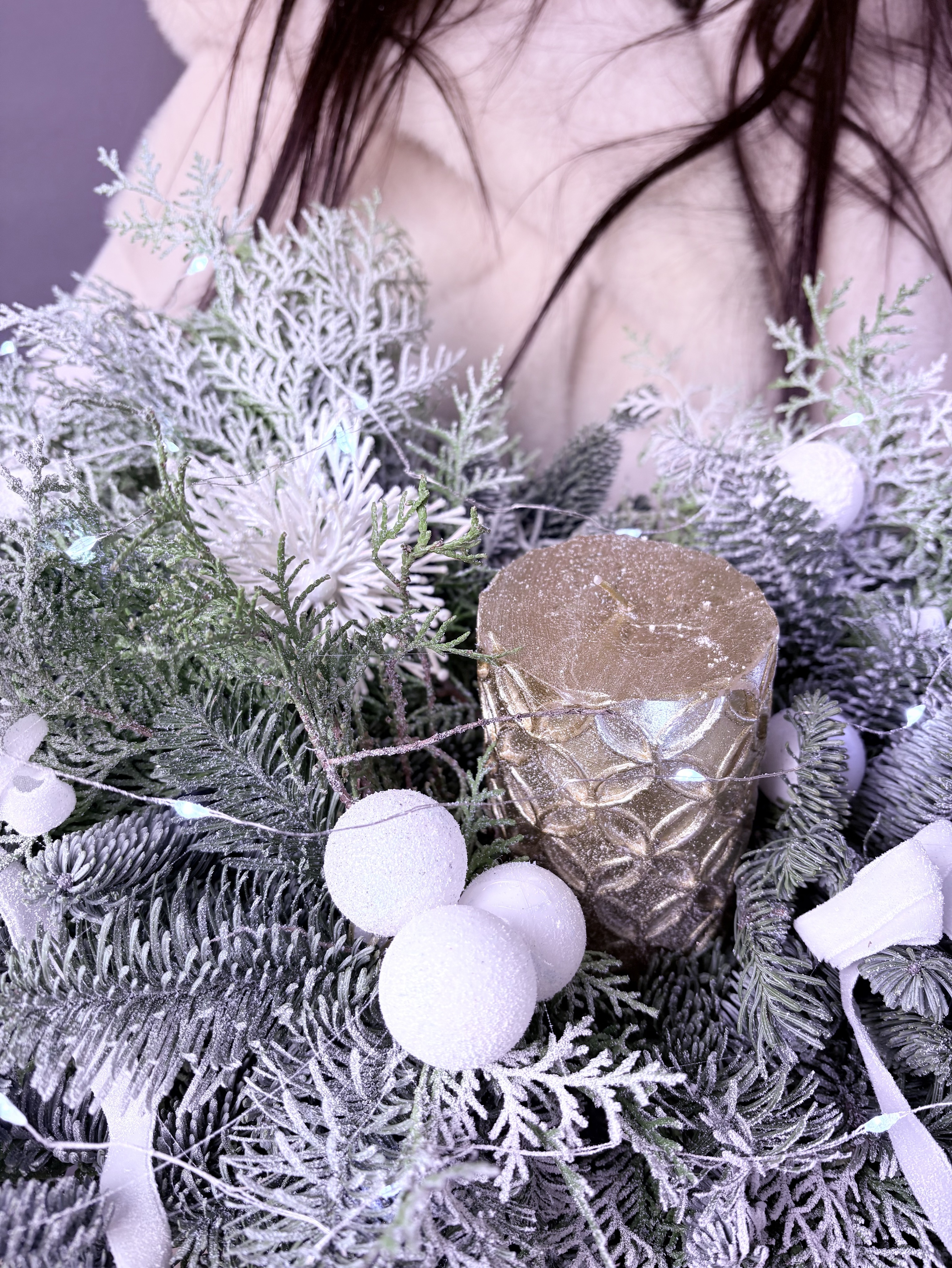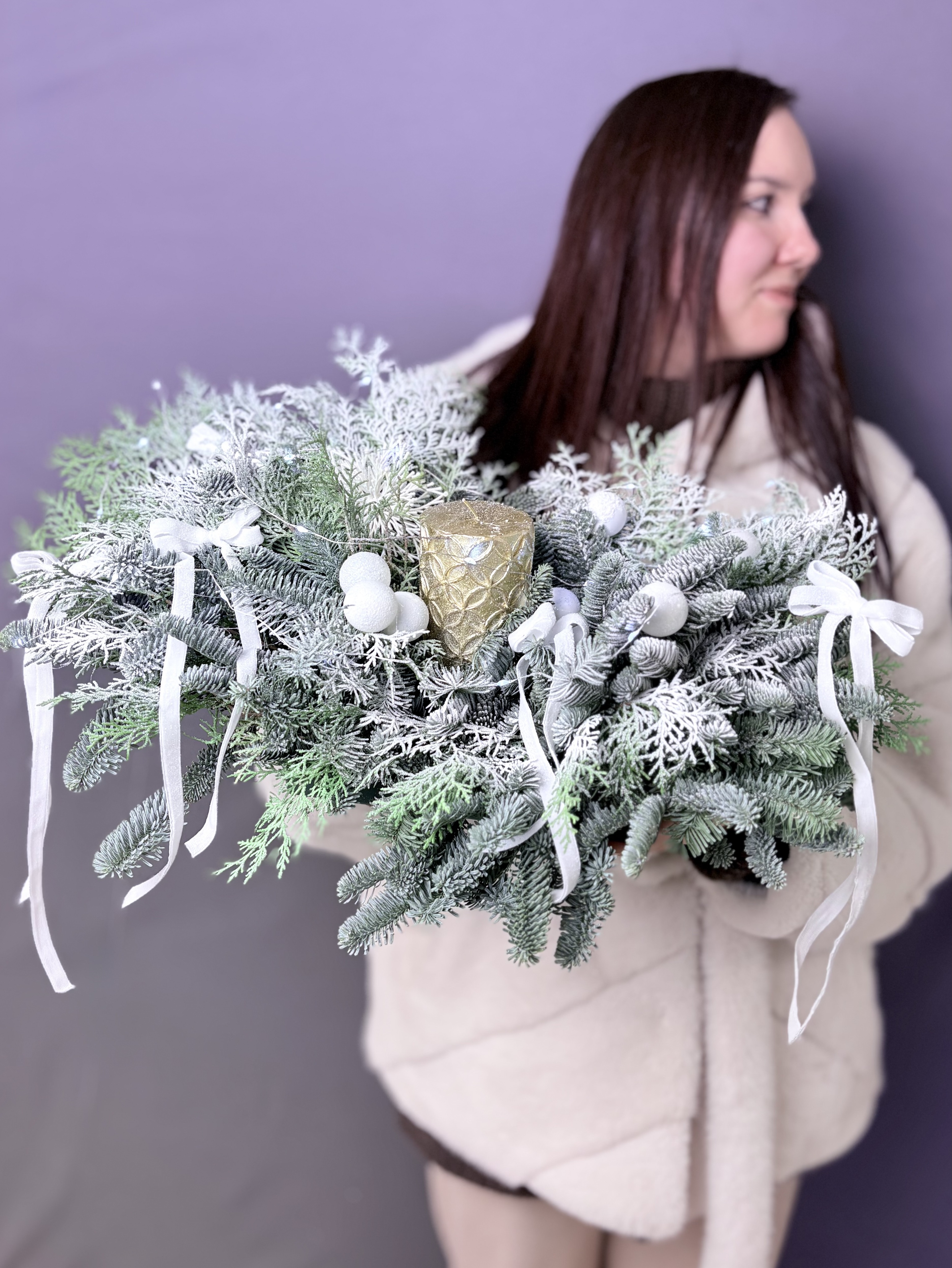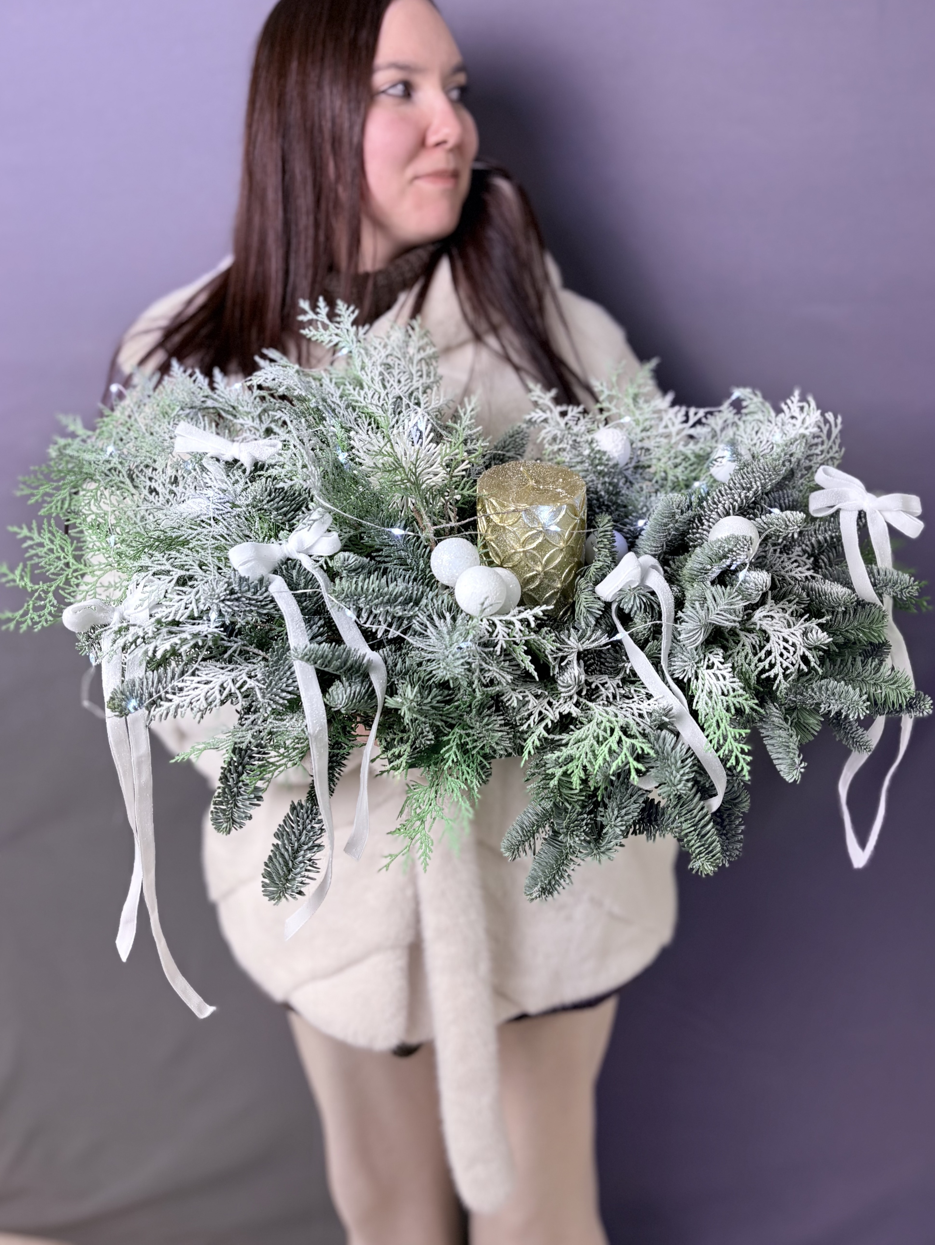 Новогодняя композиция «Снежная Зима» — это настоящее воплощение зимней сказки и праздничного уюта. В центре внимания — изящная золотая свеча, которая мягко мерцает теплым светом, создавая атмосферу волшебства и спокойствия. Вокруг неё расположены белые сверкающие шары, словно покрытые инеем, они переливаются на свету и придают композиции свежесть и лёгкость зимнего утра.