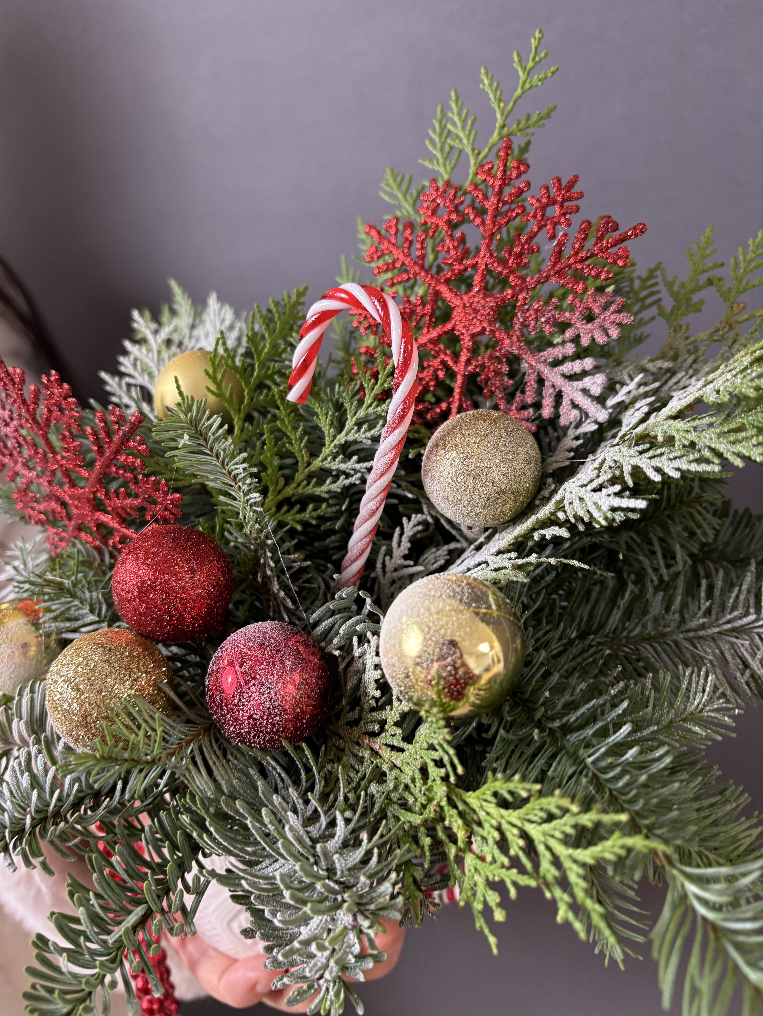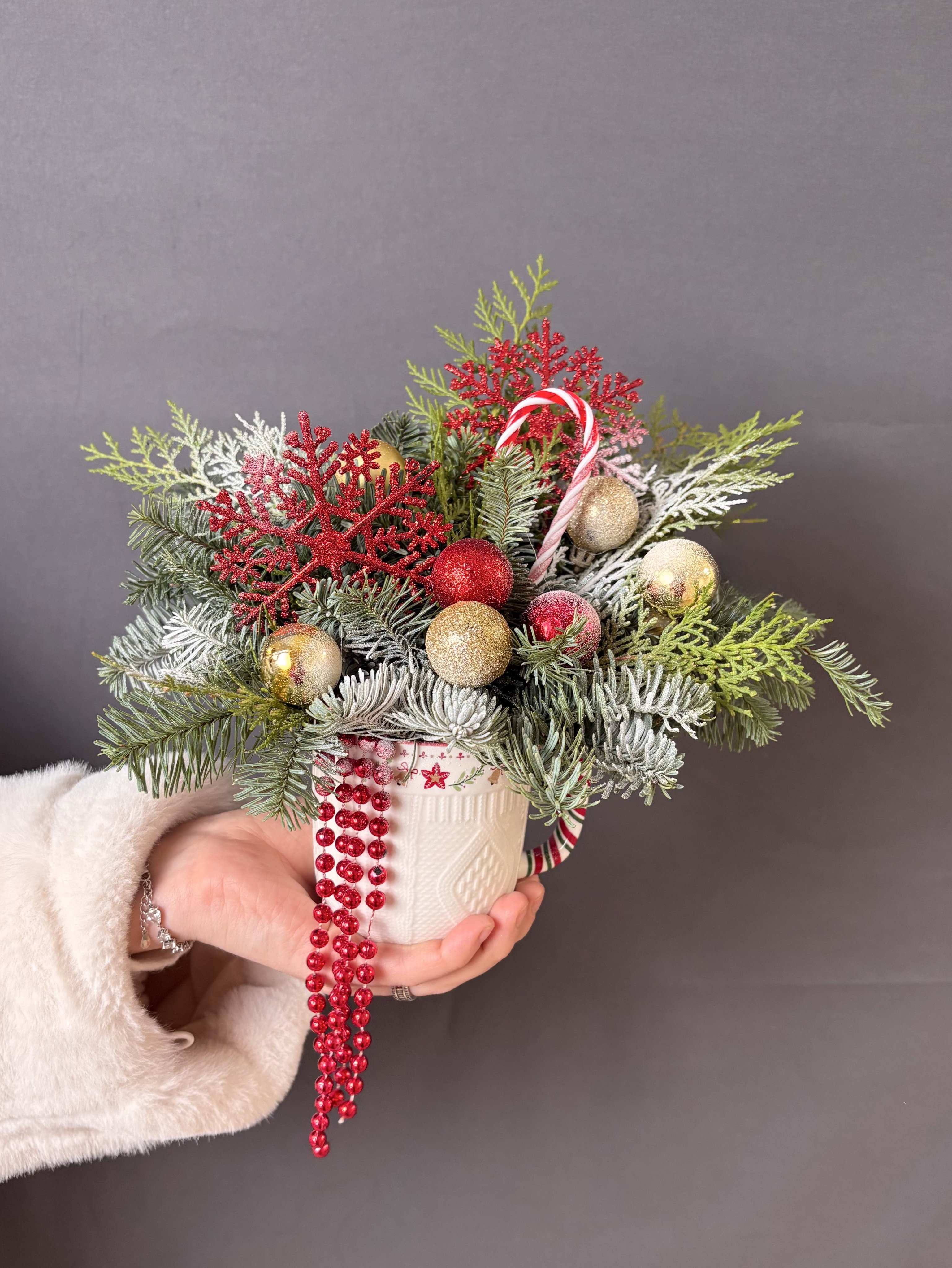 Подарите себе и своим близким частичку новогоднего чуда! Мы создали для вас эту невероятно милую композицию: ароматный нобилис и зеленую тую мы поместили в очаровательную кружку, добавив ей праздничного настроения. Декоративные снежинки, словно только что упавшие с неба, сладкий леденец, напоминающий о детстве, и сияющие елочные шары с блестящими бусами создают атмосферу настоящего праздника. Пусть этот маленький шедевр принесет в ваш дом тепло и радость!