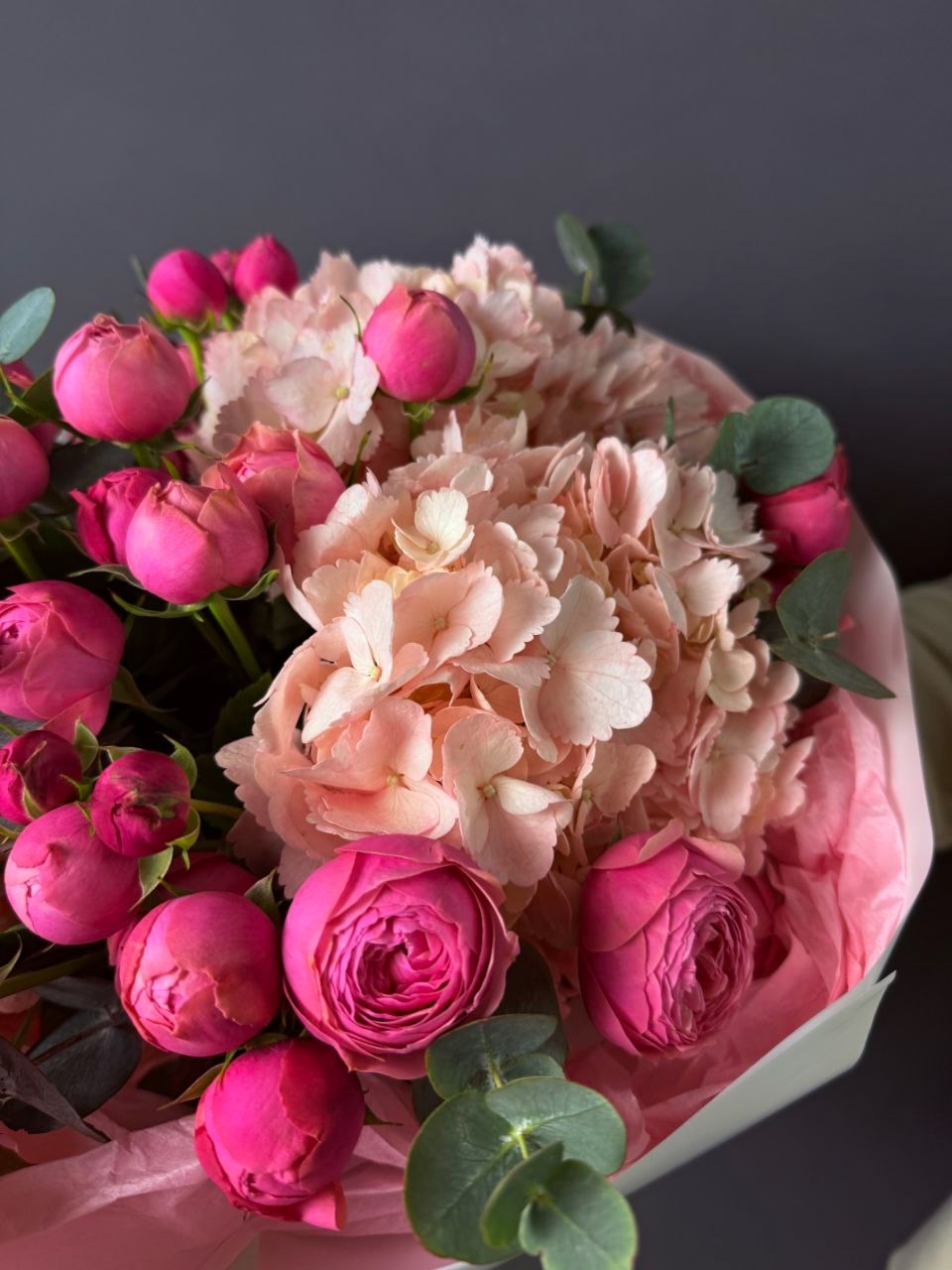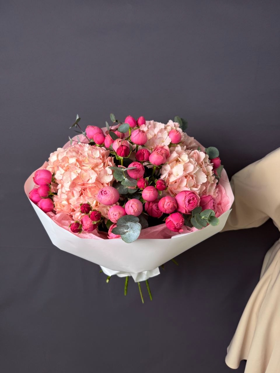 Авторский букет «Аромат цветов» – это нежное сочетание пышных кустовых пионовидных роз и воздушных гортензий. Идеальный выбор для тех, кто ценит изысканность и утонченность.