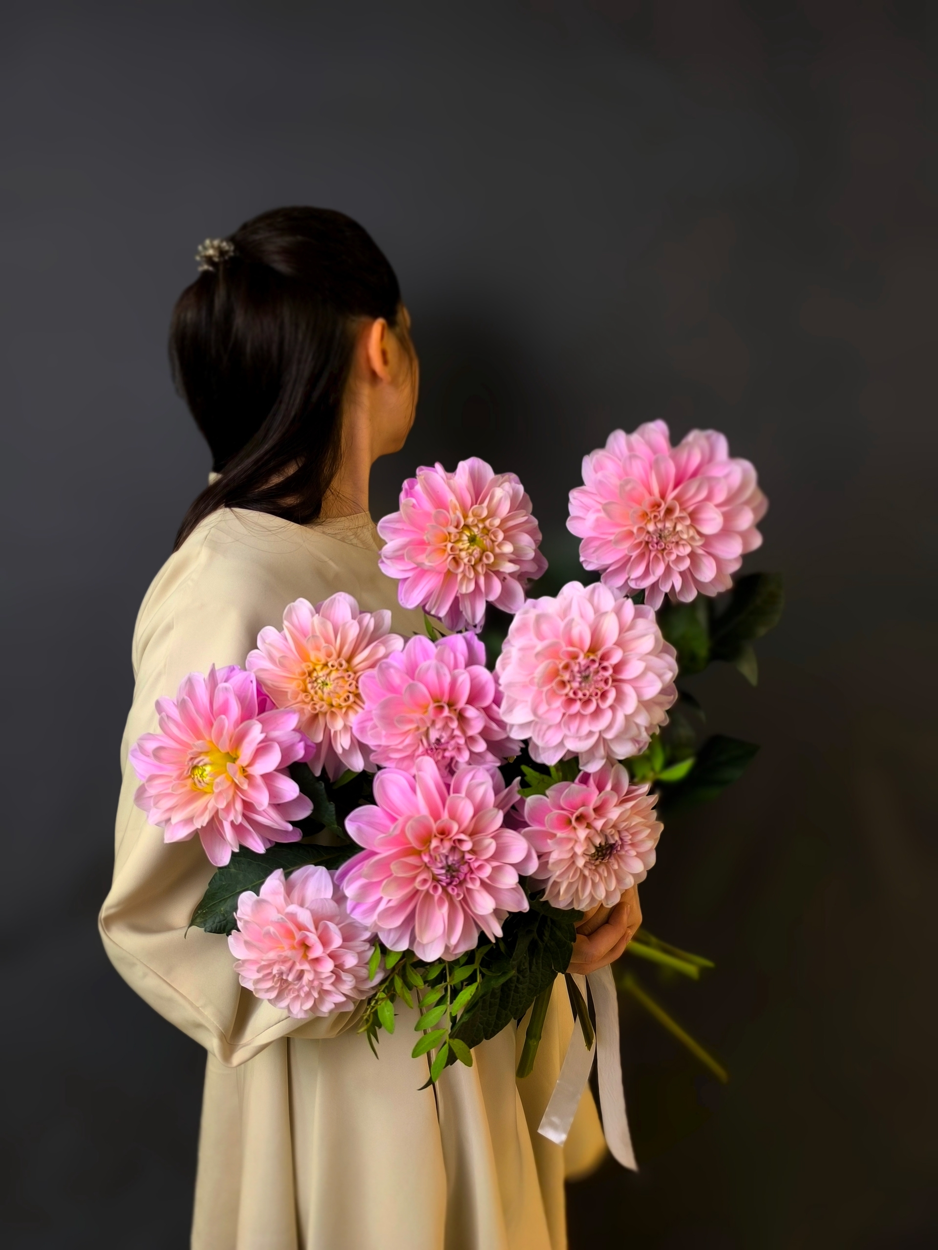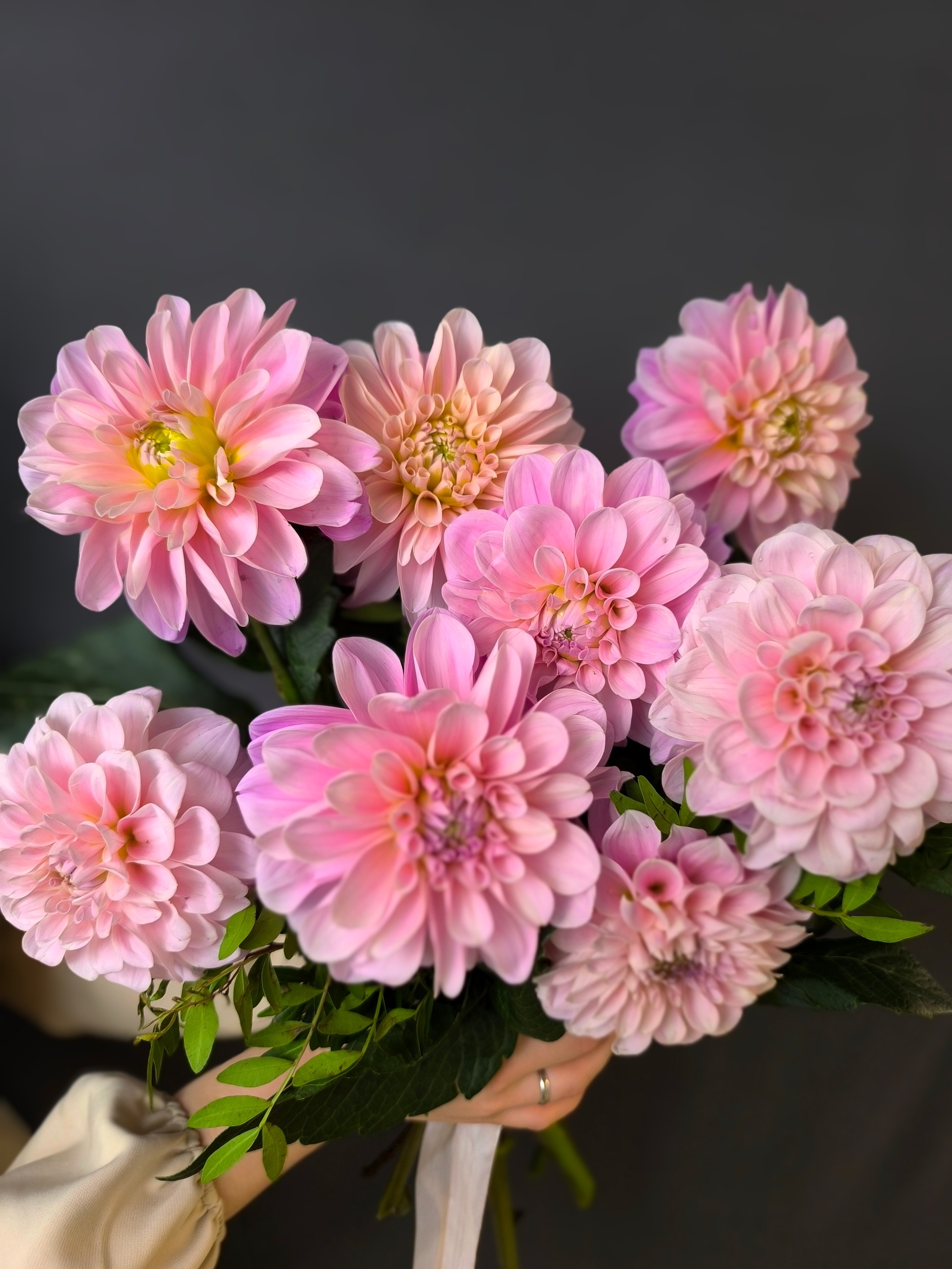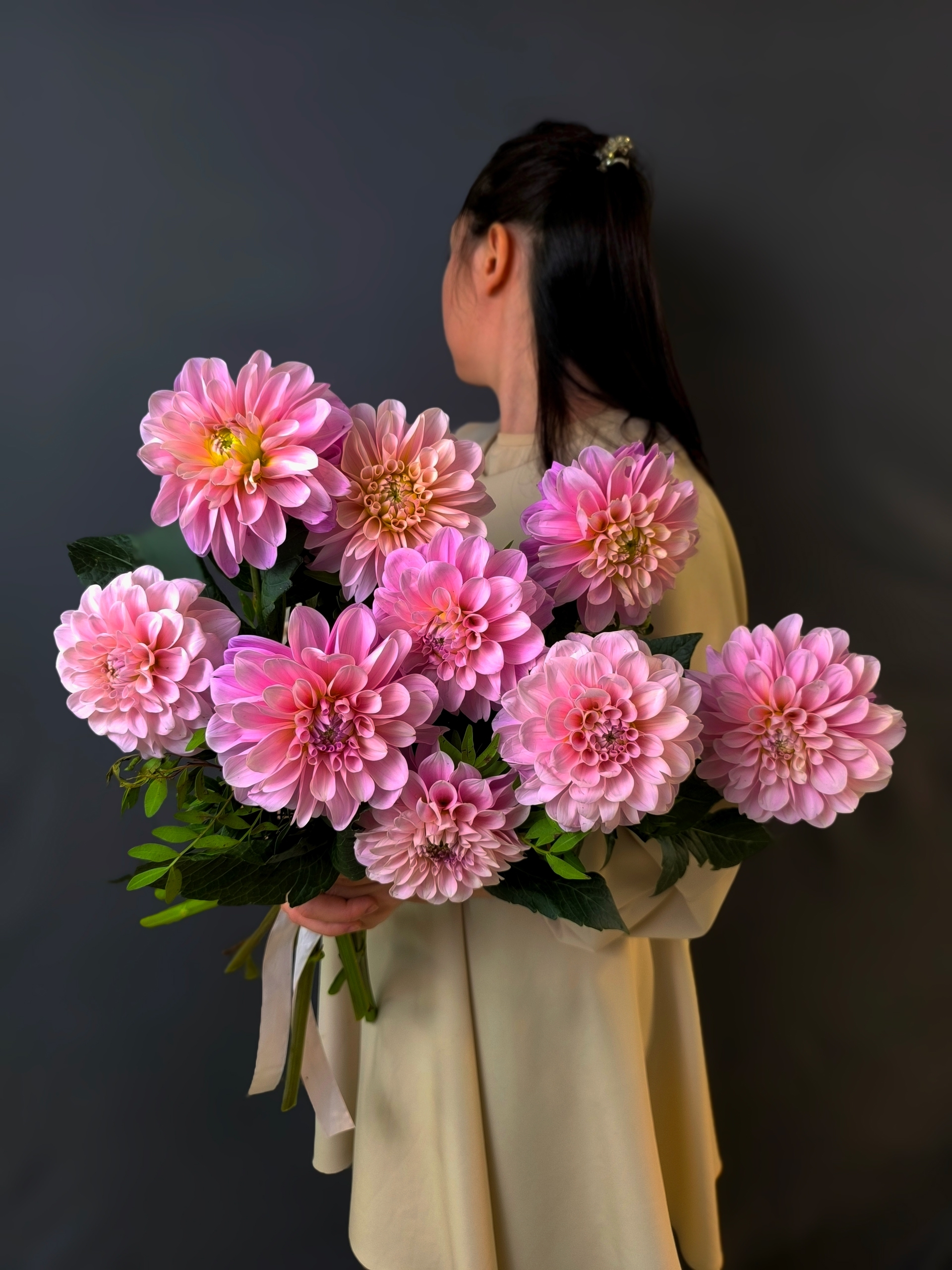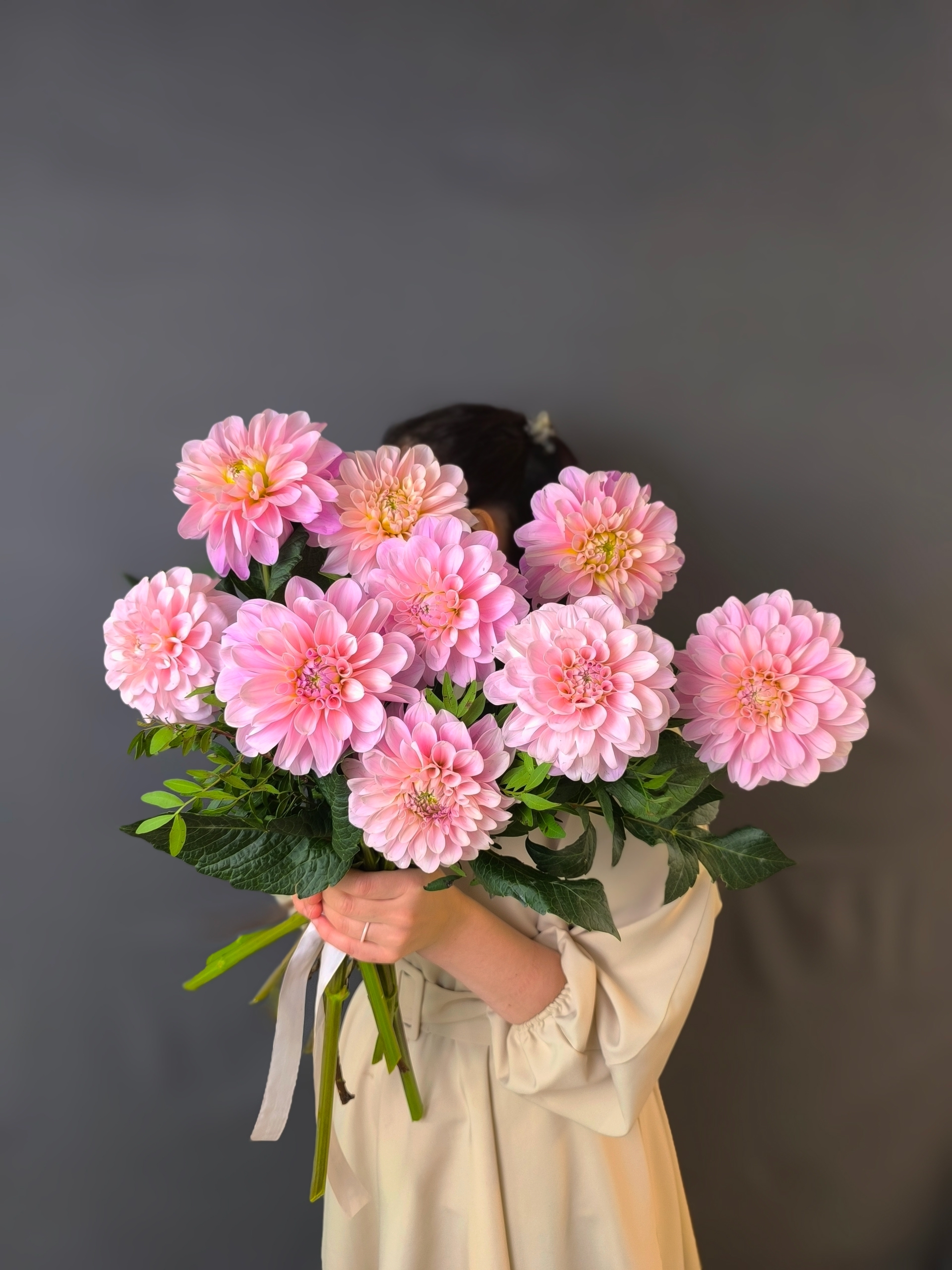 Объёмный букет из 9 розовых георгинов