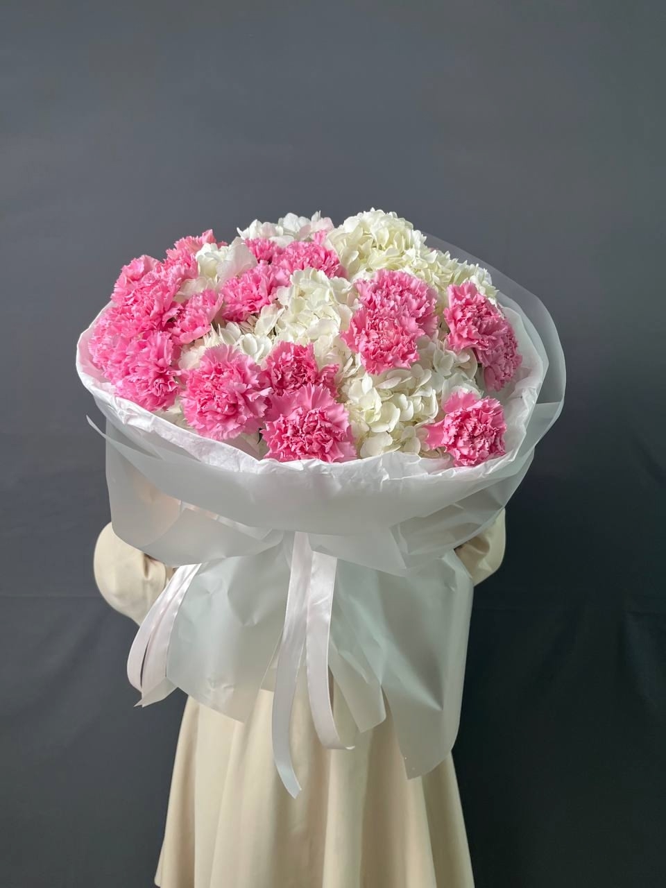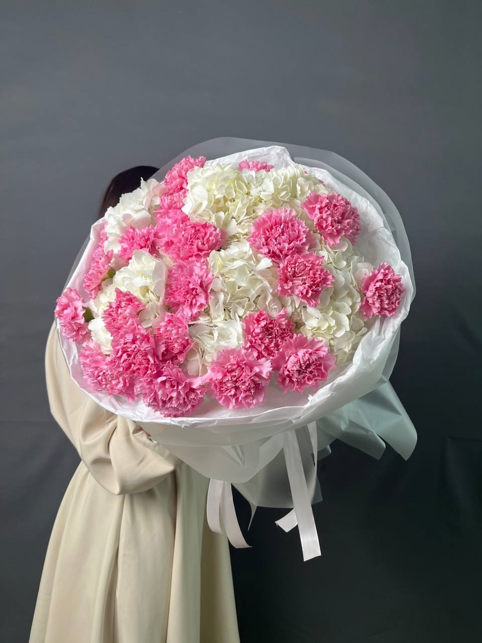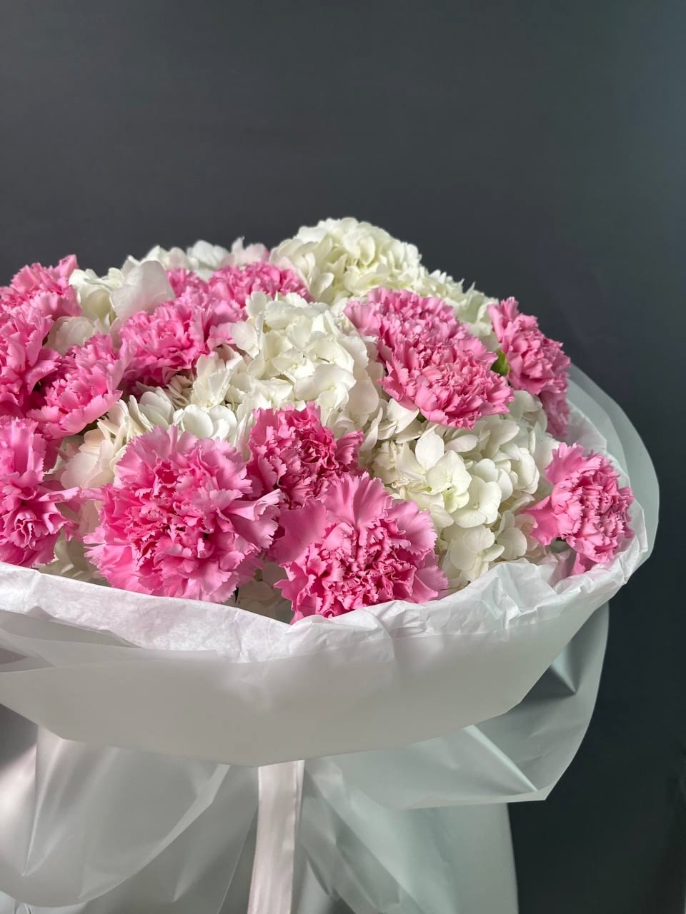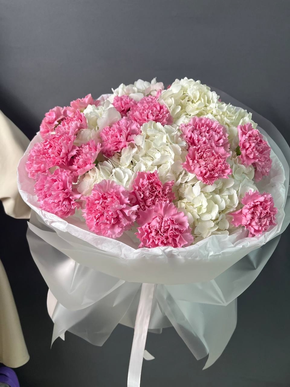 Авторский объемный букет "Розовый сапфир" — это настоящее произведение искусства, созданное для тех, кто ценит красоту и элегантность. В его основе лежат нежные белые гортензии, символизирующие чистоту и гармонию, которые великолепно дополняются яркими розовыми диантусами, придающими композиции живость и очарование.