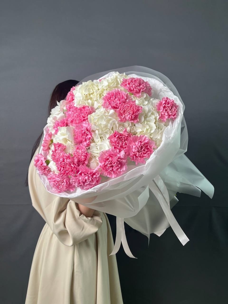 Воздушный букет с объёмными гортензиями и нежными диаетусами в стильной упаковке😍 Состав: Дианиусы - 21 шт Гортензия - 6 шт Стильная упаковка