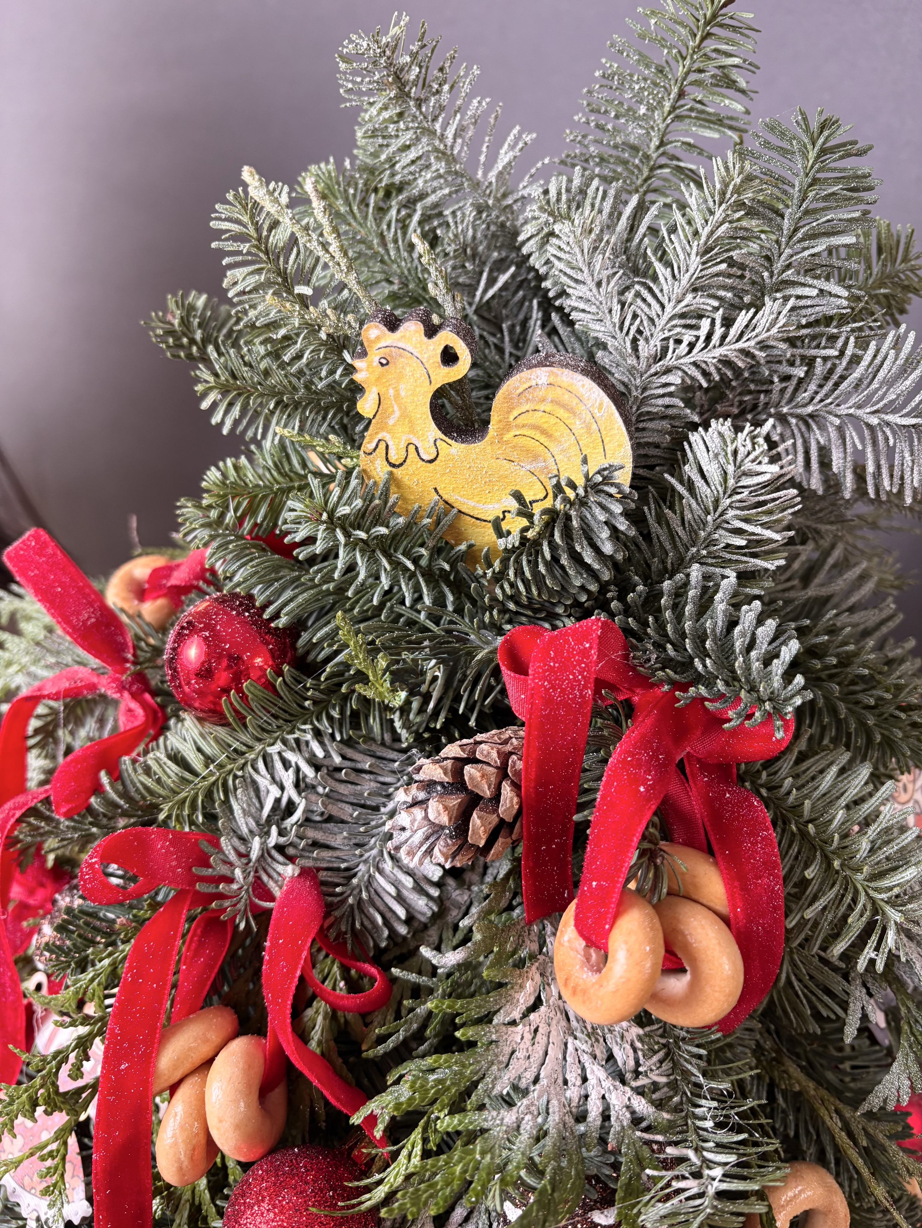Хотите добавить в свой дом частичку настоящего русского праздника? Наша авторская живая ёлочка "Славянский базар" – именно то, что вам нужно! Она искусно украшена в традиционном русском стиле: сверкающие красные шары, уникальные игрушки, вдохновленные фестивалем "Славянский базар", декоративные, натуральные шишки и ароматные русские баранки создают неповторимую атмосферу уюта и волшебства. Эта ёлочка не просто украшение, а настоящий символ новогоднего настроения!